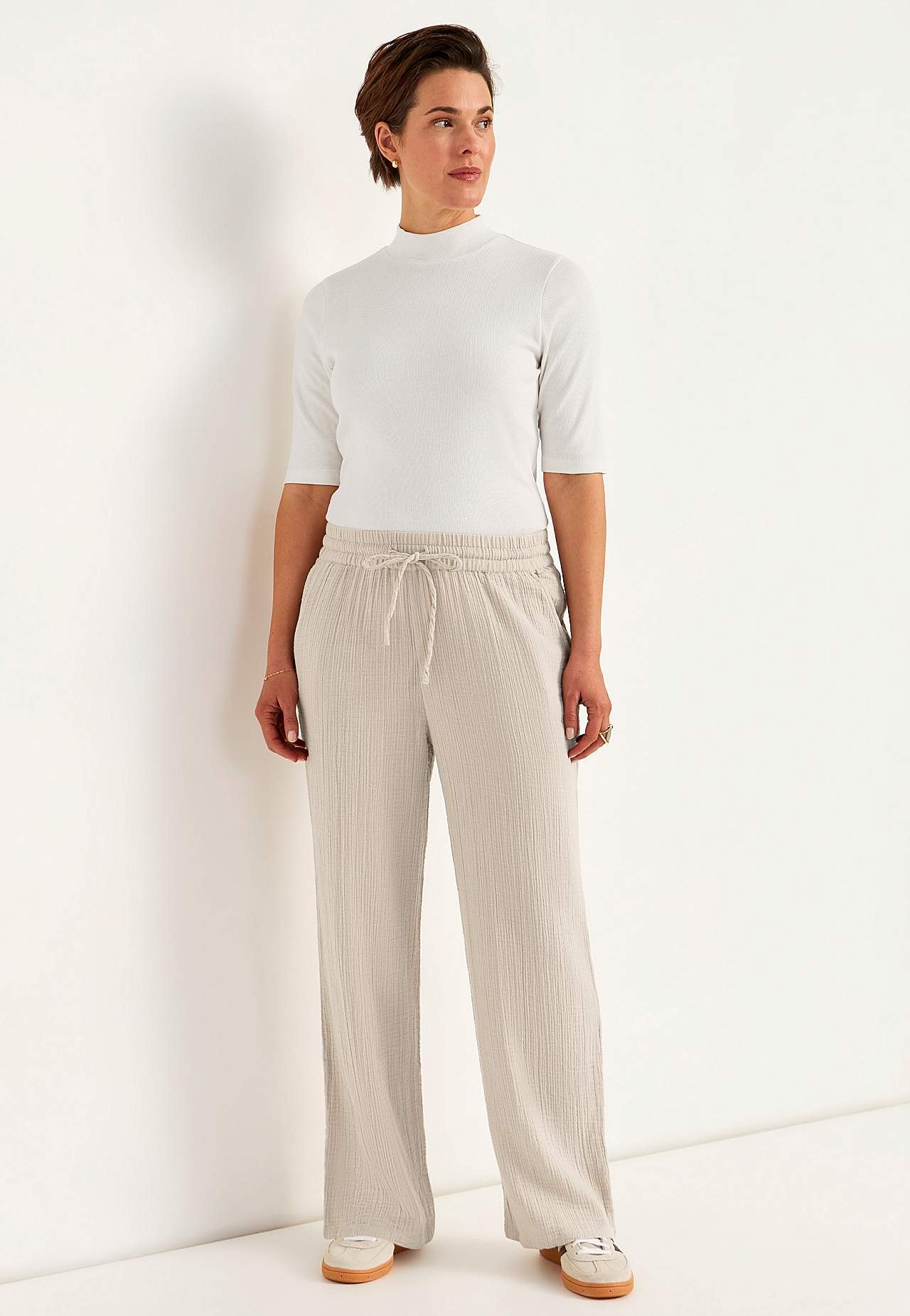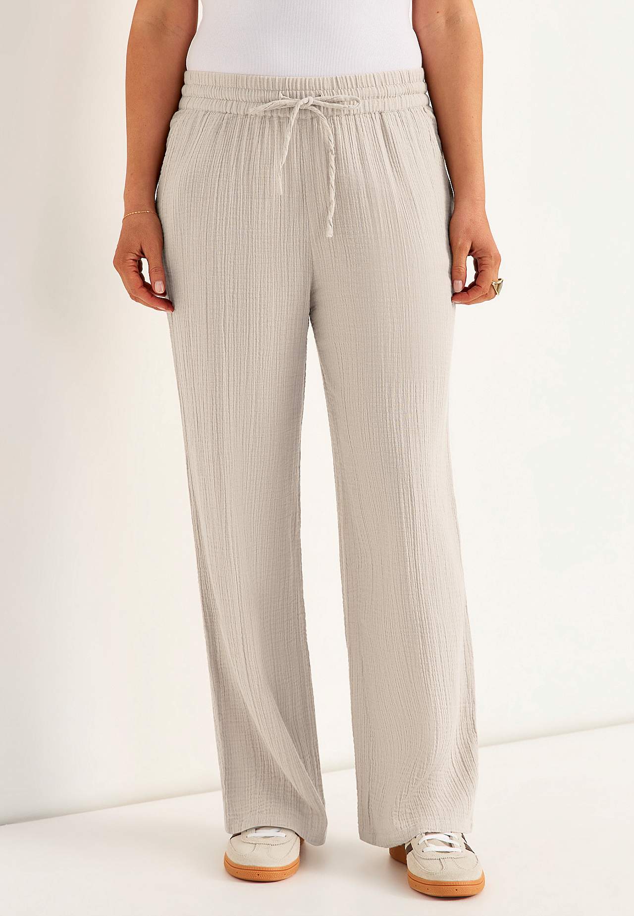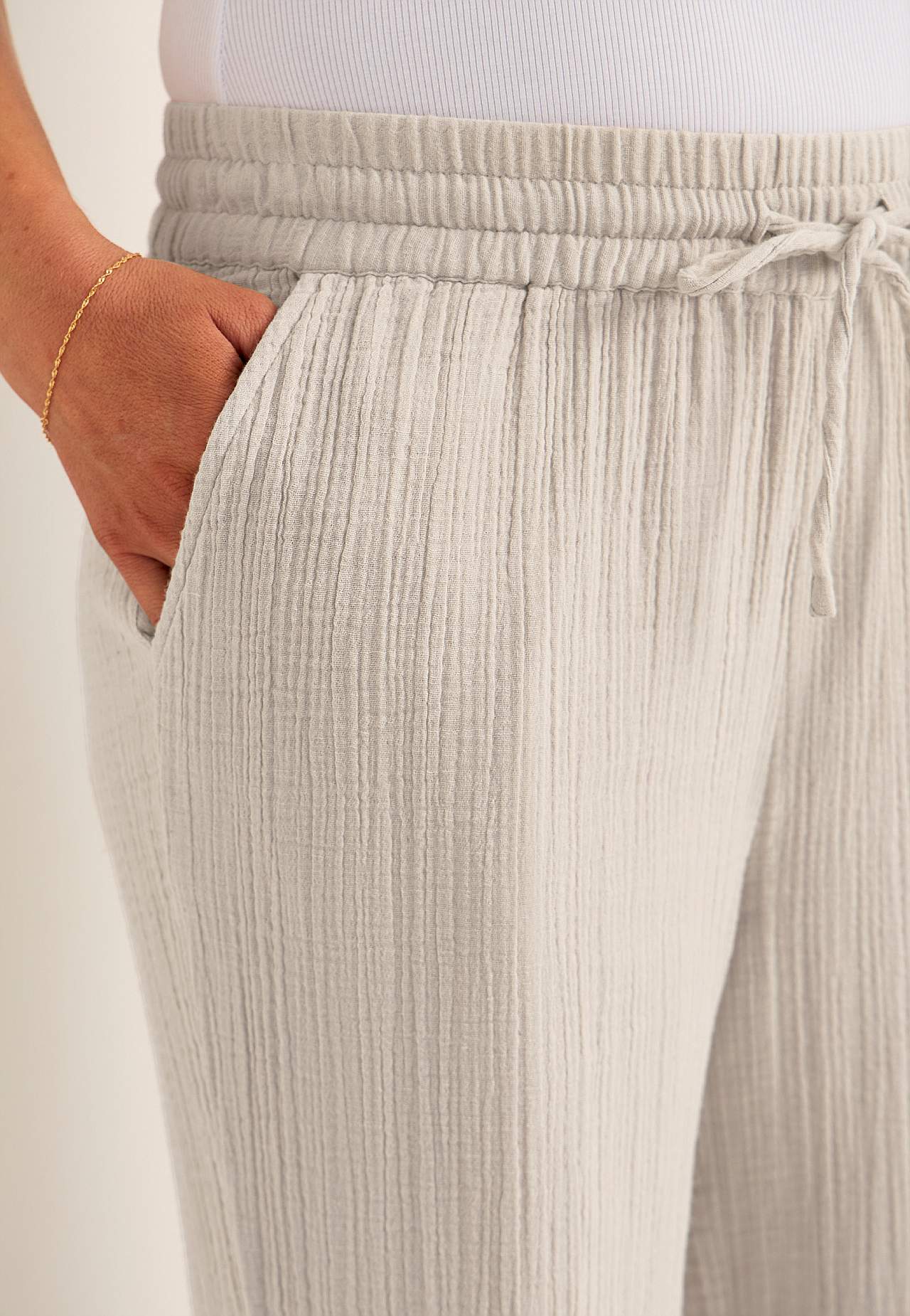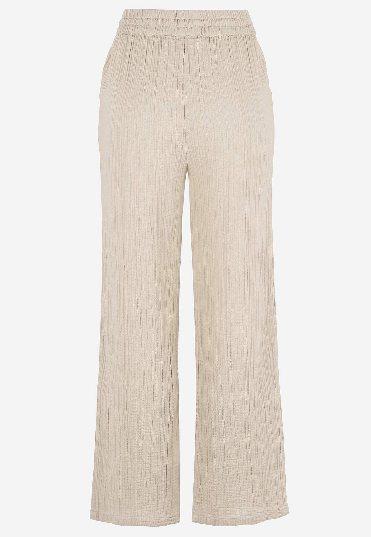 Bukse i fin bomullsmusselin med naturlig struktur. Vevet, mykt materiale med kjølende, luftig følelse. Bredt, mykt elastisk midjebånd med trekksnor. Skråe lommer foran. Lange, vide ben. Indre benlengde ca. 73 cm i alle størrelser.