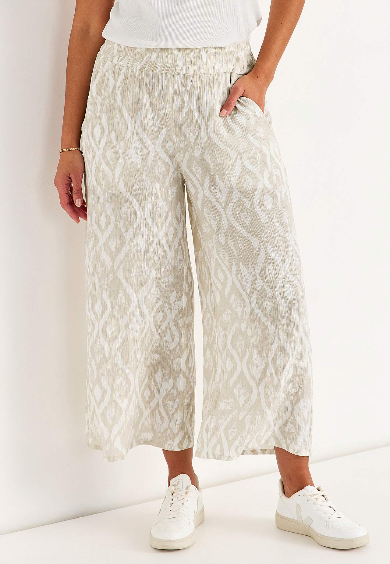 Vevet culottebukse med crêpe-kvalitet. Luftig, kjølende materiale. Bredt, mykt elastisk midjebånd. Skråe lommer foran. Indre benlengde ca. 60 cm i alle størrelser. Matche gjerne med 702443.