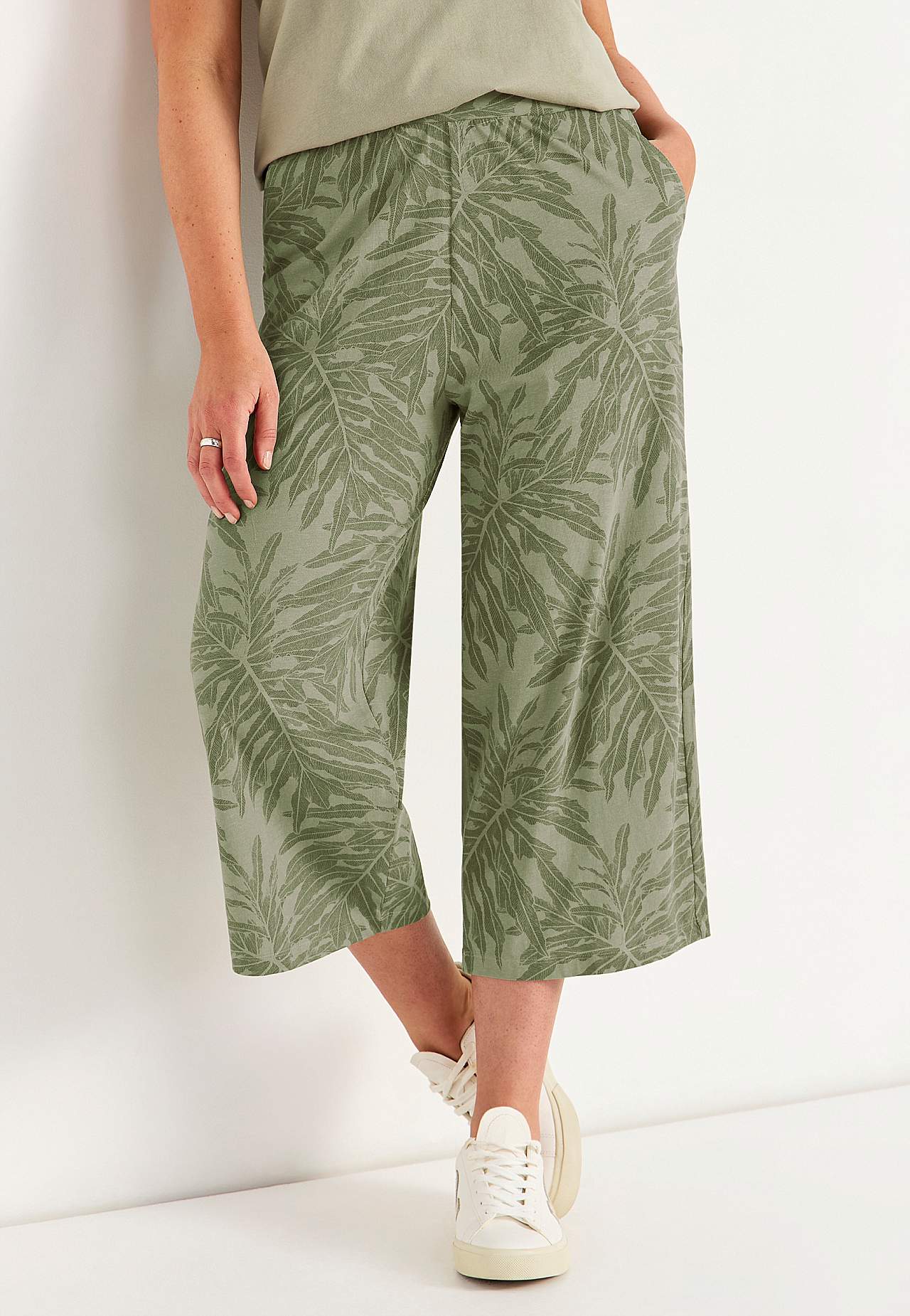 Culottes i myk, økologisk bomull. Jerseybukse med vide, rette ben. Casual passform. Høy midje med bredt, komfortabelt elastisk midjebånd. Skrå sidelommer. Matche gjerne med 702634. Indre benlengde følger størrelsen, ca. 57-59 cm. Skritthøyde varierer i størrelse: omtrent 29-39 cm.