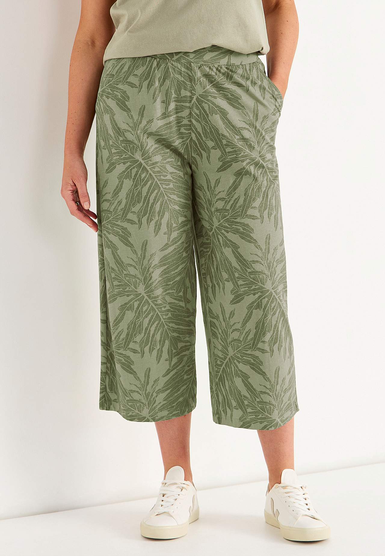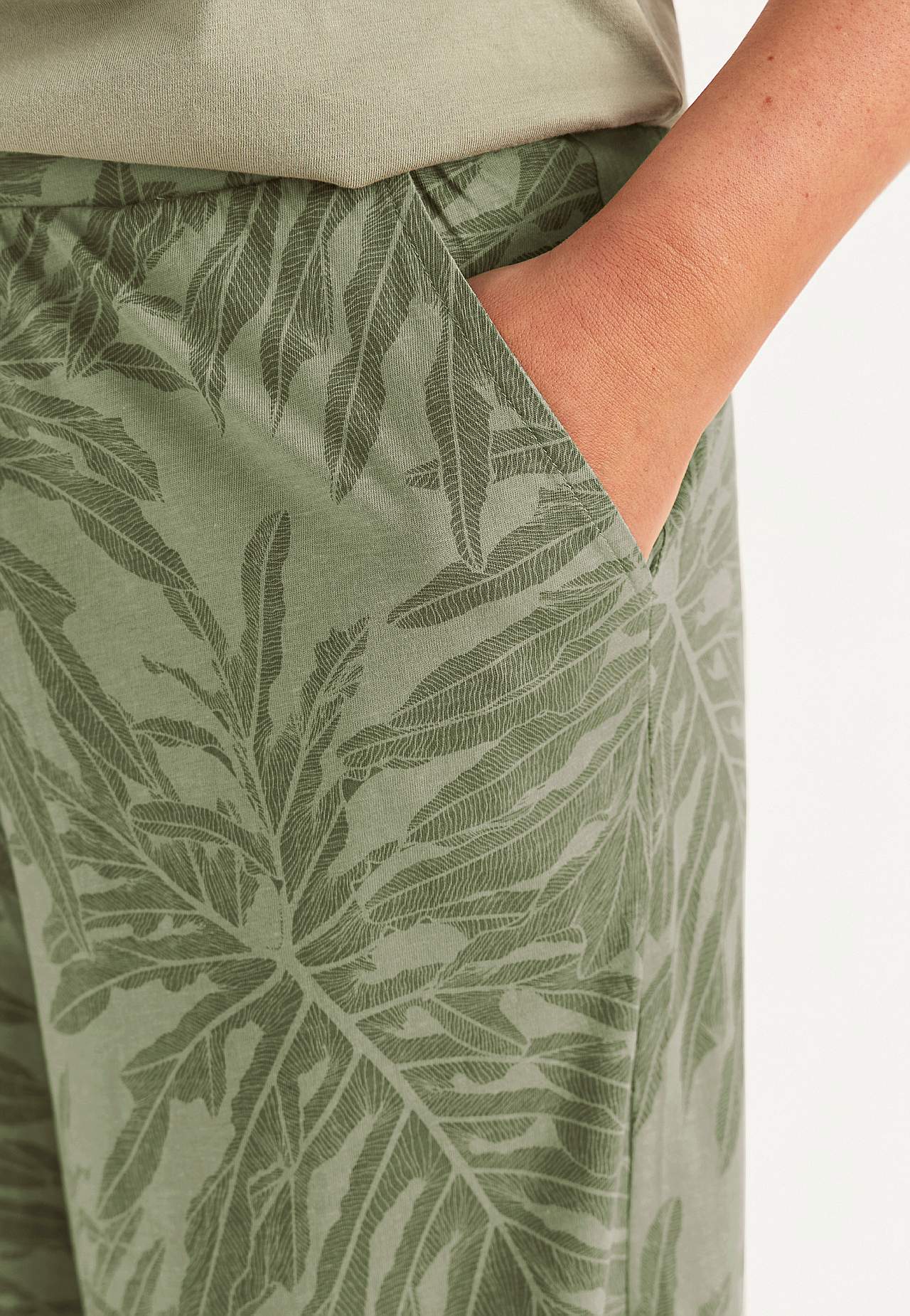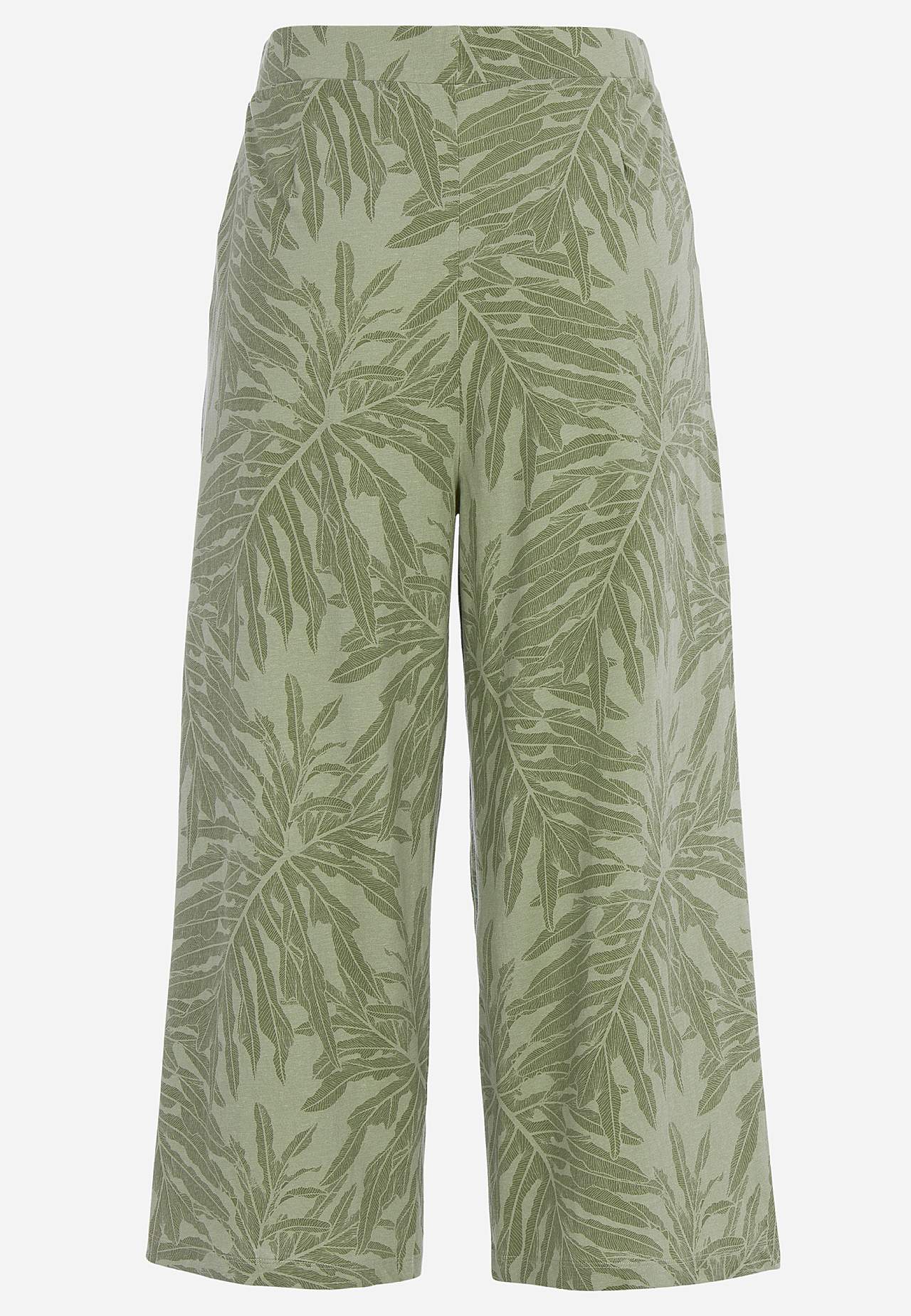 Culottes i myk, økologisk bomull. Jerseybukse med vide, rette ben. Casual passform. Høy midje med bredt, komfortabelt elastisk midjebånd. Skrå sidelommer. Matche gjerne med 702634. Indre benlengde følger størrelsen, ca. 57-59 cm. Skritthøyde varierer i størrelse: omtrent 29-39 cm.