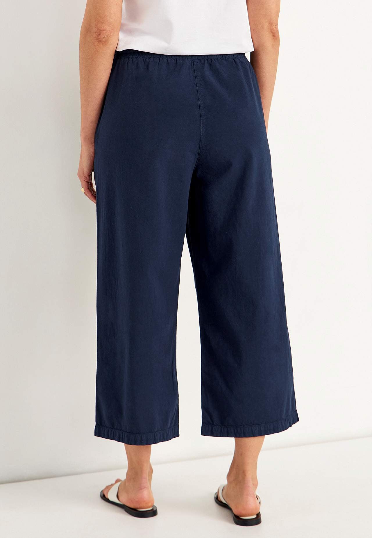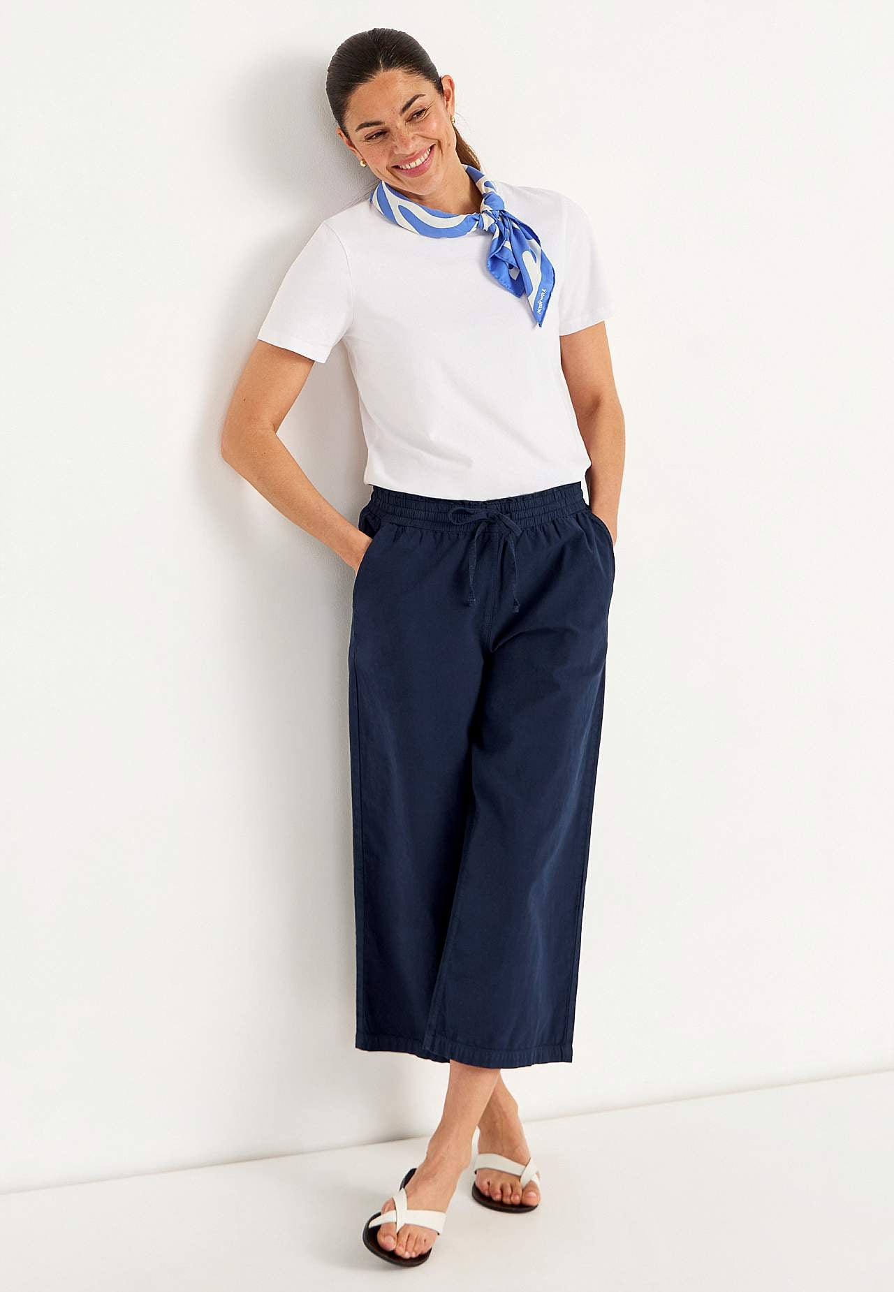 Avslappede culottebukser. Vevet materiale i vasket, fleksibel bomull med naturlig følelse. Løs passform. Komfortabel, elastisk midje med trekksnor. Skrå frontlommer. Vide, rette ben. Indre benlengde ca. 57 cm i alle størrelser. Skritthøyde varierer i størrelse: omtrent 27-37 cm.