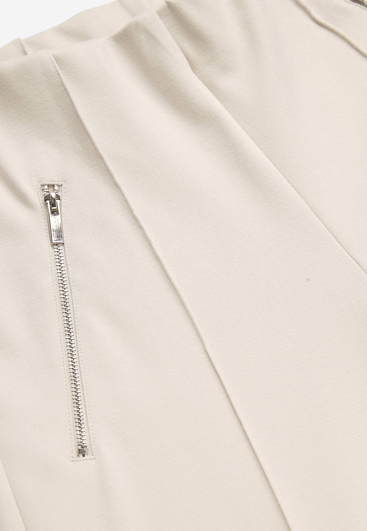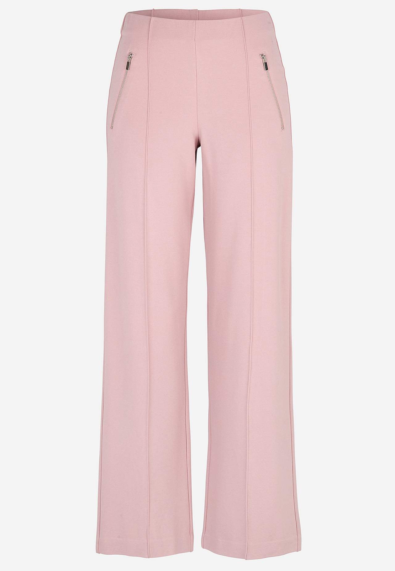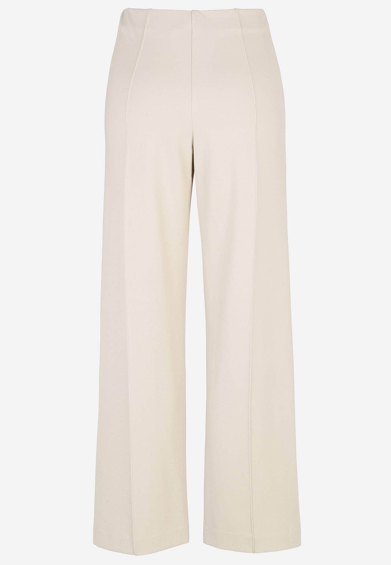 Bukse i fast, stretchy tricot hel lengde med sydd press. Mykt, fleksibel materiale med fint fall. Normal passform med rette, vide ben. Normal midje med skjult strikk. Dekorglidelåser foran. Sydd press både foran og bak. Indre benlengde ca. 78 cm i alle størrelser. Skritthøyde varierer i størrelse: omtrent 25-35 cm.