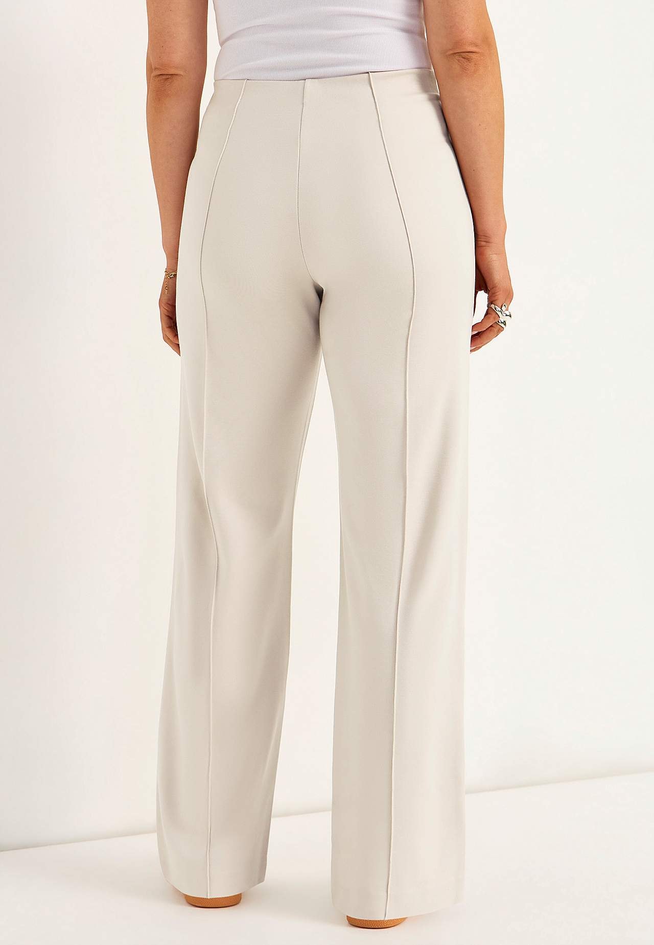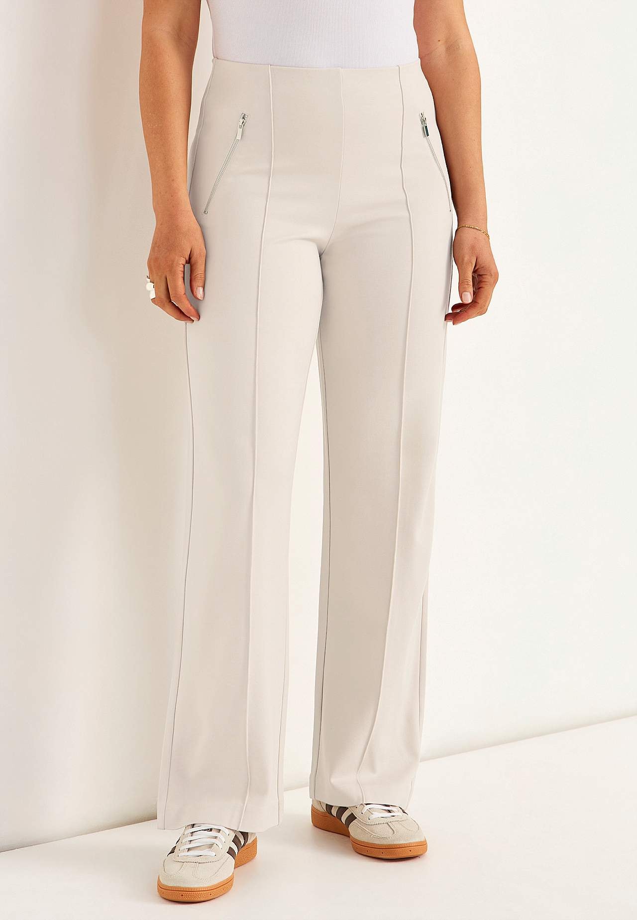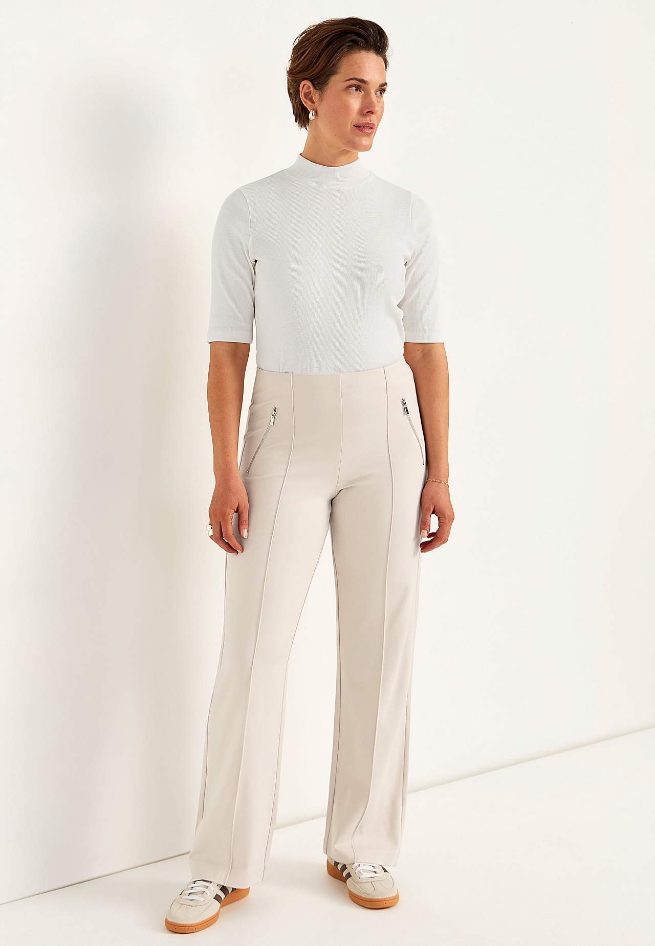 Bukse i fast, stretchy tricot hel lengde med sydd press. Mykt, fleksibel materiale med fint fall. Normal passform med rette, vide ben. Normal midje med skjult strikk. Dekorglidelåser foran. Sydd press både foran og bak. Indre benlengde ca. 78 cm i alle størrelser. Skritthøyde varierer i størrelse: omtrent 25-35 cm.