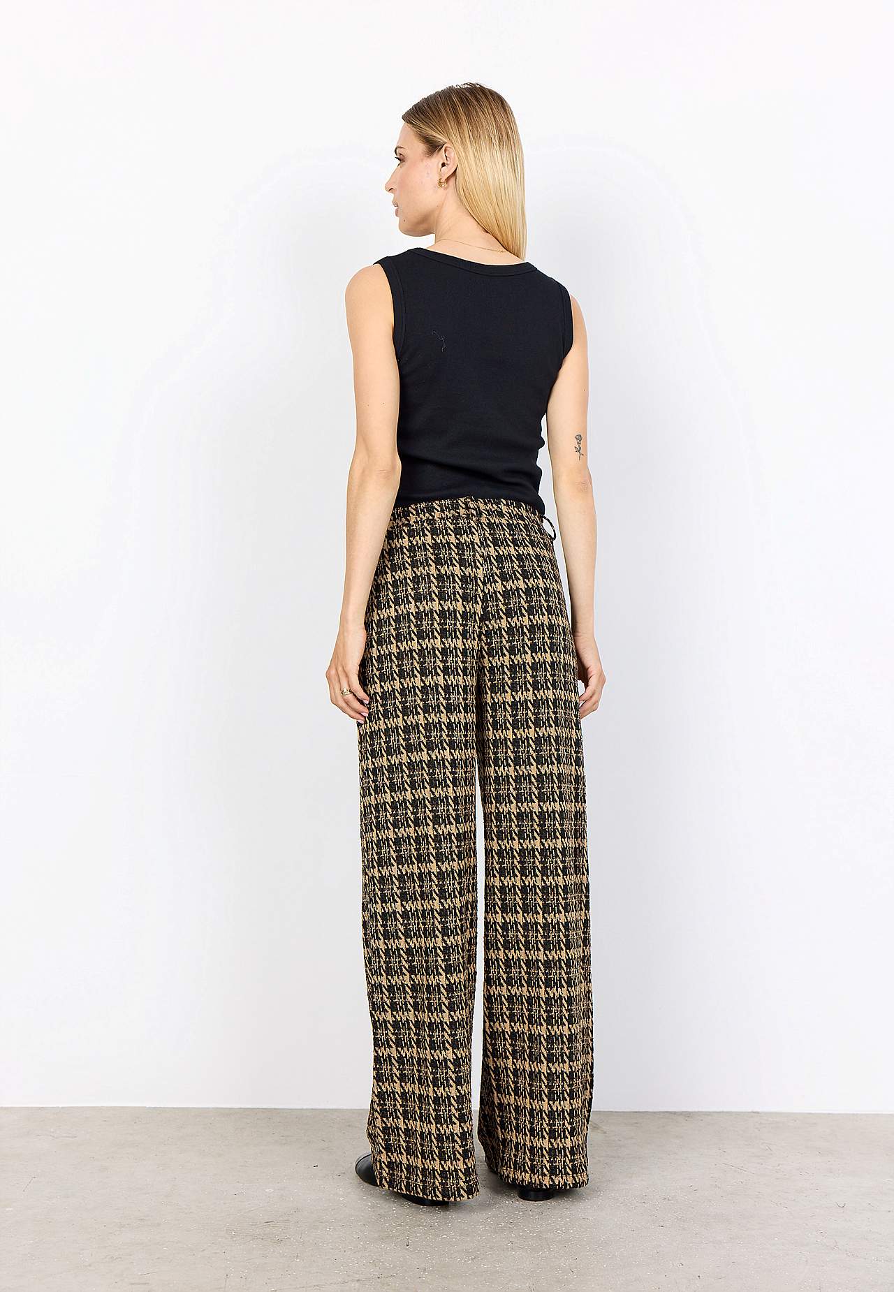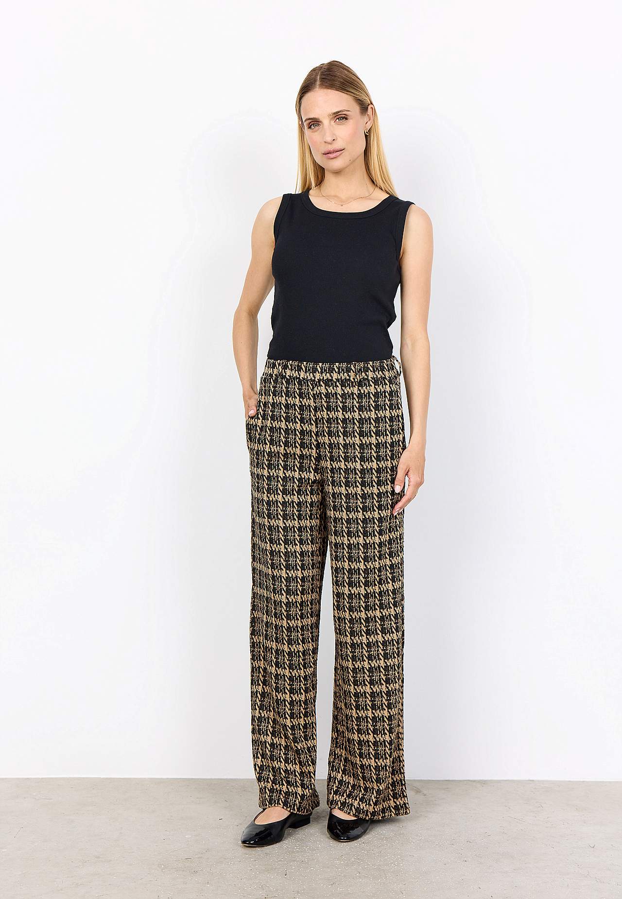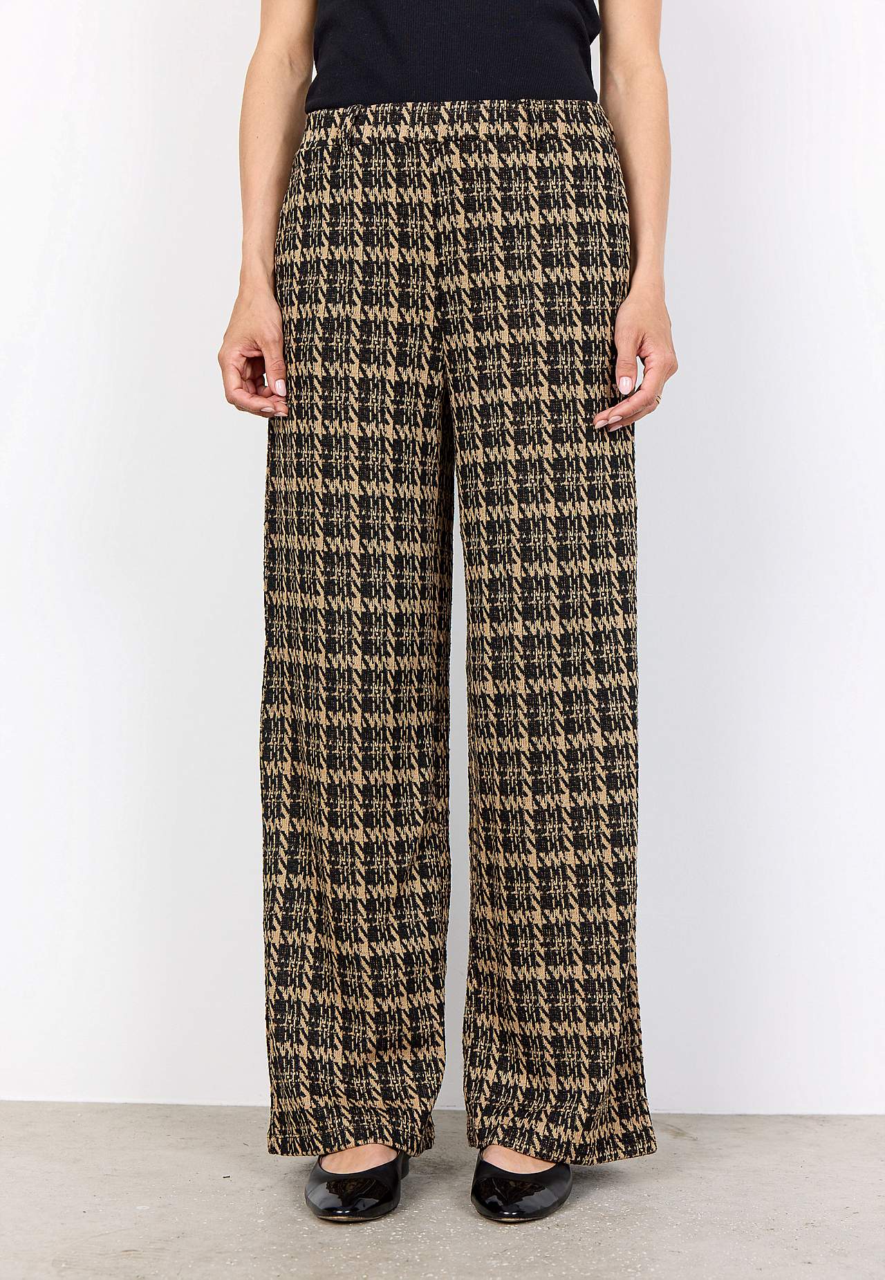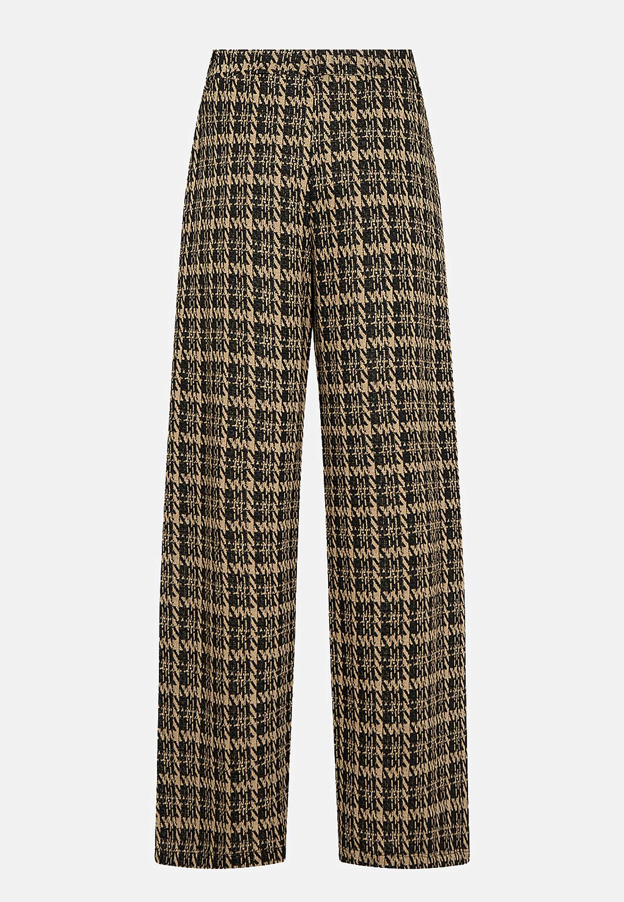 Rutete jerseybukse i myk, noe grovere jacquard-strikk. Rett passform. Komfortabel elastisk midje med beltestropper. Lommer i sidene. Vide, rette ben. Indre benlengde omtrent 78 cm i størrelse S (38). Matche gjerne med 701097.