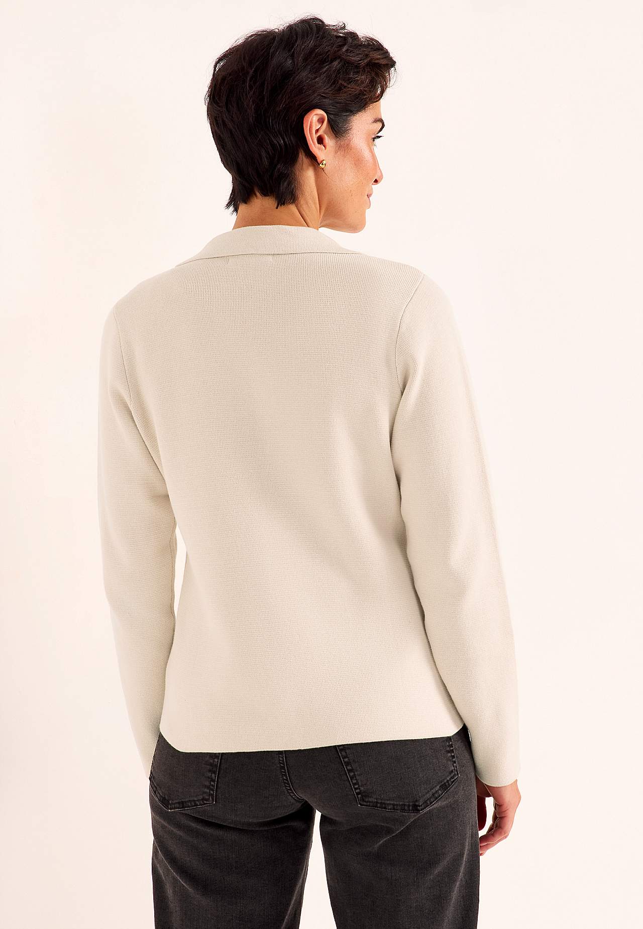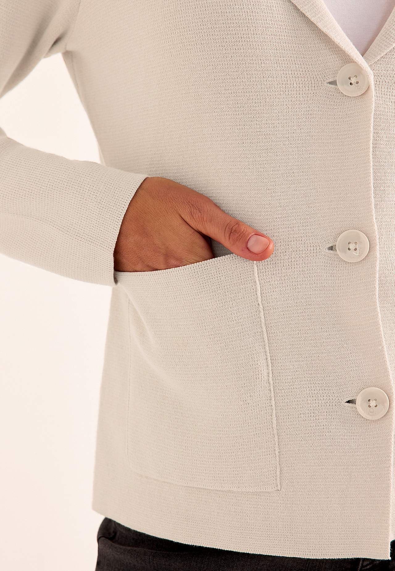 Finstickad blazer i formfast, mjuk bomullskvalitet. Något figurnära passform. Enkel, stilren design perfekt året om. Tre stora knappar. Fickor framtill. Långa ärmar. Längden följer storleken ca 61-70 cm från axeln.