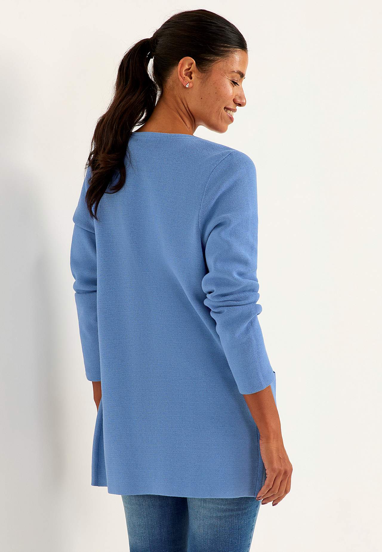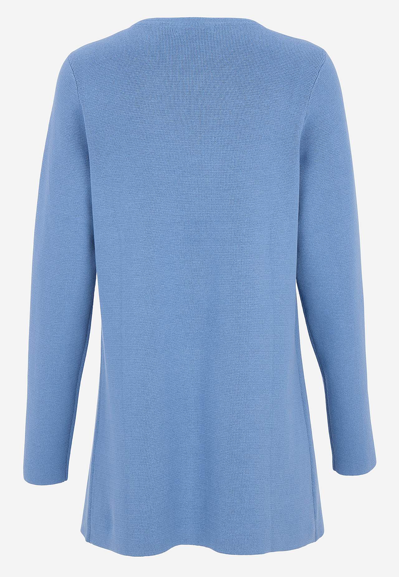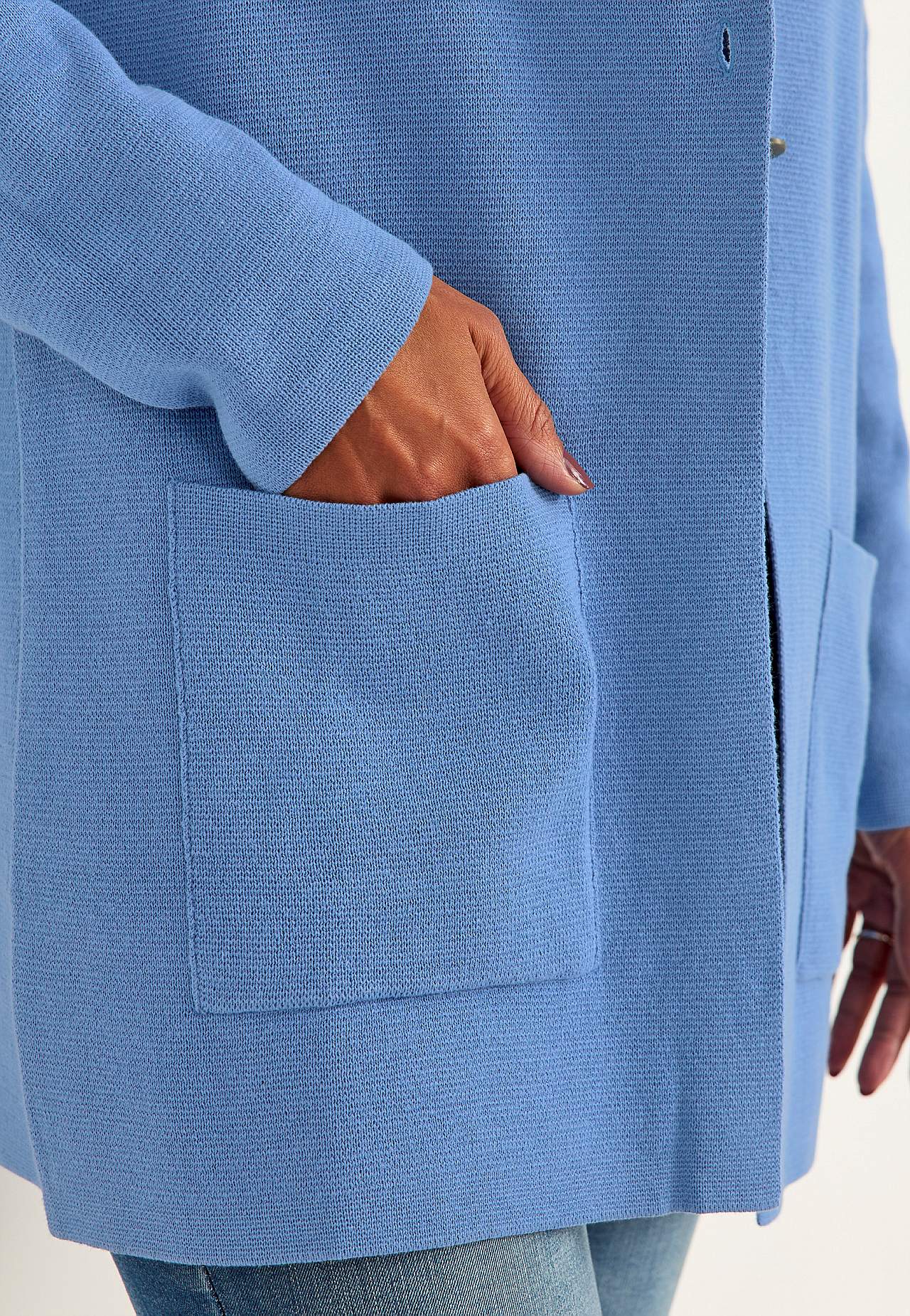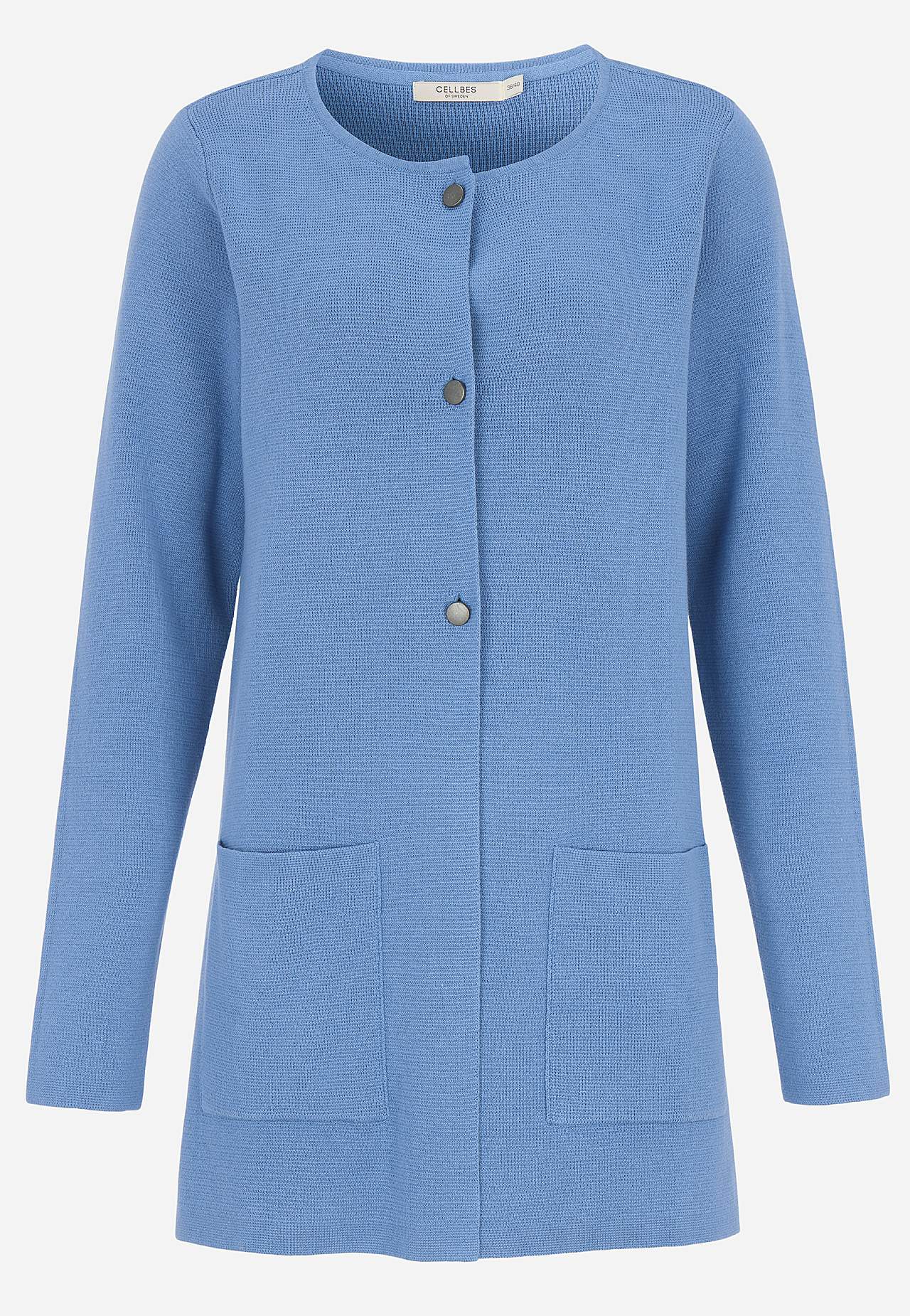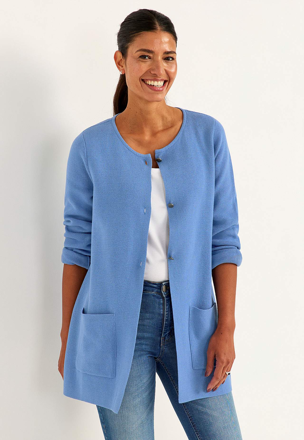 Finstrikket cardigan i formfast, myk bomullskvalitet med fin struktur. Rent, stilrent design perfekt for hele året. Litt lengre modell med lommer foran. Rett passform. Tre antikksølv knapper. Lengden følger størrelsen, ca. 77-86 cm fra skulderen.