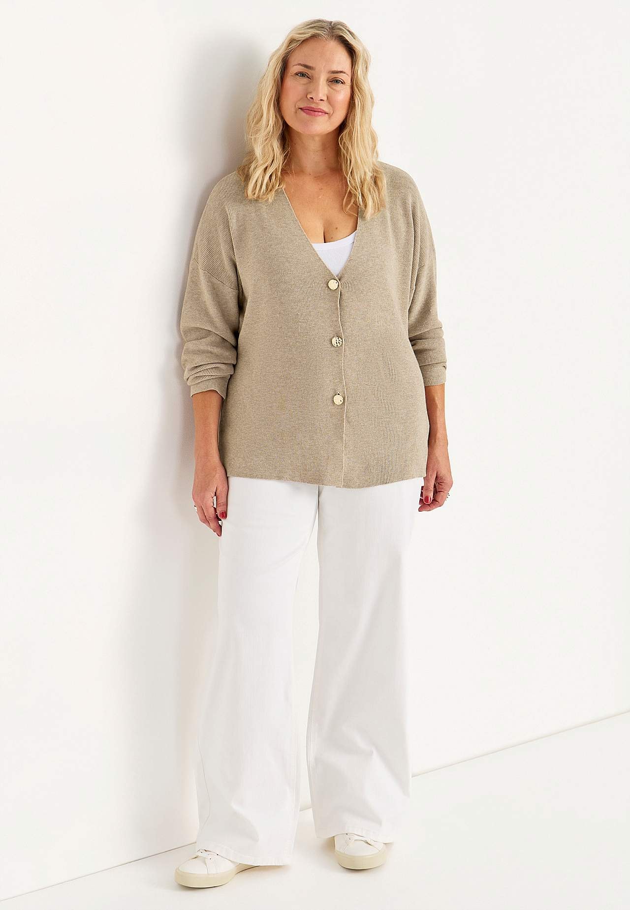Myk, stretchy cardigan med knapper. Lett figurformet passform. Hals med litt dypere v-ringning. Dekorative knapper. Lett nedtrukket skulder. Lange, rette ermer. Fin å ha på over en topp eller en singlet. Lengden følger størrelsen, ca. 65-73 cm fra skulderen.