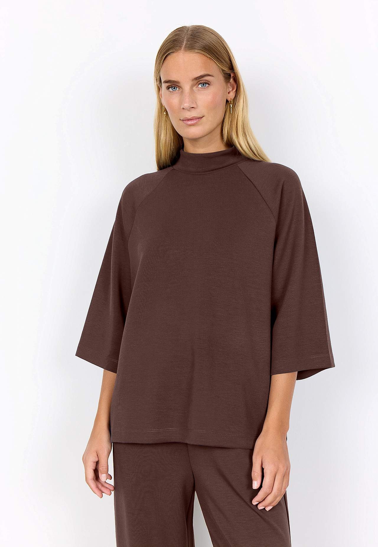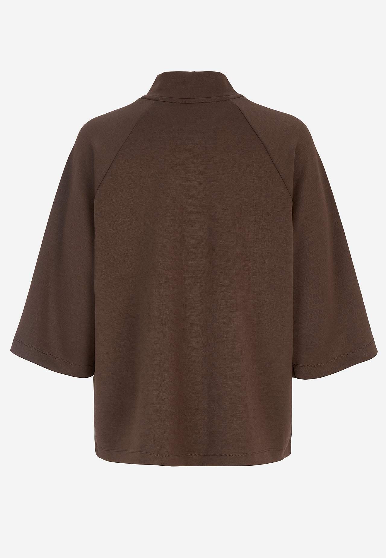Silkemyk, noe kraftigere trikot i modalmiks. Avslappende passform. Halv høy hals. Trekvartlangt, vidt kort erme. Rett fald. Lengde ca. 62 cm i størrelse S (38).