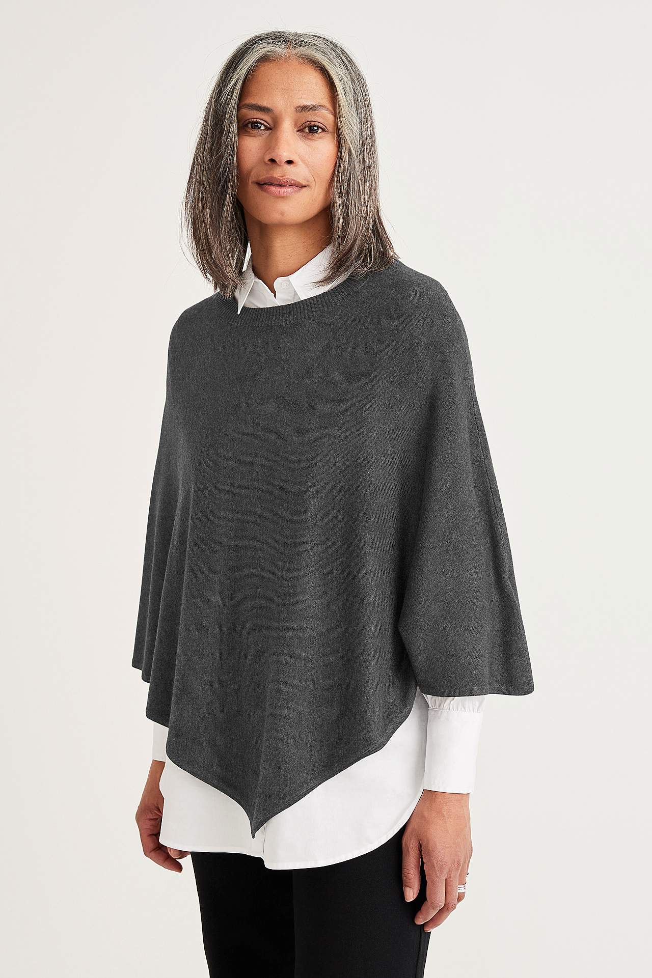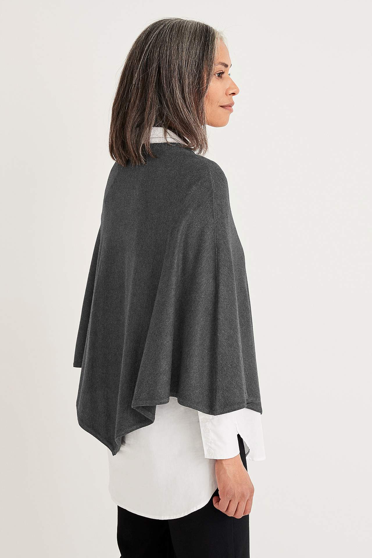 Finstrikket poncho med avrundet, ribbet hals. Lengde midt bak ca. 72 cm i størrelse 36/44.