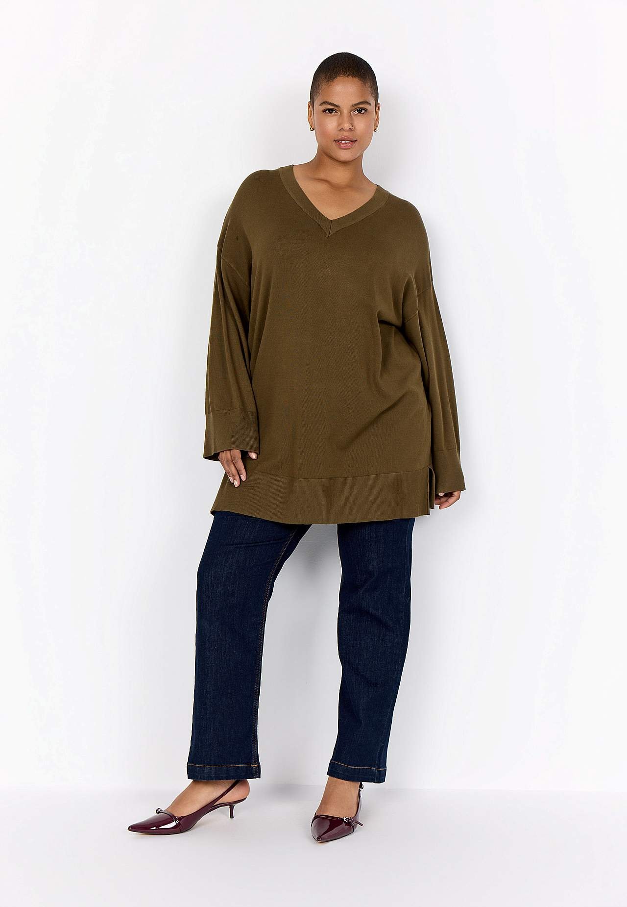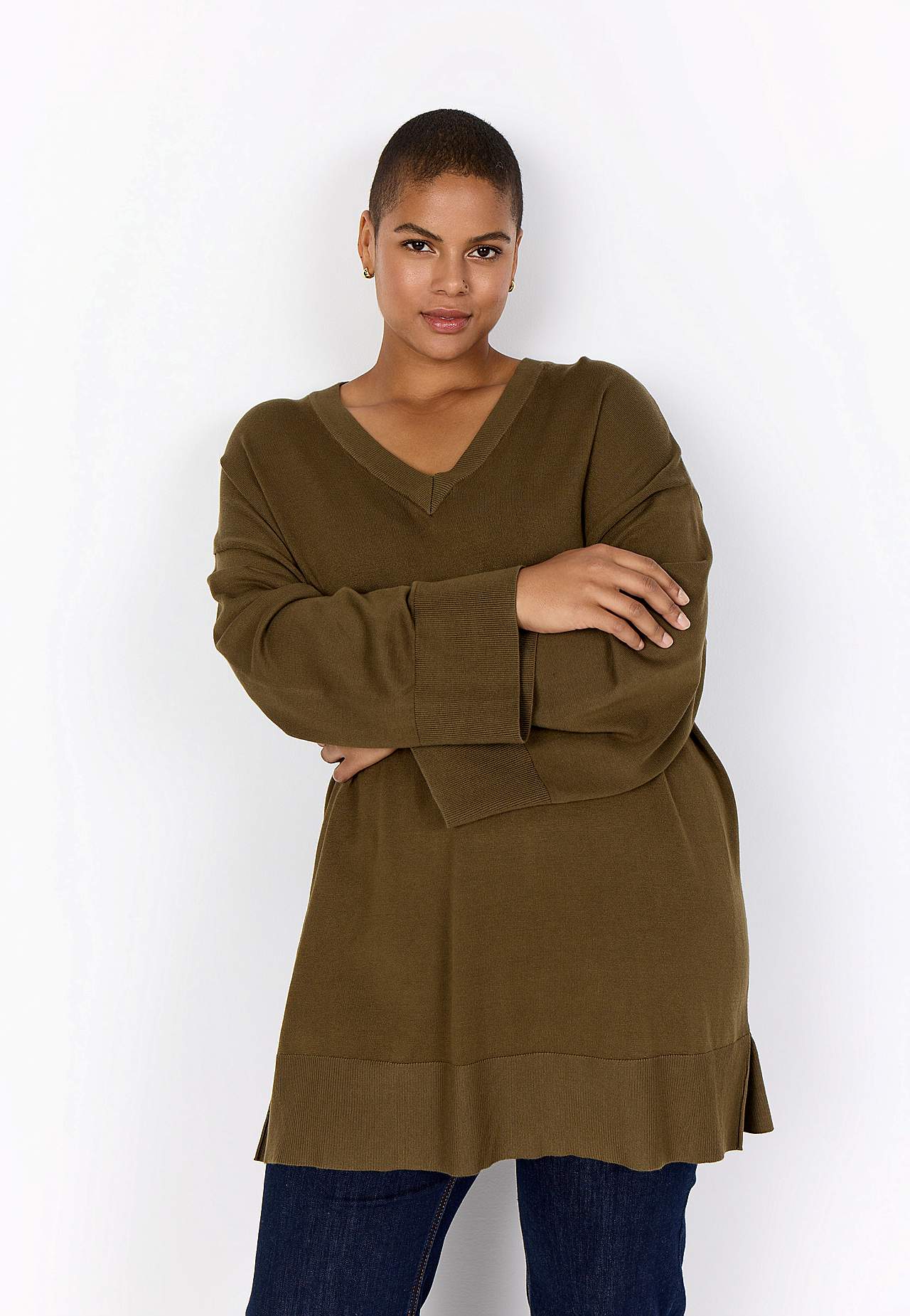 Myk, strikket tunika. Mykt materiale med lett lysskinn. Romslig passform. Lange, vide ermer. Ekstra bred, ribbestrikket mansjett i ermeslutten. Utringet skulder. Rett ribbestrikket linning med splitt i sidene. Lengde fra skulder ca. 90 cm i størrelse M (46/48).