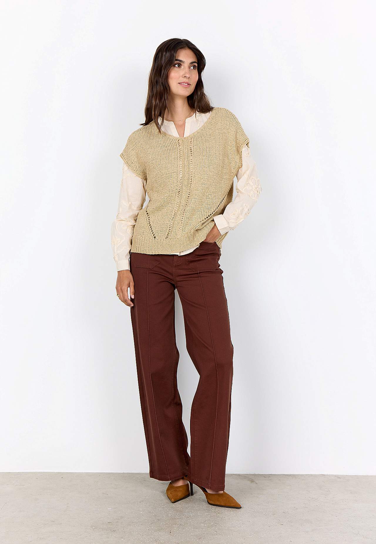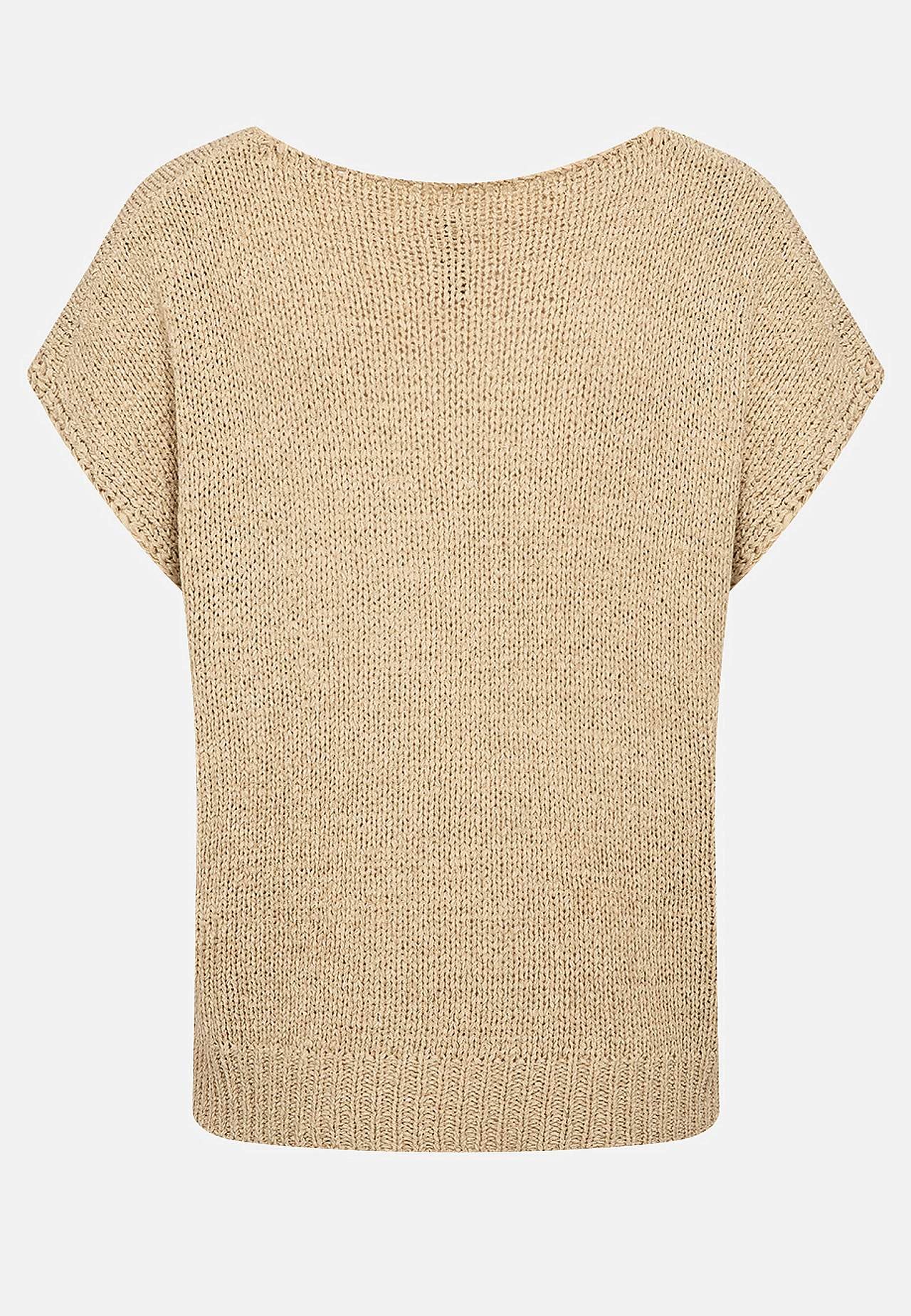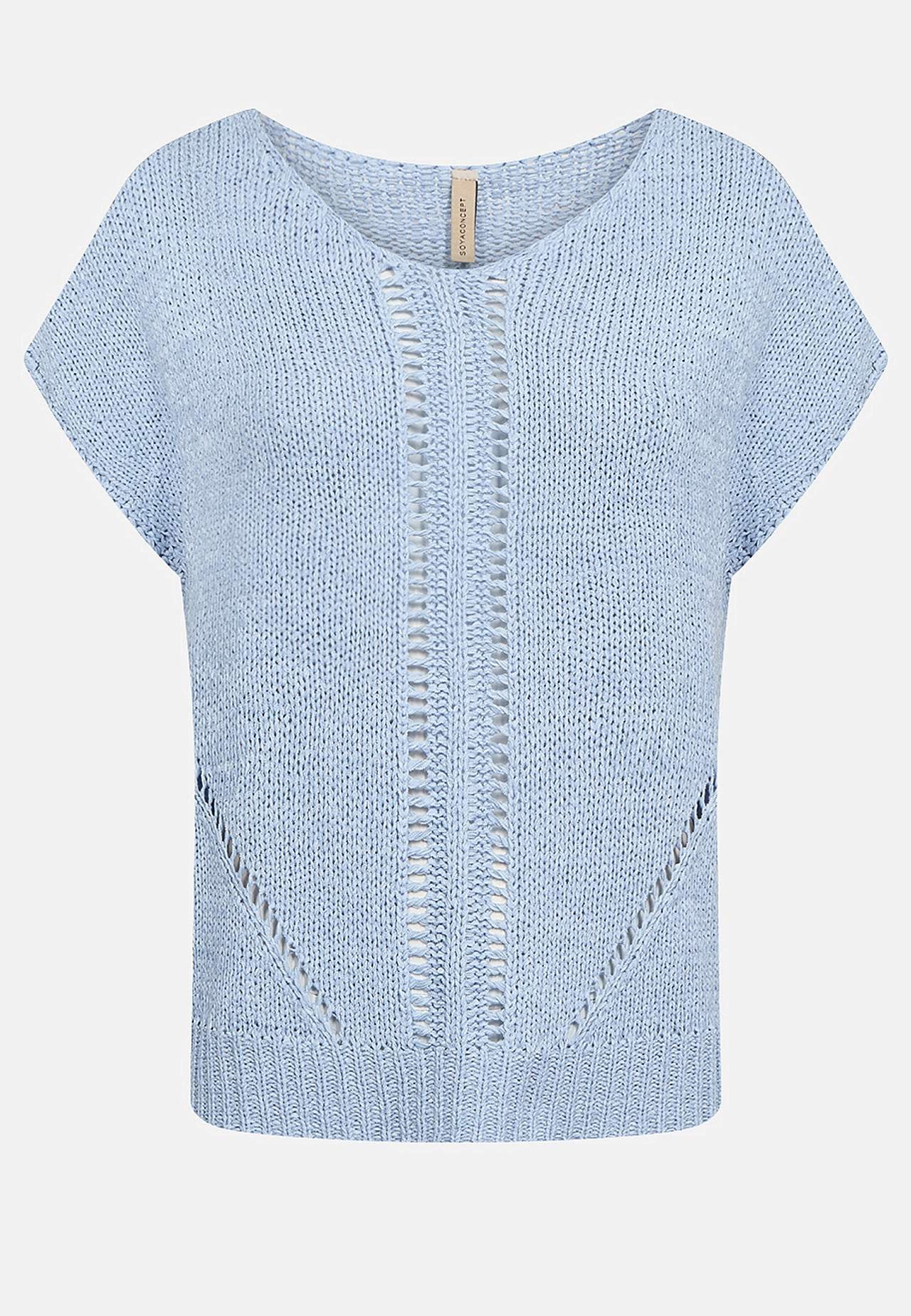 Luftig, myk genser med hullstrikket mønster på framsiden. Fin å ha på over en topp eller en singlet. Casual passform. Rundhalset. Korte korte ermer. Rett, ribbestrikket fald. Lengde fra skulder ca. 57 cm i størrelse 38/40 (S/M).