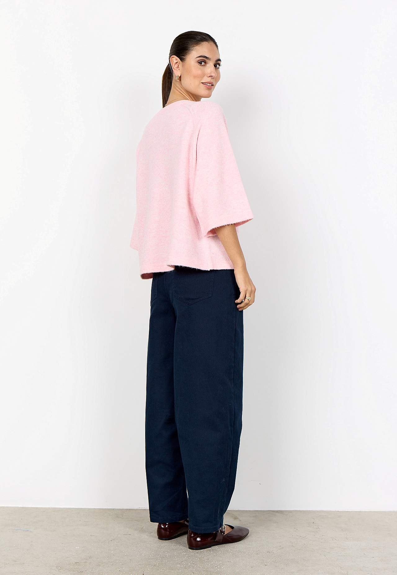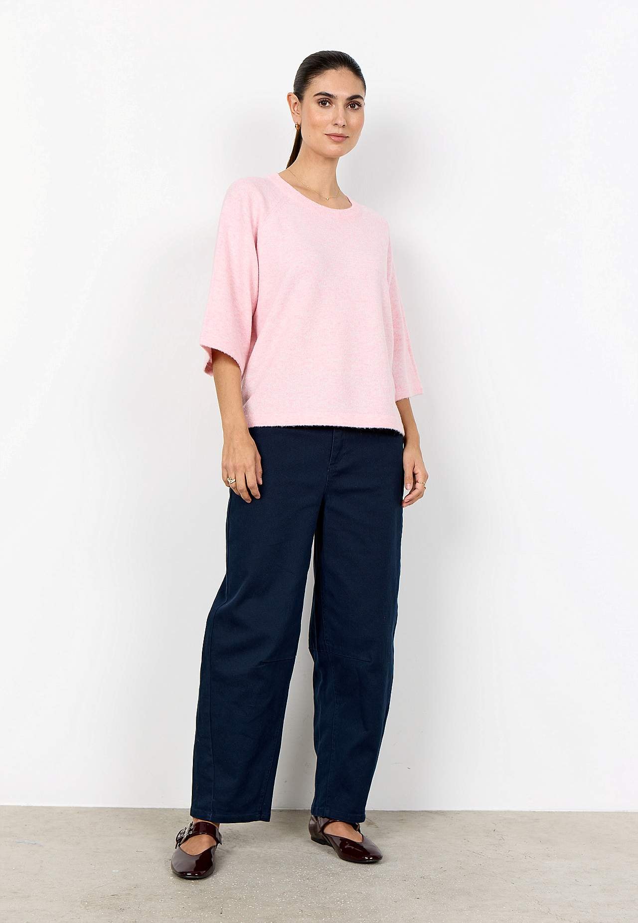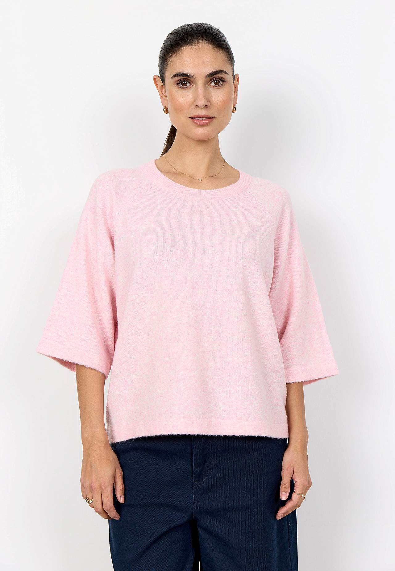 Strikket, luftig genser i melert garn. Mykt, stretchy materiale. Rett, avslappet passform. Avrundet, ribbestrikket hals. Halvlange, vide raglanermer. Rett fald. Lengde fra skulder ca. 58 cm i størrelse S (38).