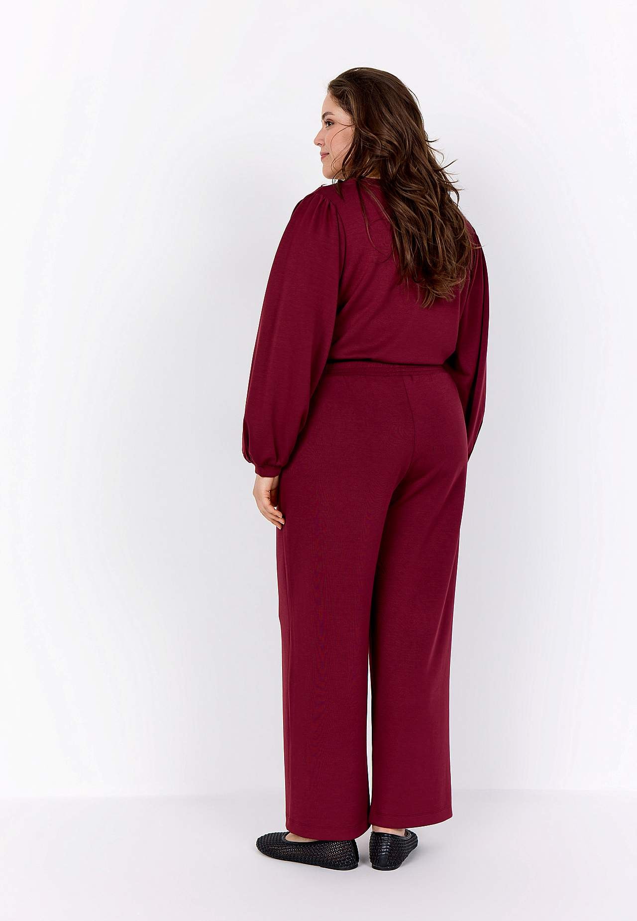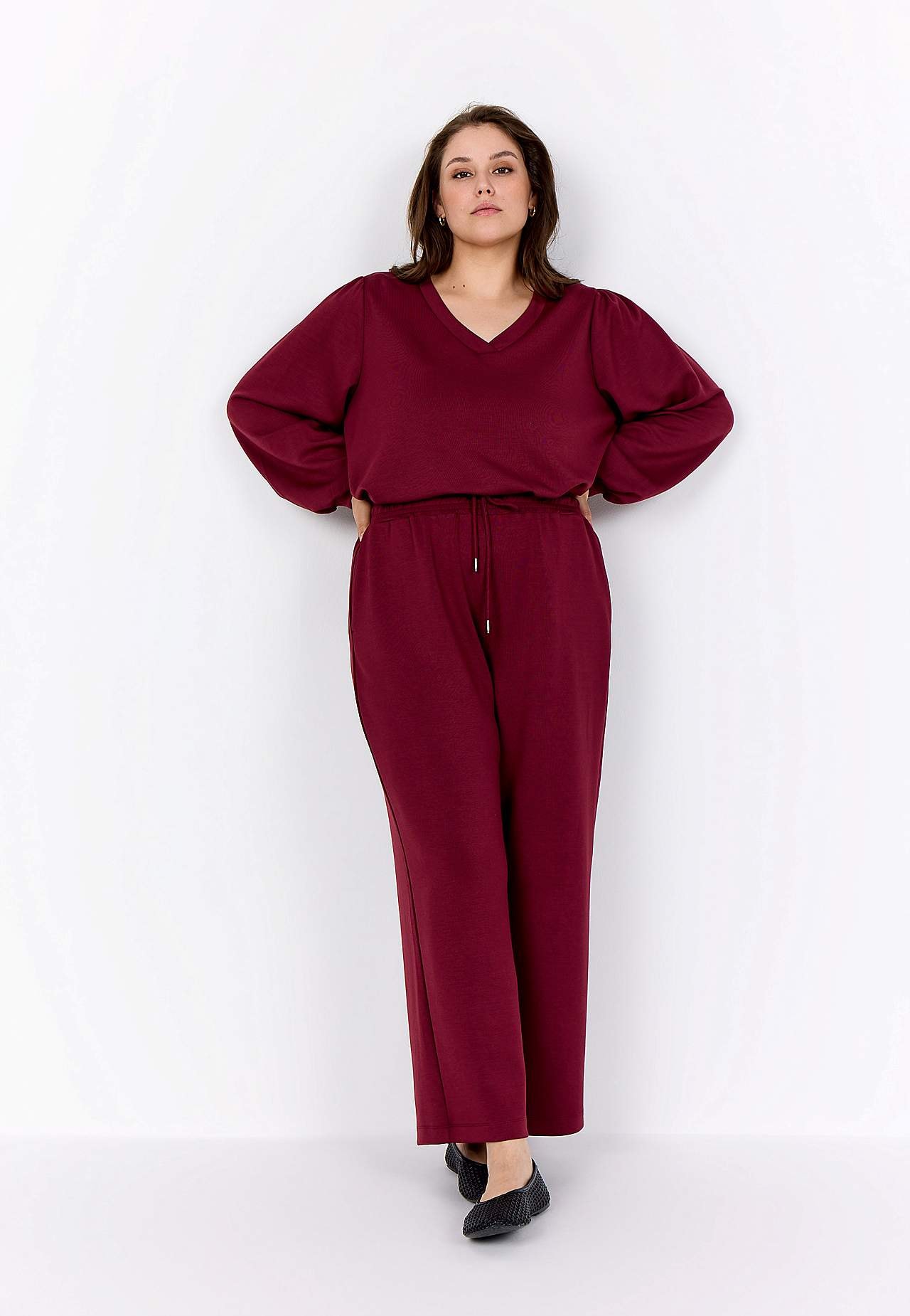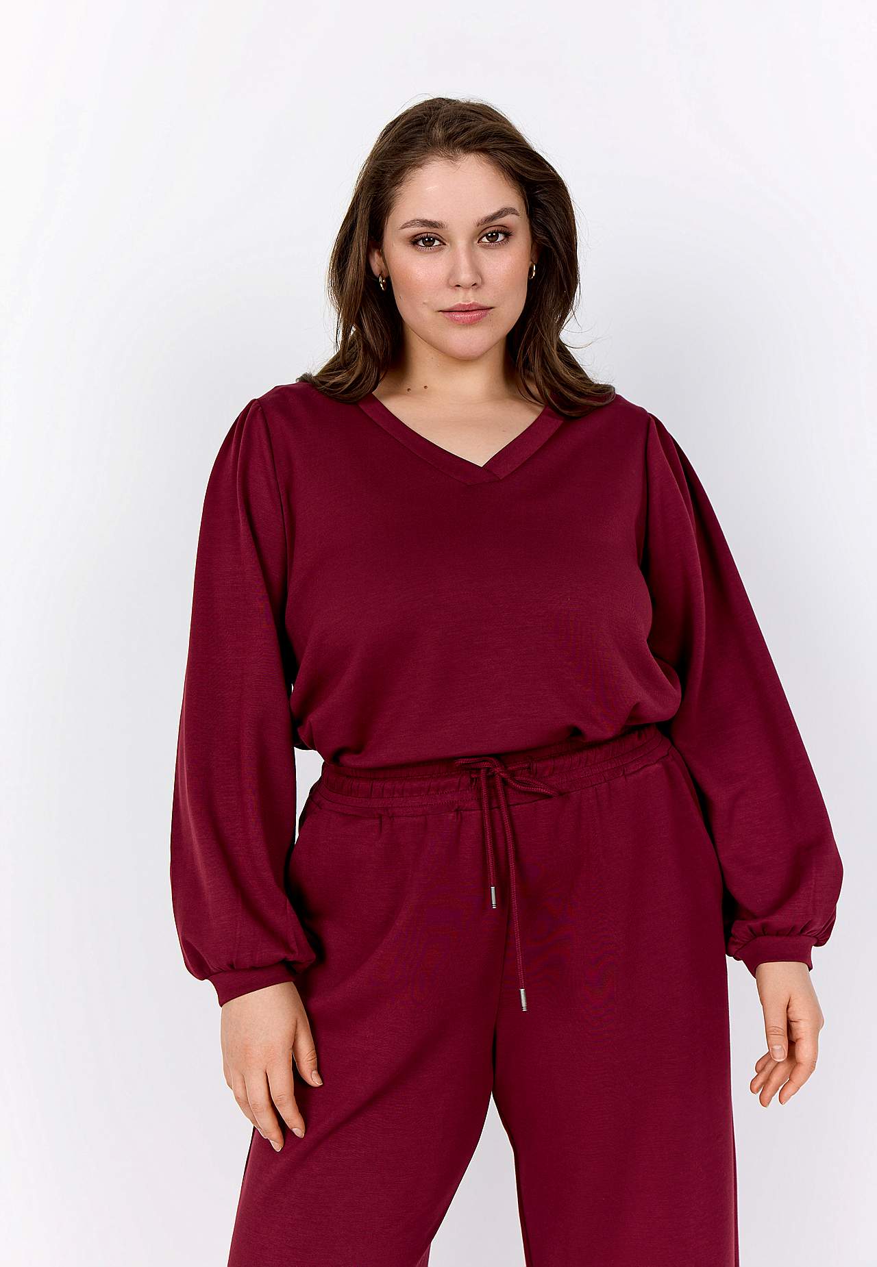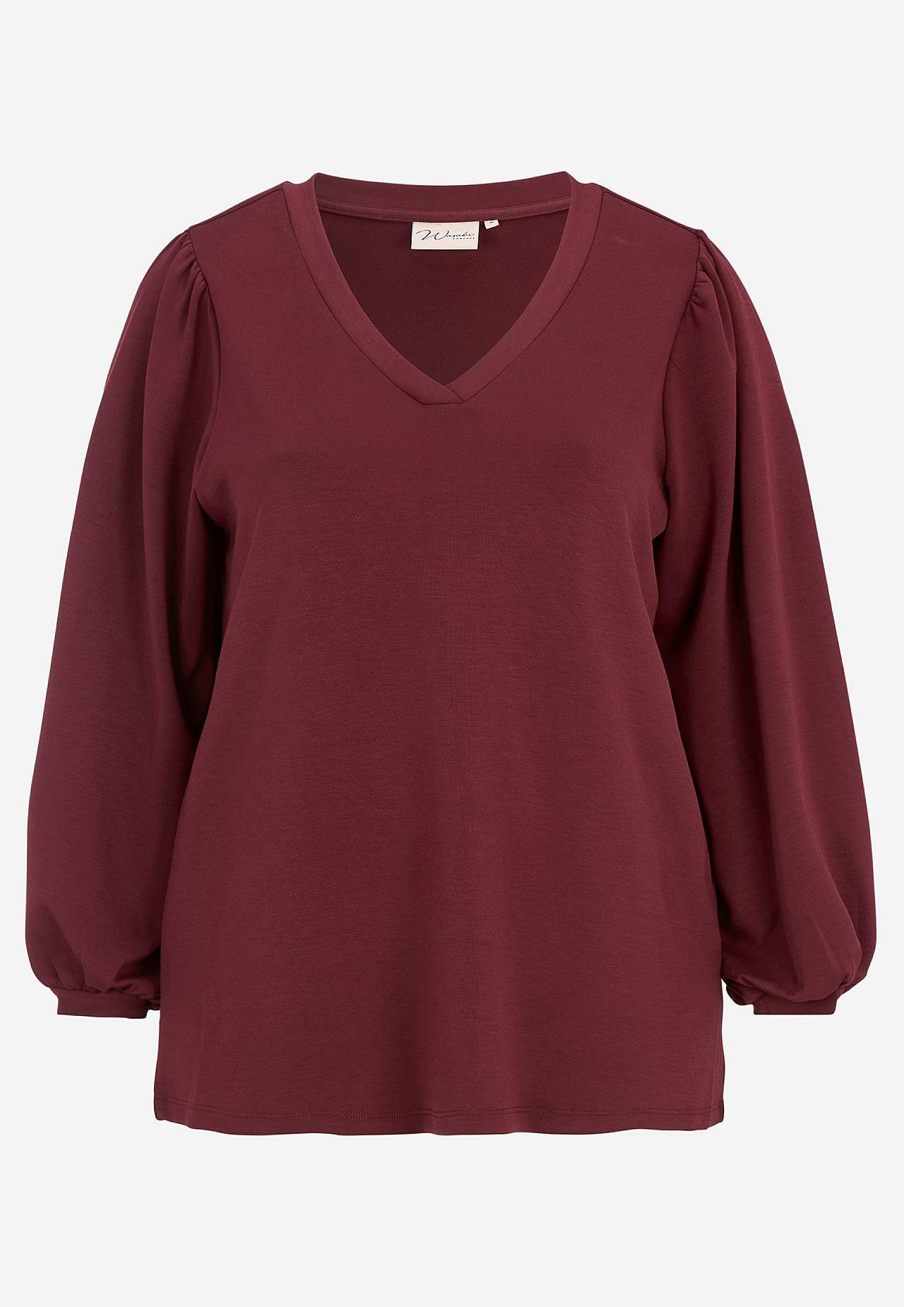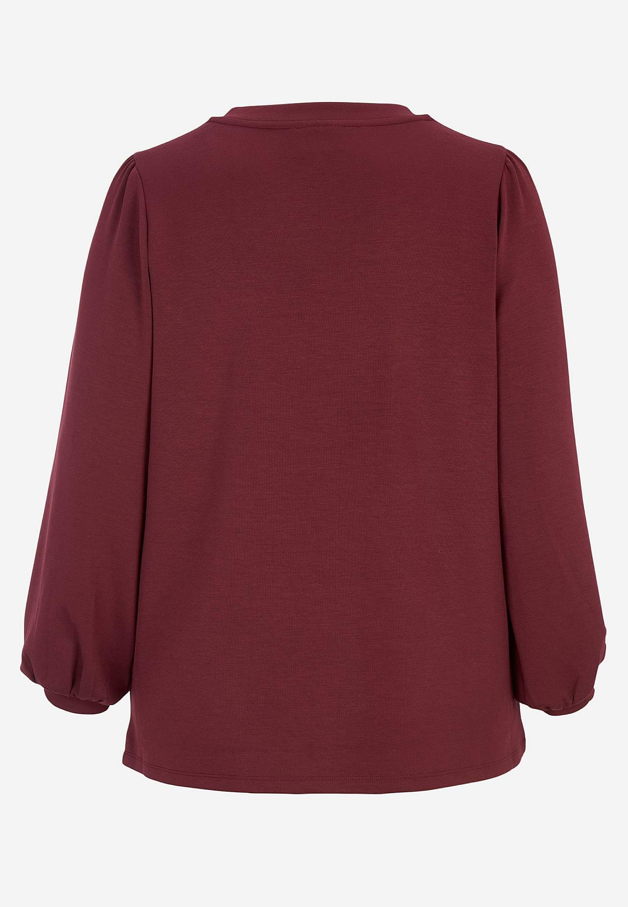 Topp i silkemyk, noe kraftigere modalmiks. Oversize passform. V-hals. Fin rynke på skulderen. Lange ermer med fin vidde og tynn mansjett i ermeslutten. Rett fald. Lengde ca. 72 cm i størrelse M (46/48).