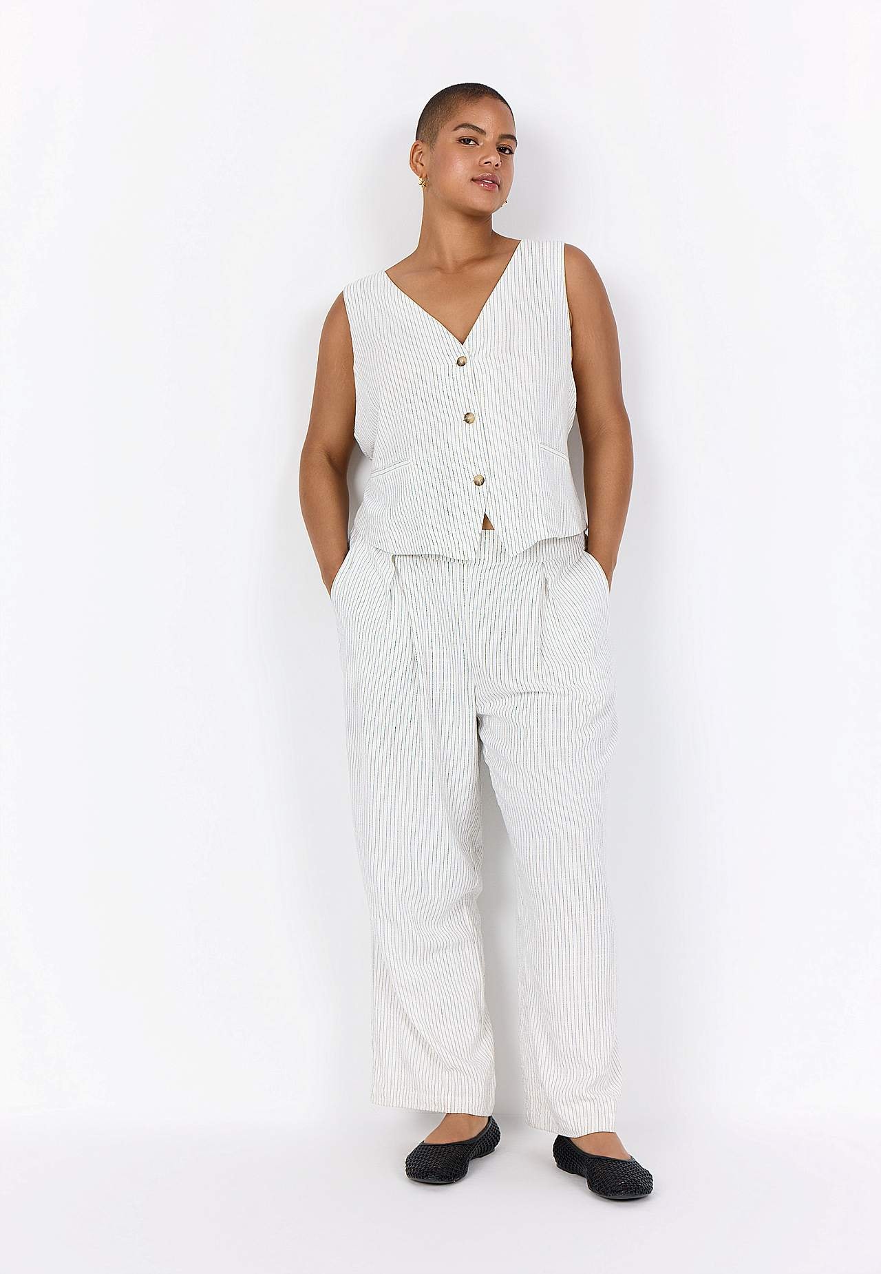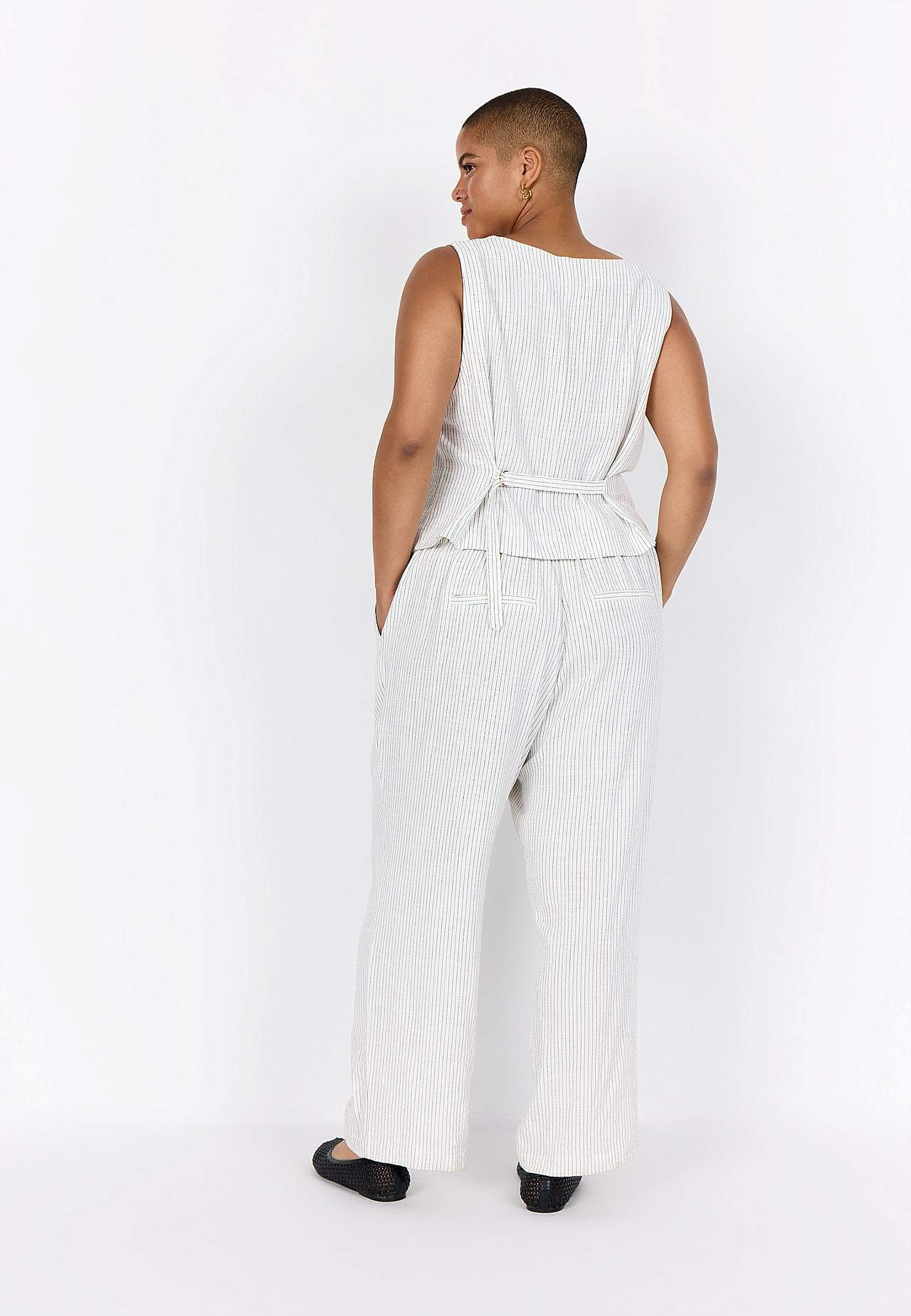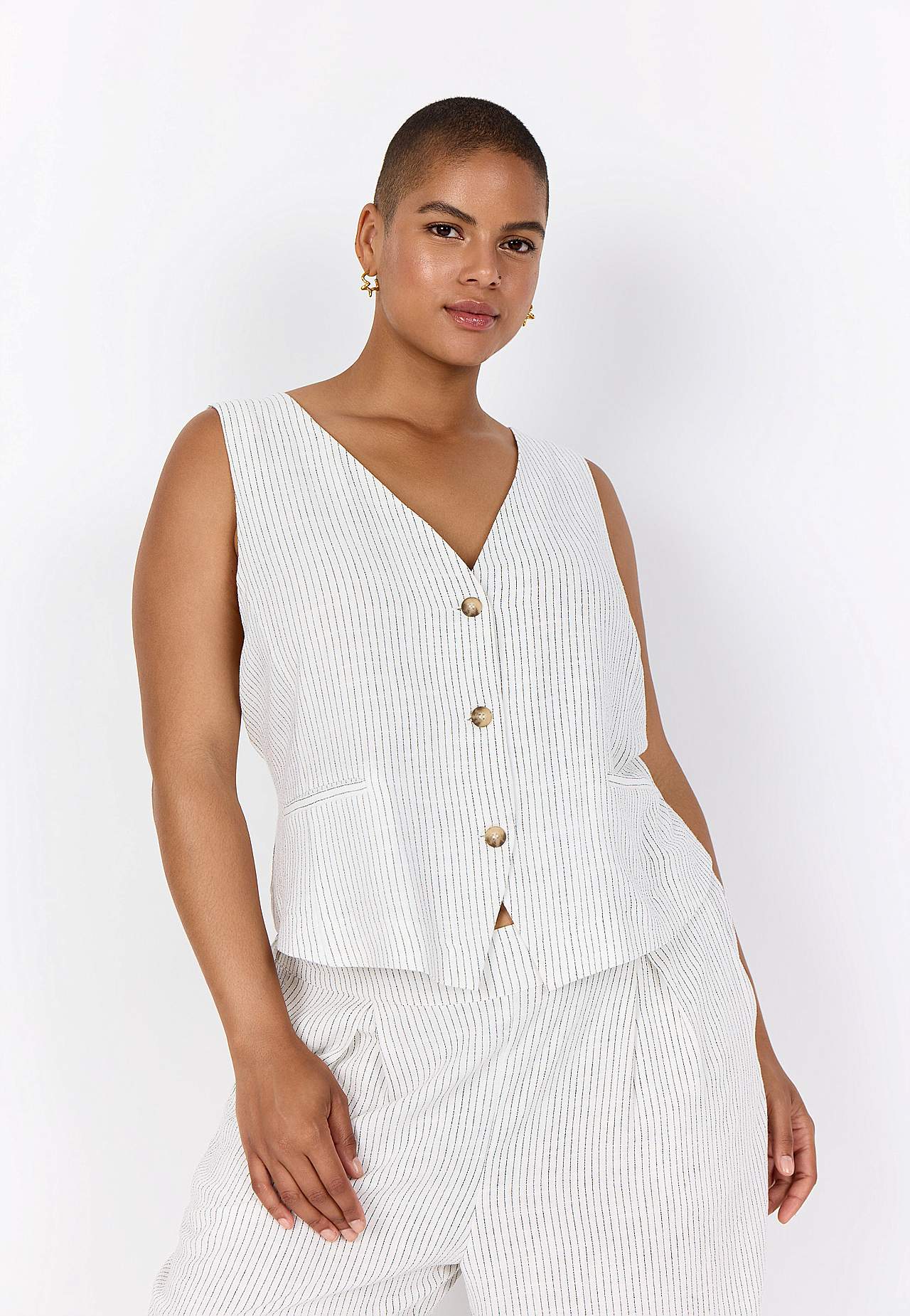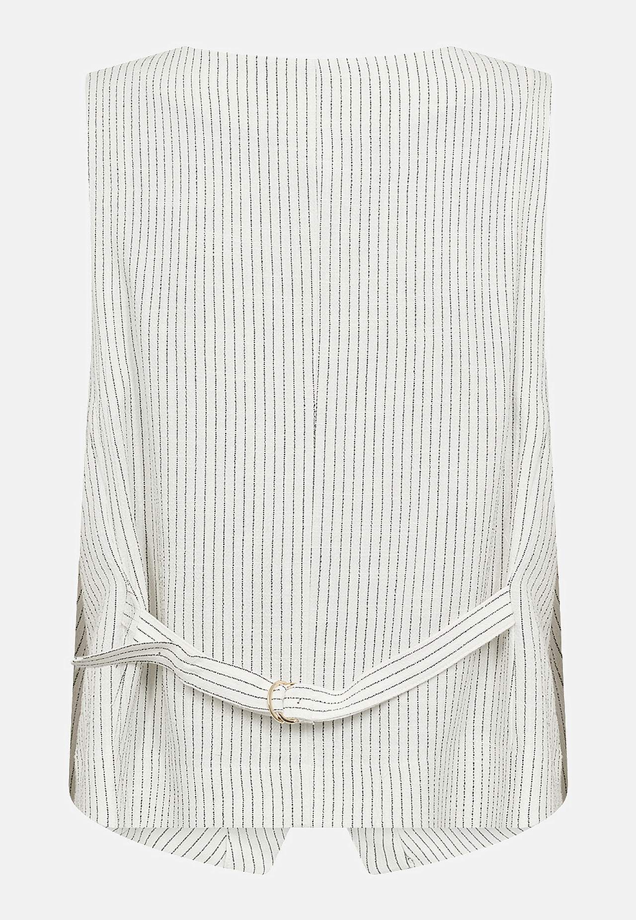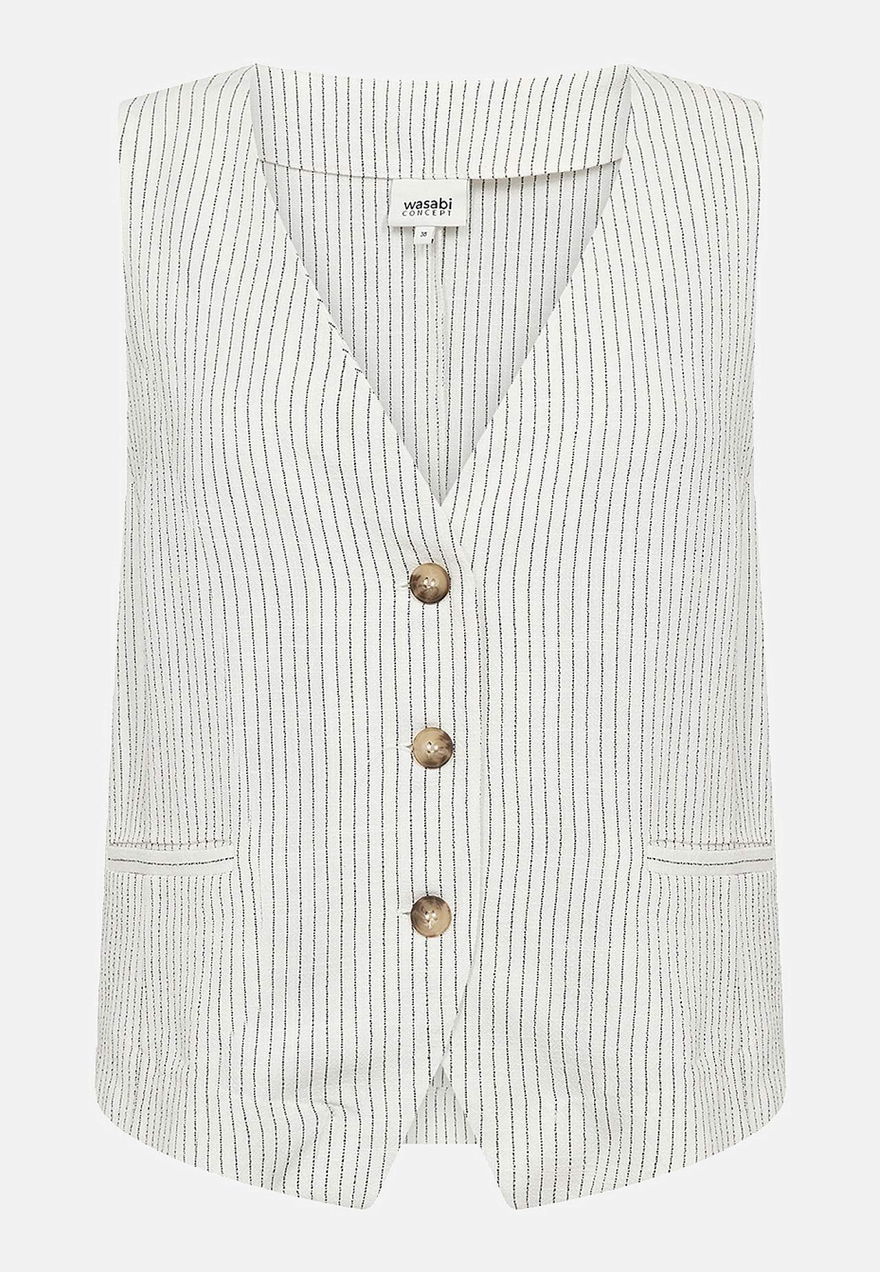 Garnfarget, stripete vest i fleksibel, myk viskose- og linblanding. Casual passform. V-ringning. Knappelukking. Figursømmer foran. Små lommer. Justerbar lukking i ryggen med spenne. Lengde fra skulder ca. 58 cm i størrelse 42.