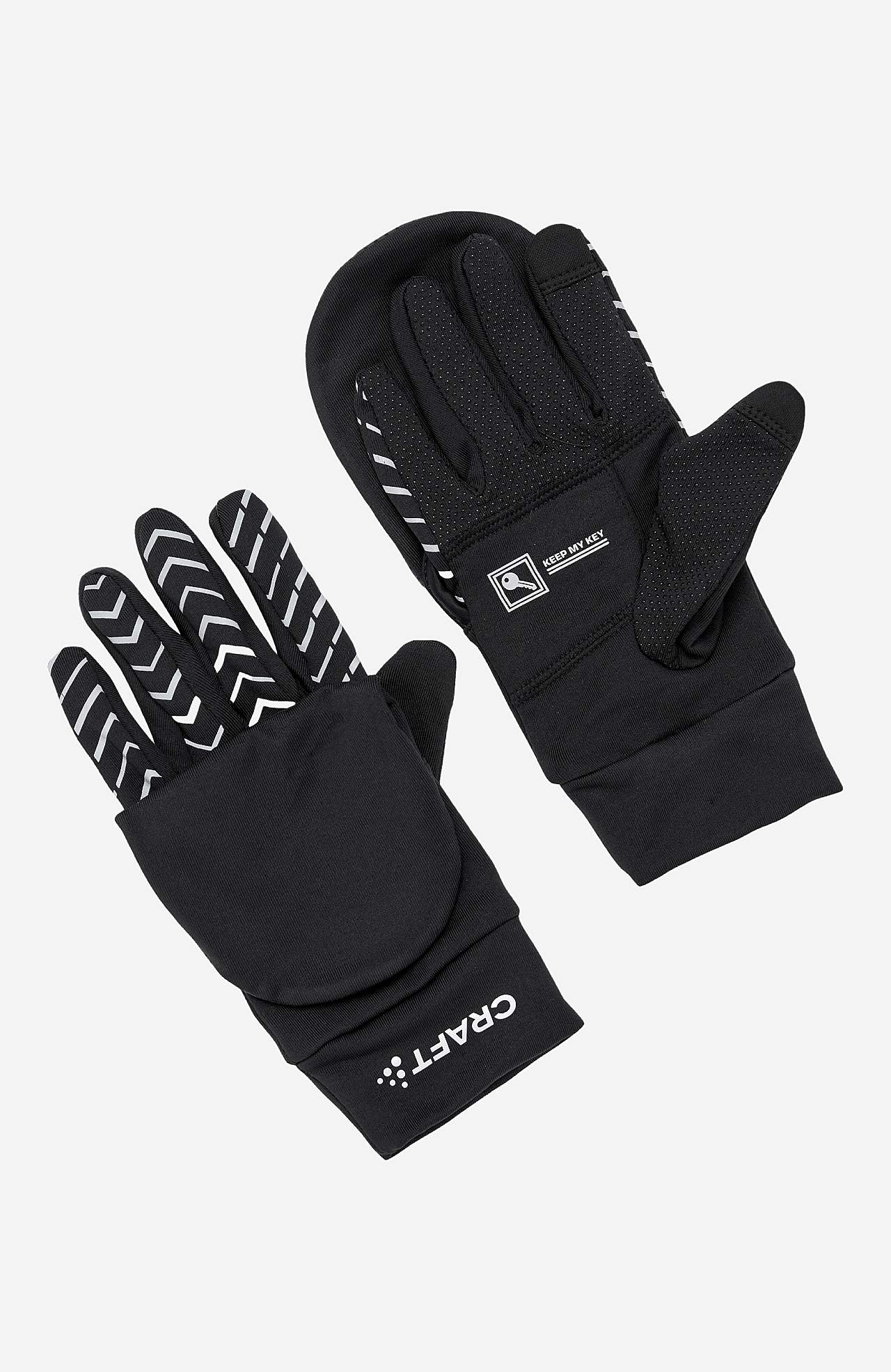Hansker med reflekterende detaljer. Funksjonell, myk jersey. Smart nøkkellomme. 2-i-1 design med hanske og overtrekksvott.