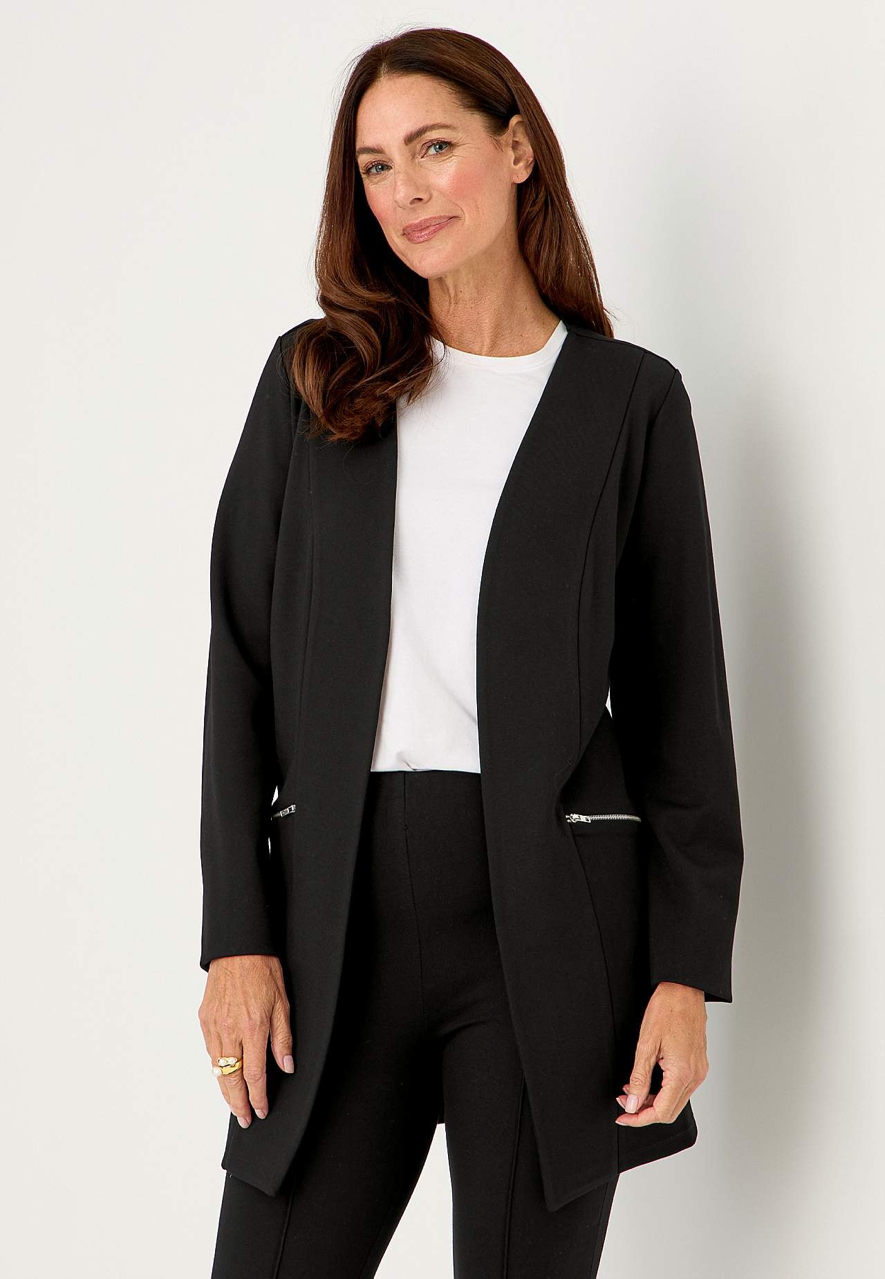 Casual, åpen blazer. Tung, stretchy jerseykvalitet. Komfortabel, lang modell. Lommer med sølvfargede glidelåser. Lange, rette ermer. Lett avrundet linning. Ufôret. Rygglengden følger størrelsen, ca. 78-89 cm.