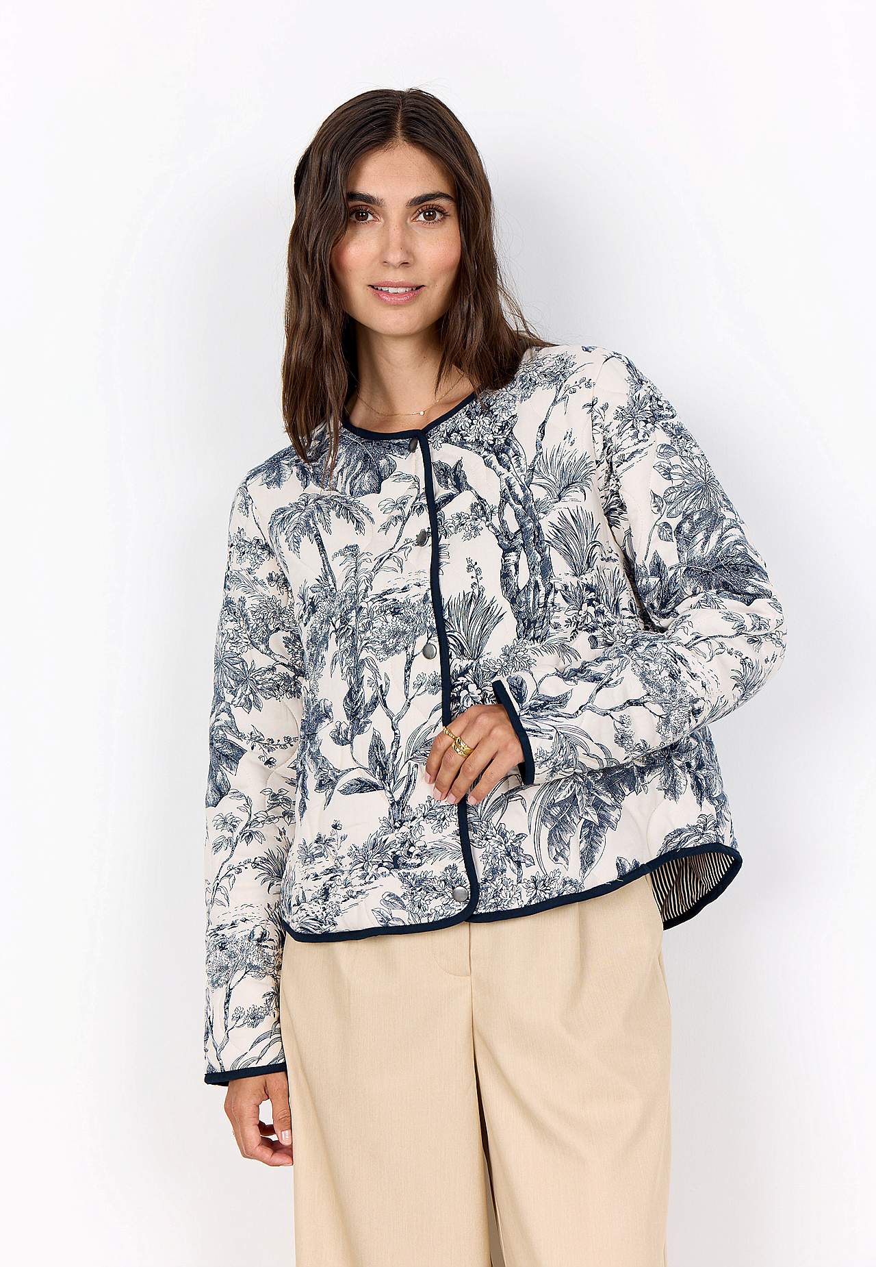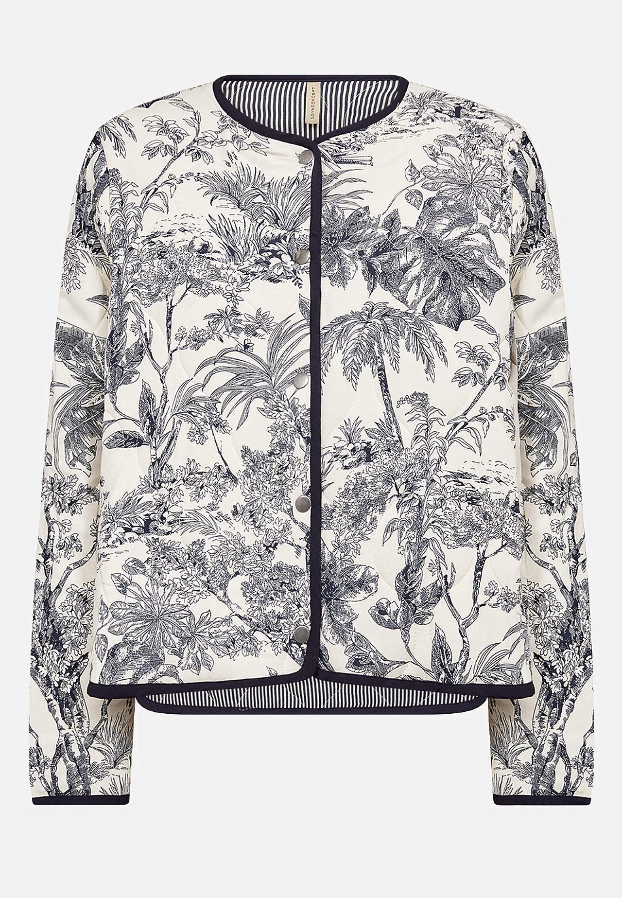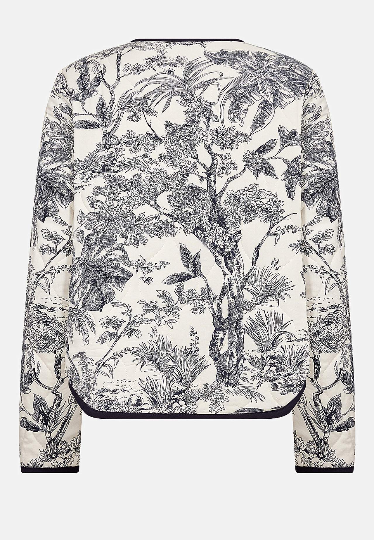 Vevd jakke med fin quilting og myk, lett vattering. Vendbar modell i fantastisk myk viskose. Mønster med palmetrær og blad og tynne striper på innsiden. Romslig, rett passform. Båndkantet, avrundet hals. Knappstolpe foran. Lange ermer med båndkantede ermeender. Avrundet, båndkantet fald. Lengde fra skulder ca. 56 cm i stør... Les mer