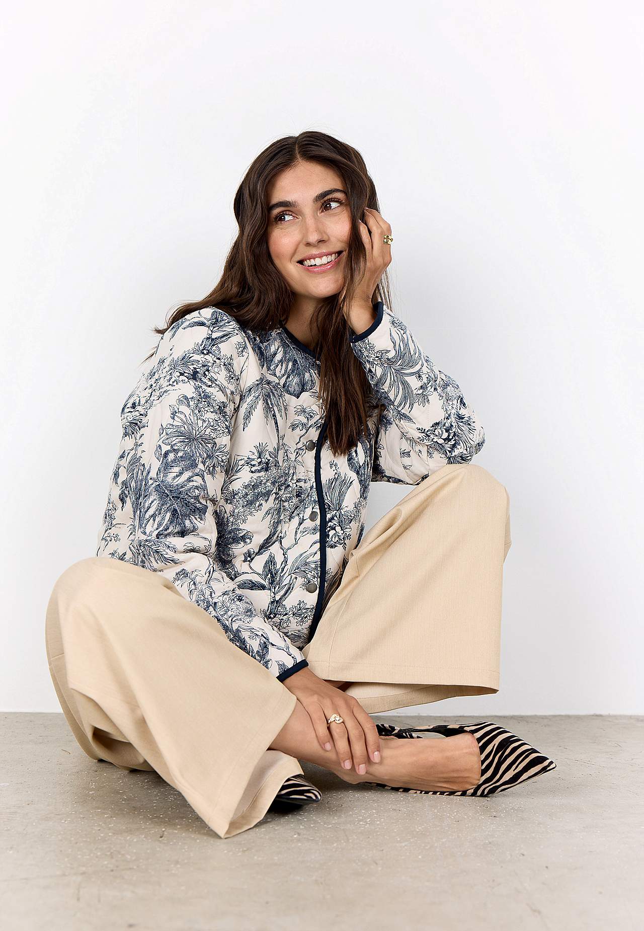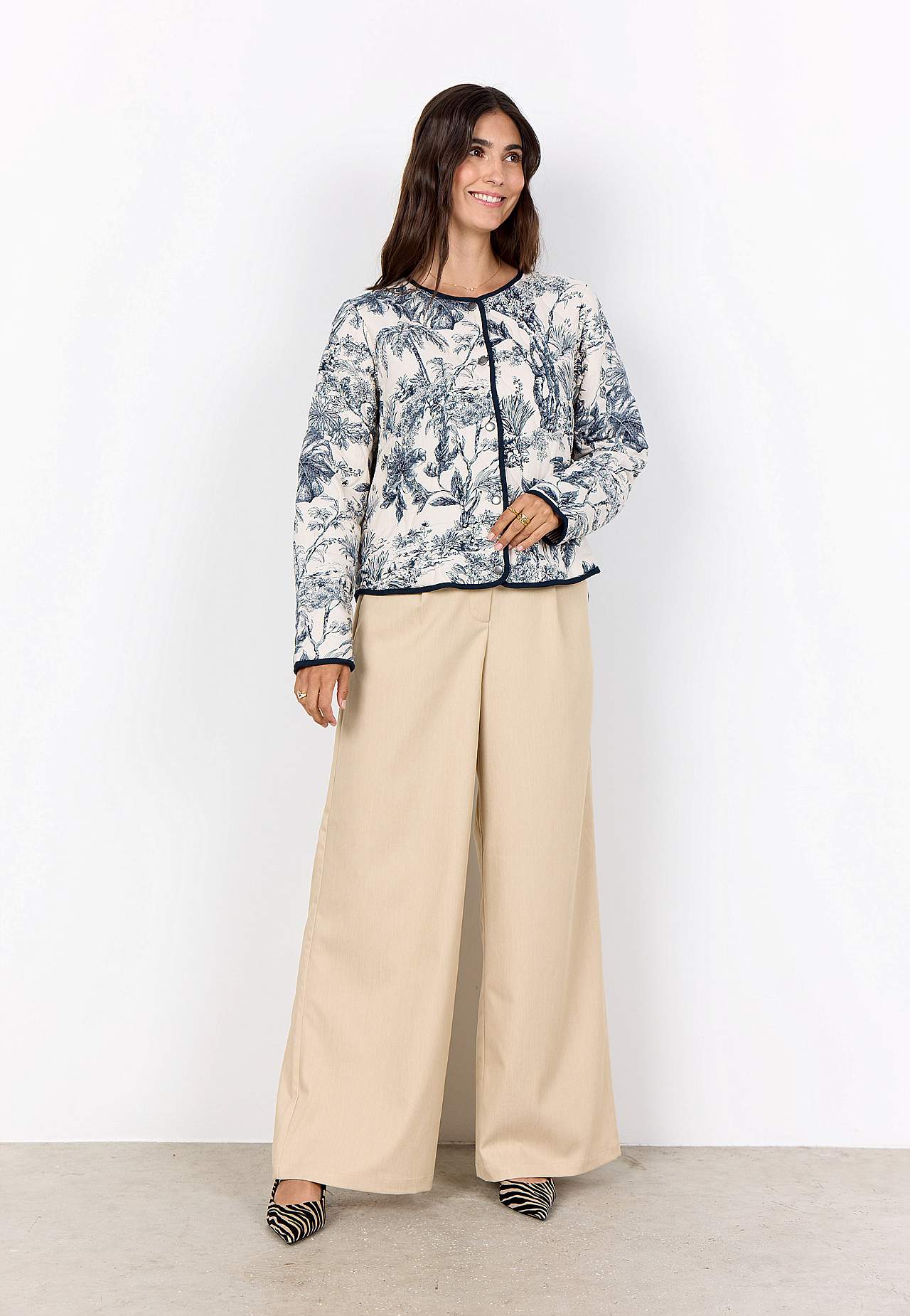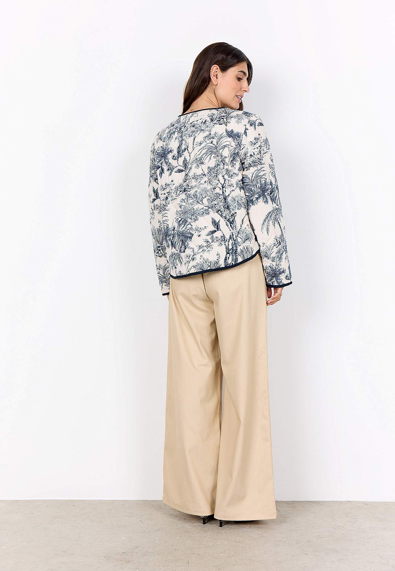 Vevd jakke med fin quilting og myk, lett vattering. Vendbar modell i fantastisk myk viskose. Mønster med palmetrær og blad og tynne striper på innsiden. Romslig, rett passform. Båndkantet, avrundet hals. Knappstolpe foran. Lange ermer med båndkantede ermeender. Avrundet, båndkantet fald. Lengde fra skulder ca. 56 cm i stør... Les mer