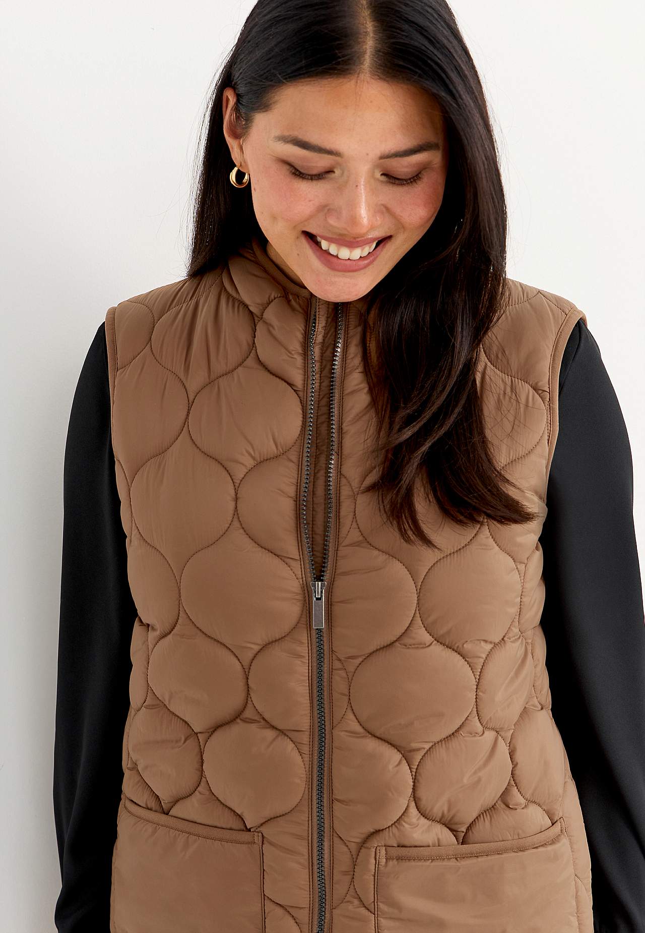 Vattert, lang vest med høy hals. Innerlomme med knappelukking. Store lommer foran. Lengden følger størrelsen, ca. 102-110 cm fra skulderen. To-veis glidelås.