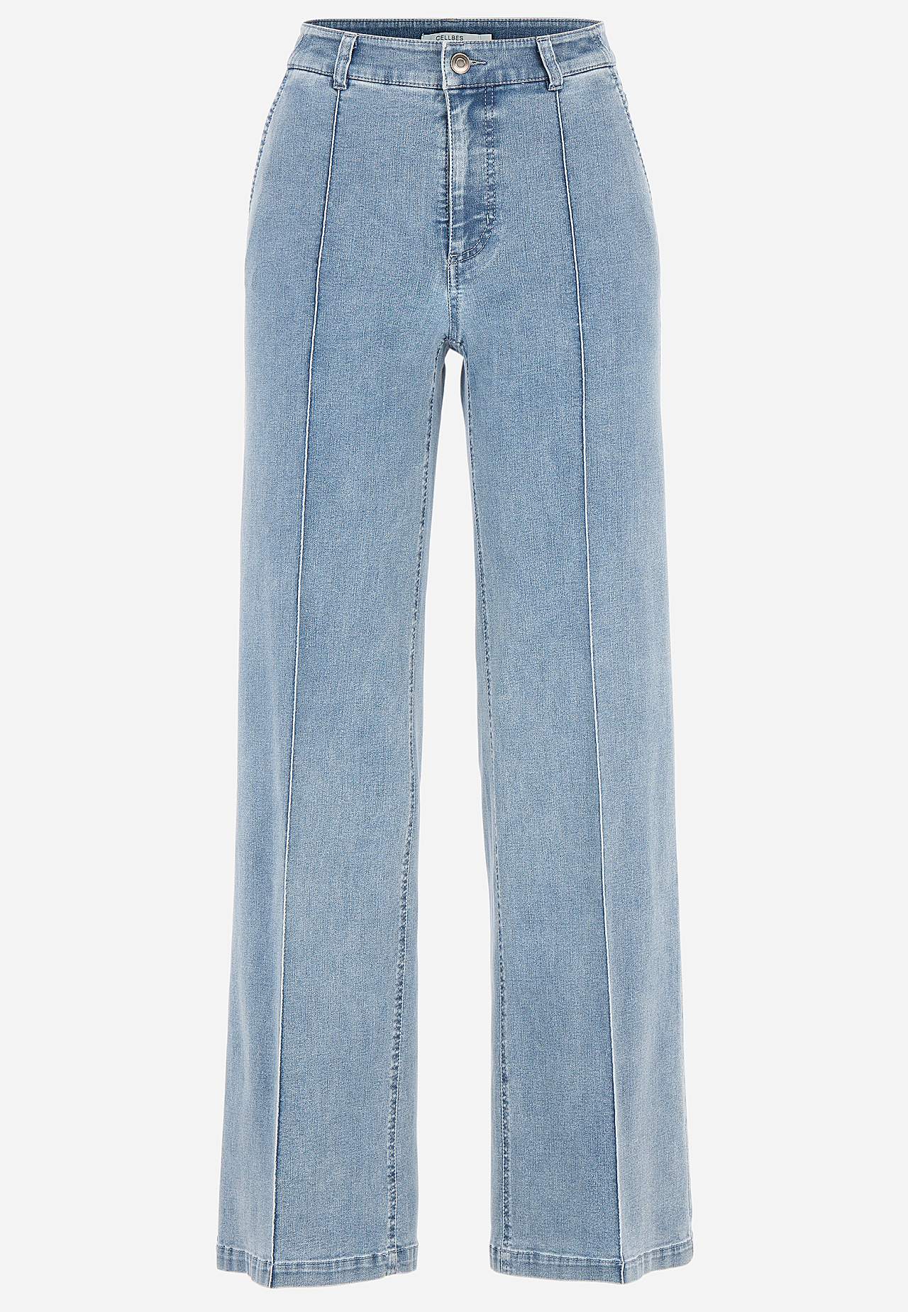 Jeans i stretchy denim. Sydd press foran. Normal midje. Rett design. Vide ben. Linning med beltestropper. Glidelås med knapp. Skråe sidelommer foran. To baklommer. Finnes i to lengder. To indre benlengder: Normal ca 80 cm. Lang ca 85 cm. Skritthøyde varierer i størrelse: omtrent 25-35 cm.