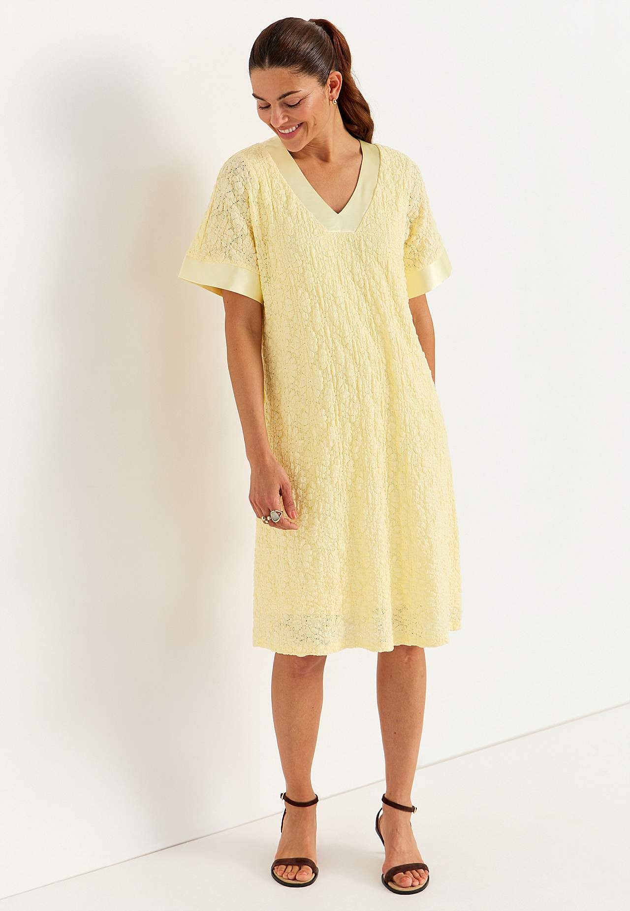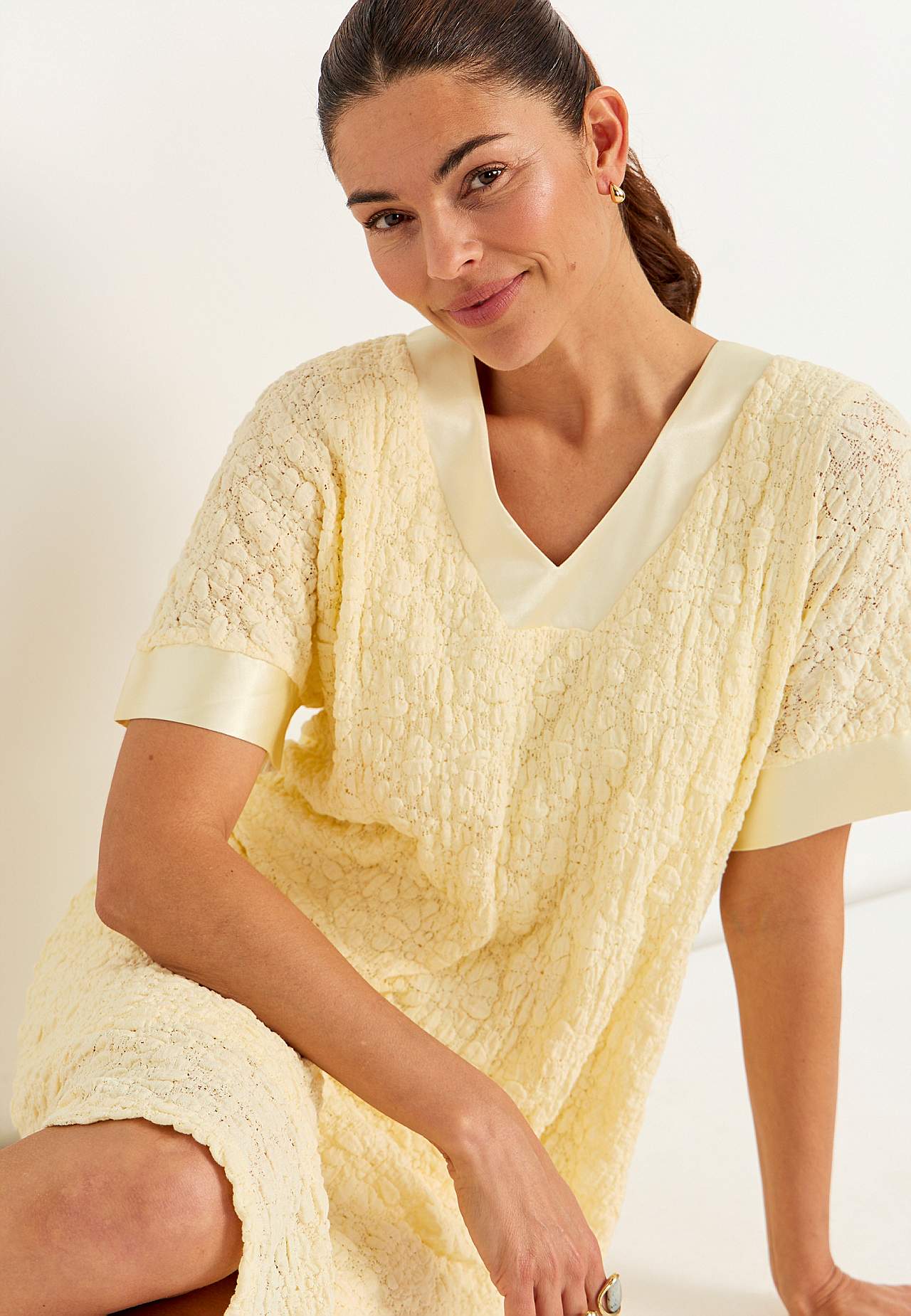 Fôret festkjole i nydelig, stretchy trikot med blonder. Elegant satengkant på halslinjen og på enden av ermene. Myk, stretchy fôring i jersey. Litt a-linjeformet, oversize passform med litt nettere øvre del. V-ringning med satengkant. Vidt, ufôret kaftanerme med satengkant på enden av ermene. Rett fald. Lengden følger størr... Les mer