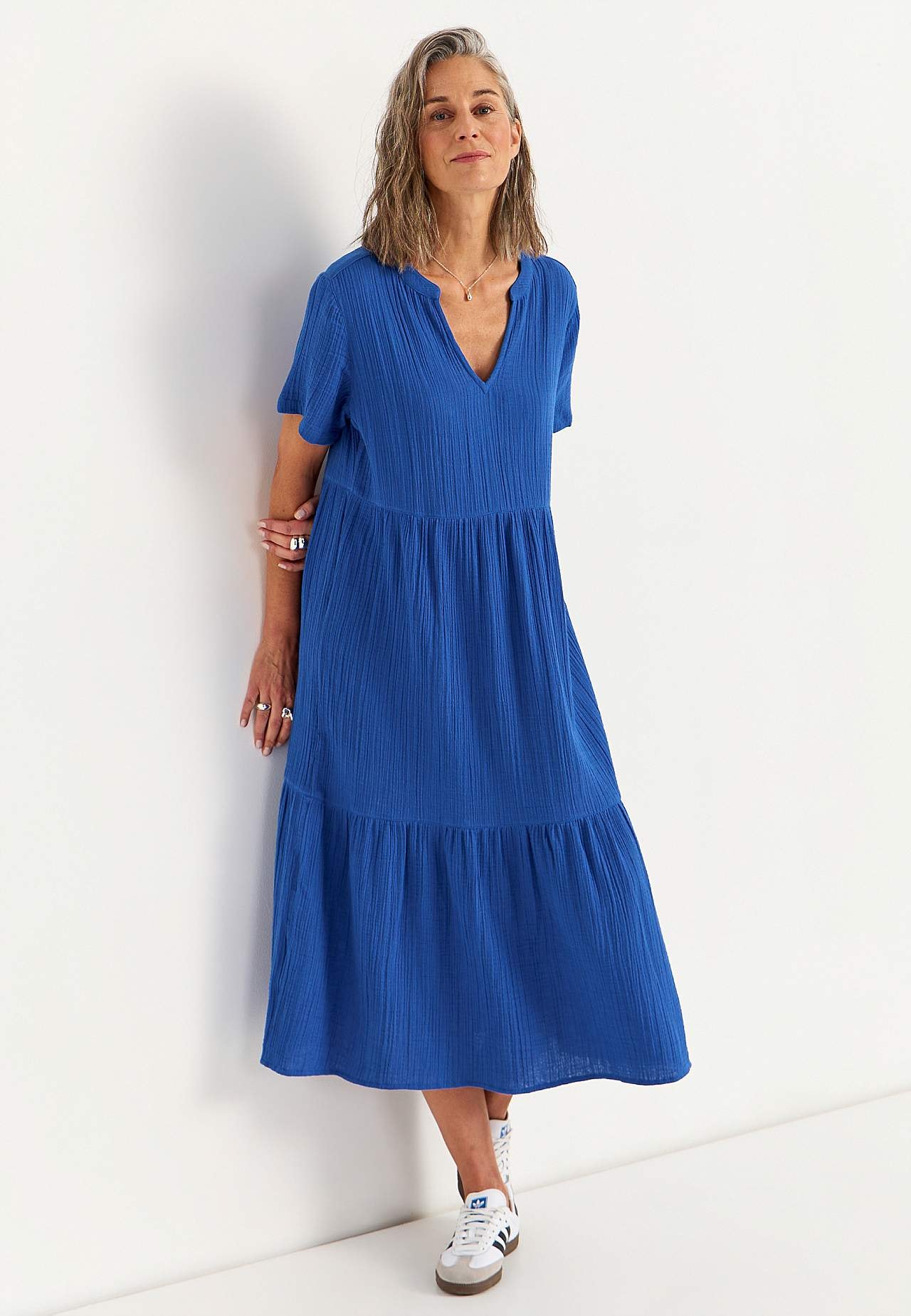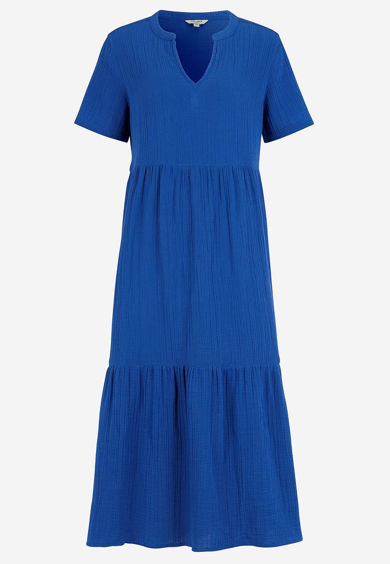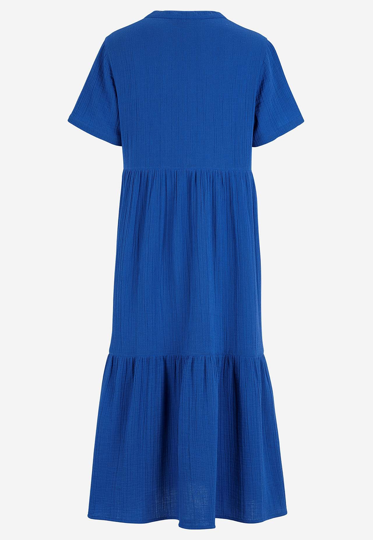 Volangkjole i nydelig bomullsmusselin med naturlig struktur. Vevet, mykt materiale med luftig, kjølende følelse. Romslig passform med vidde nederst. Rund hals med lite v-hals snitt. Korte ermer. Søm i midjen. Volang nederst. Rett fald. Rygglengden følger størrelsen, ca. 125 cm.