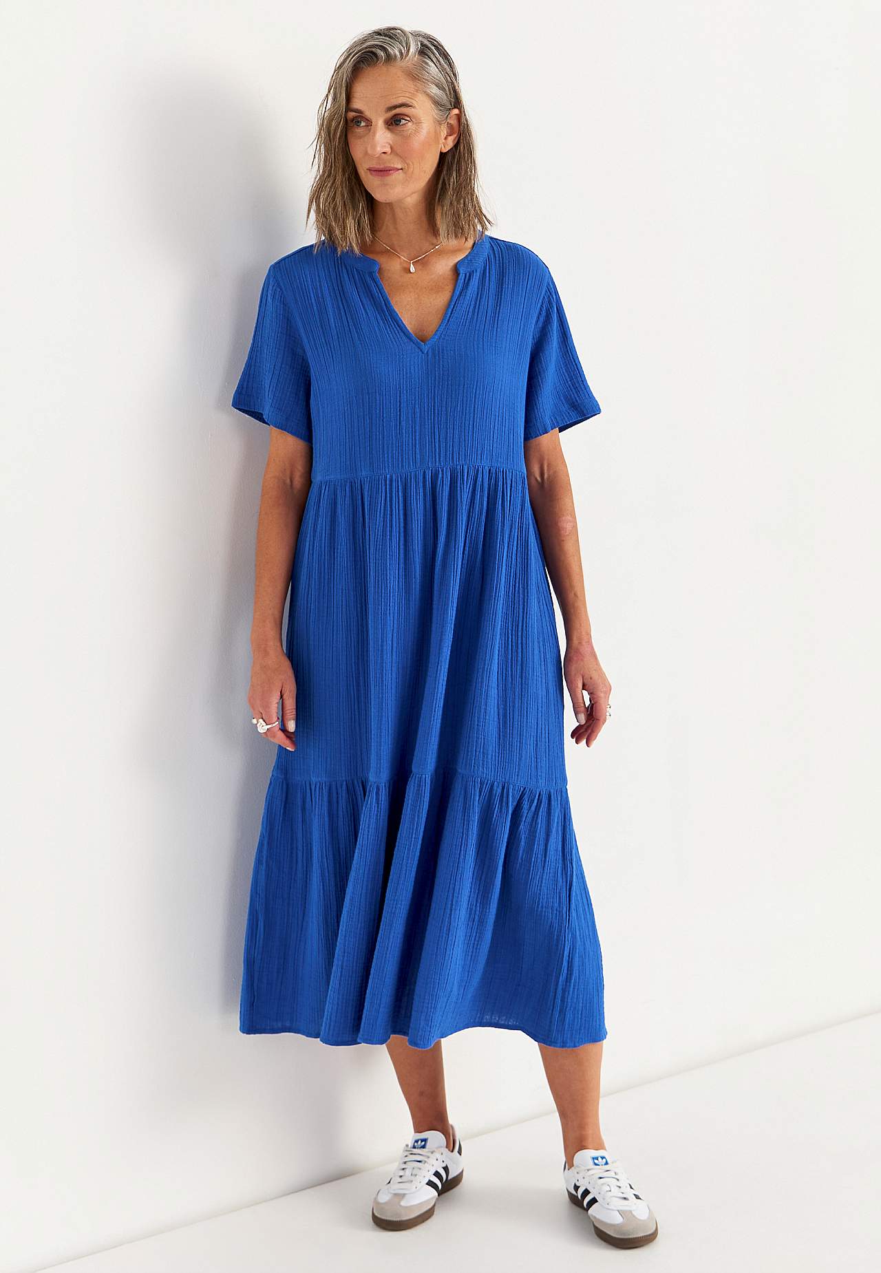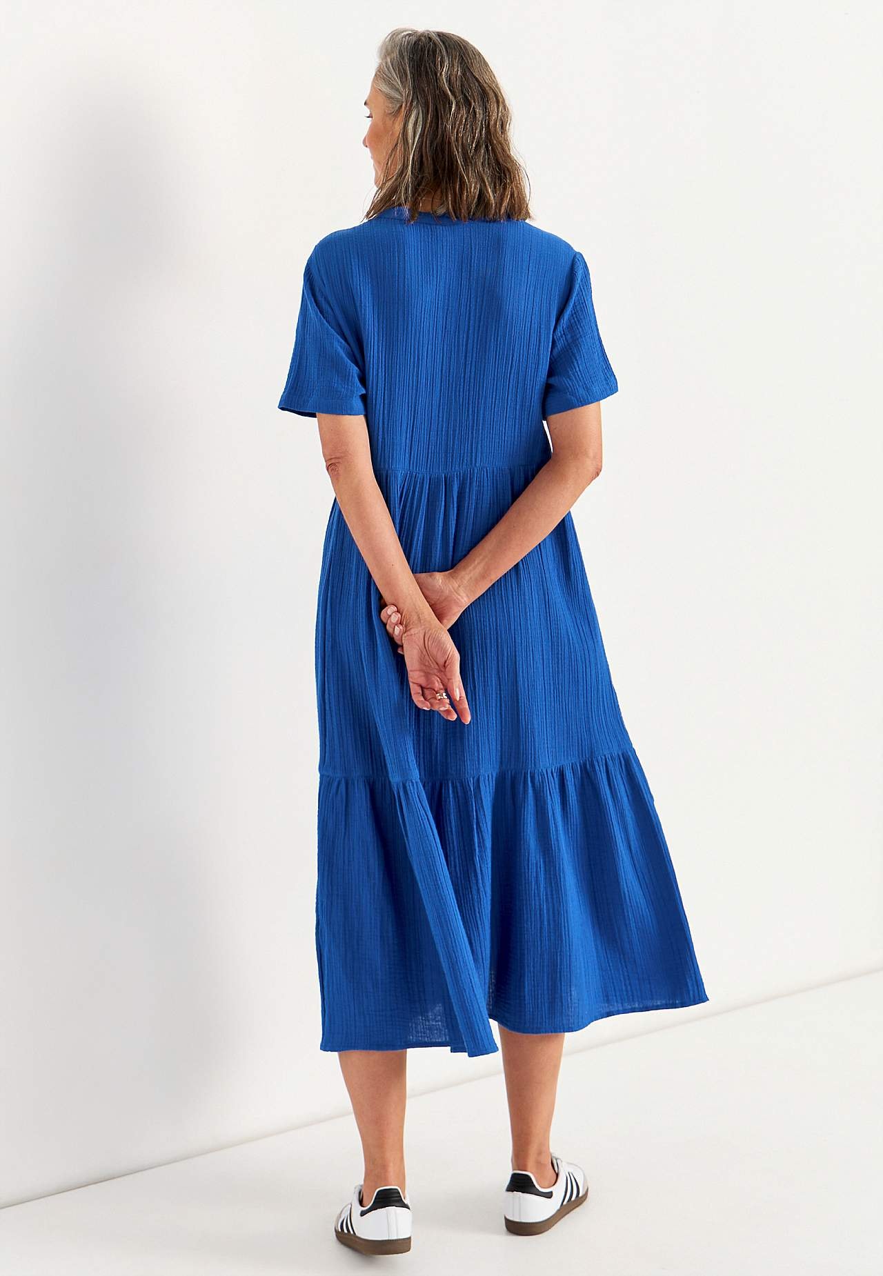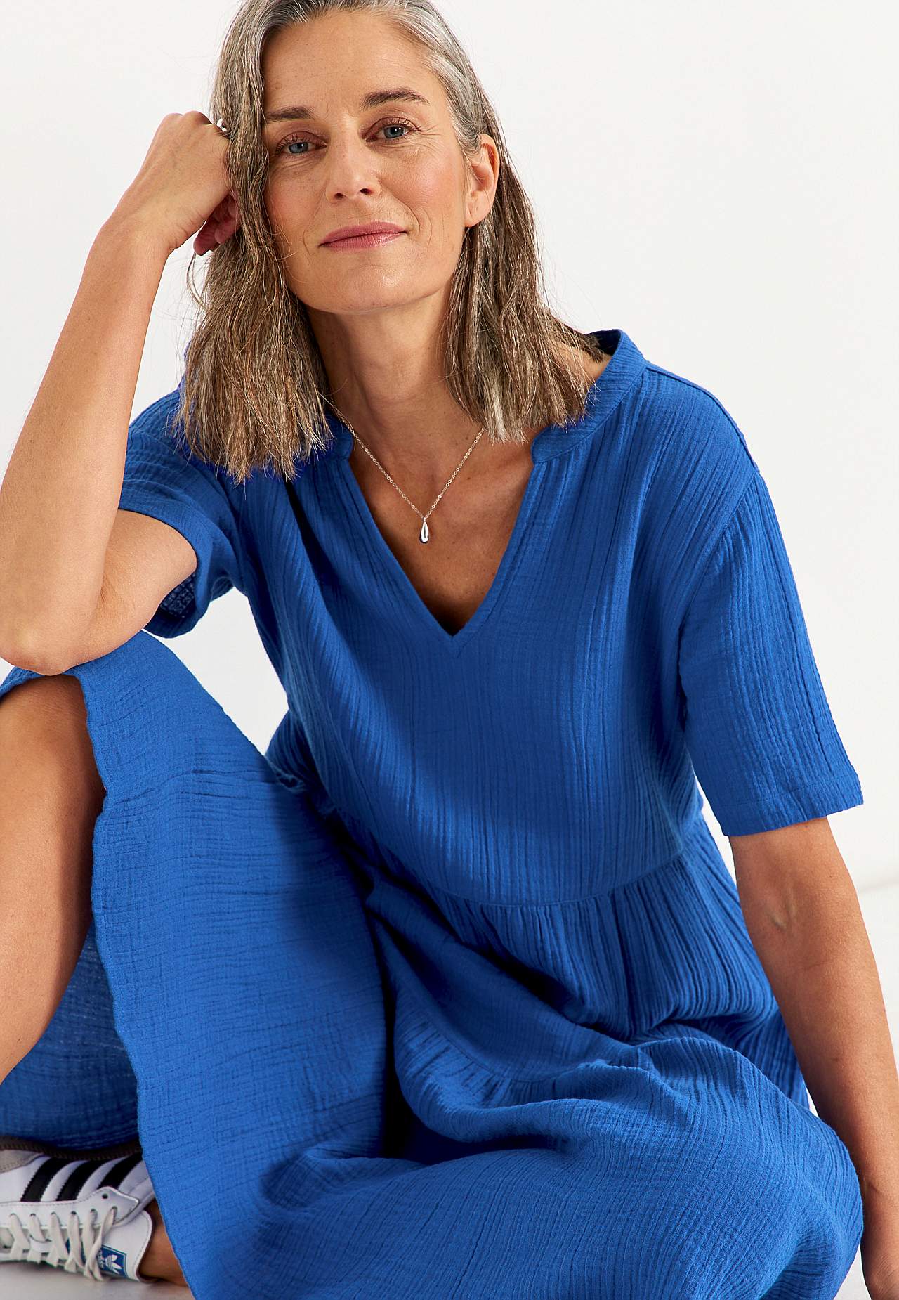 Volangkjole i nydelig bomullsmusselin med naturlig struktur. Vevet, mykt materiale med luftig, kjølende følelse. Romslig passform med vidde nederst. Rund hals med lite v-hals snitt. Korte ermer. Søm i midjen. Volang nederst. Rett fald. Rygglengden følger størrelsen, ca. 125 cm.