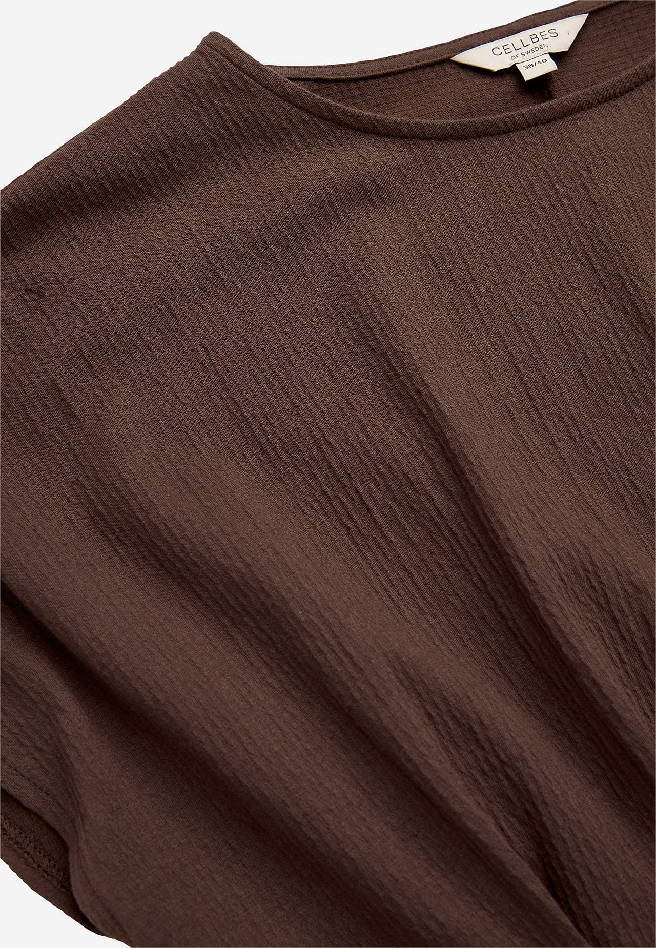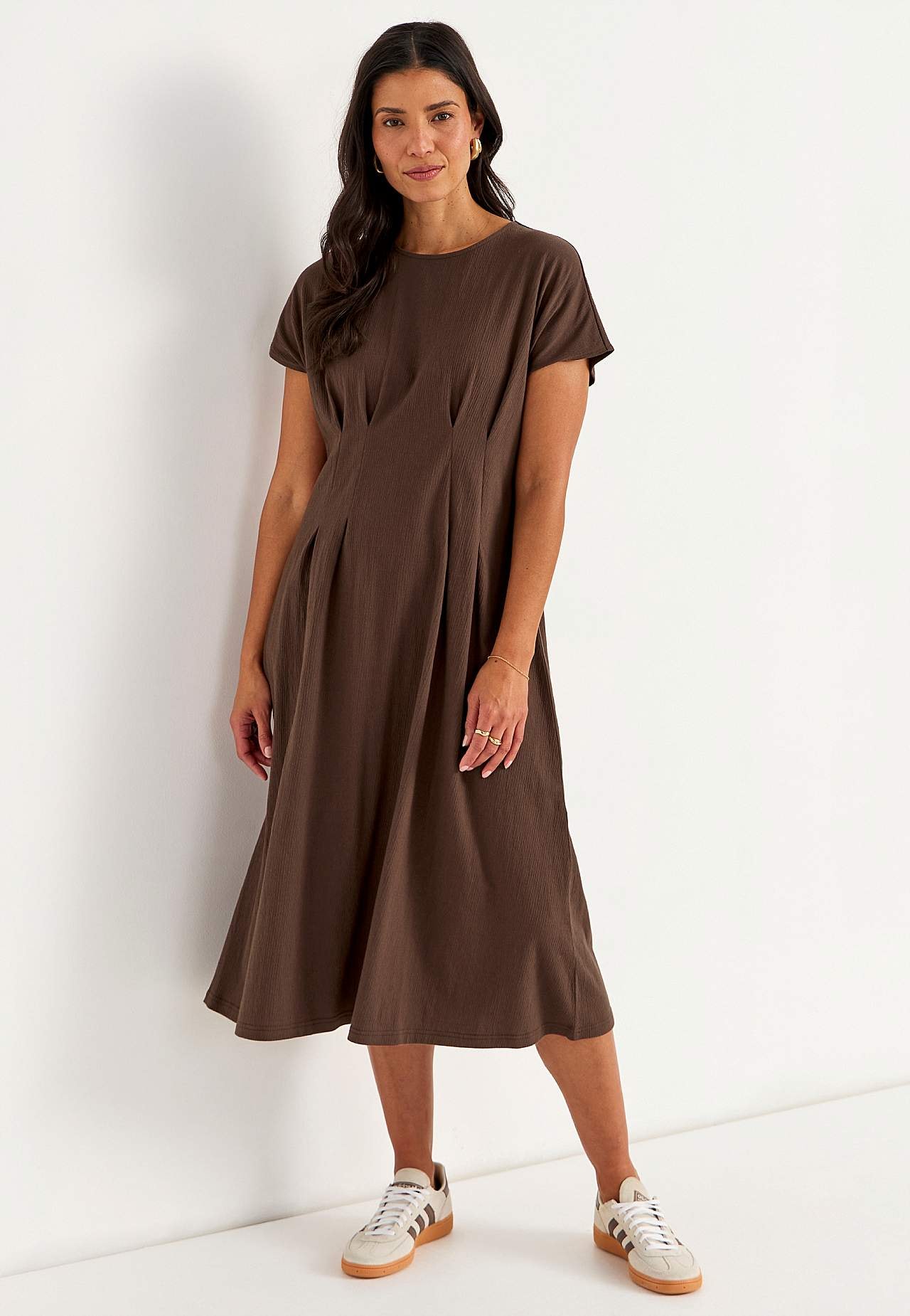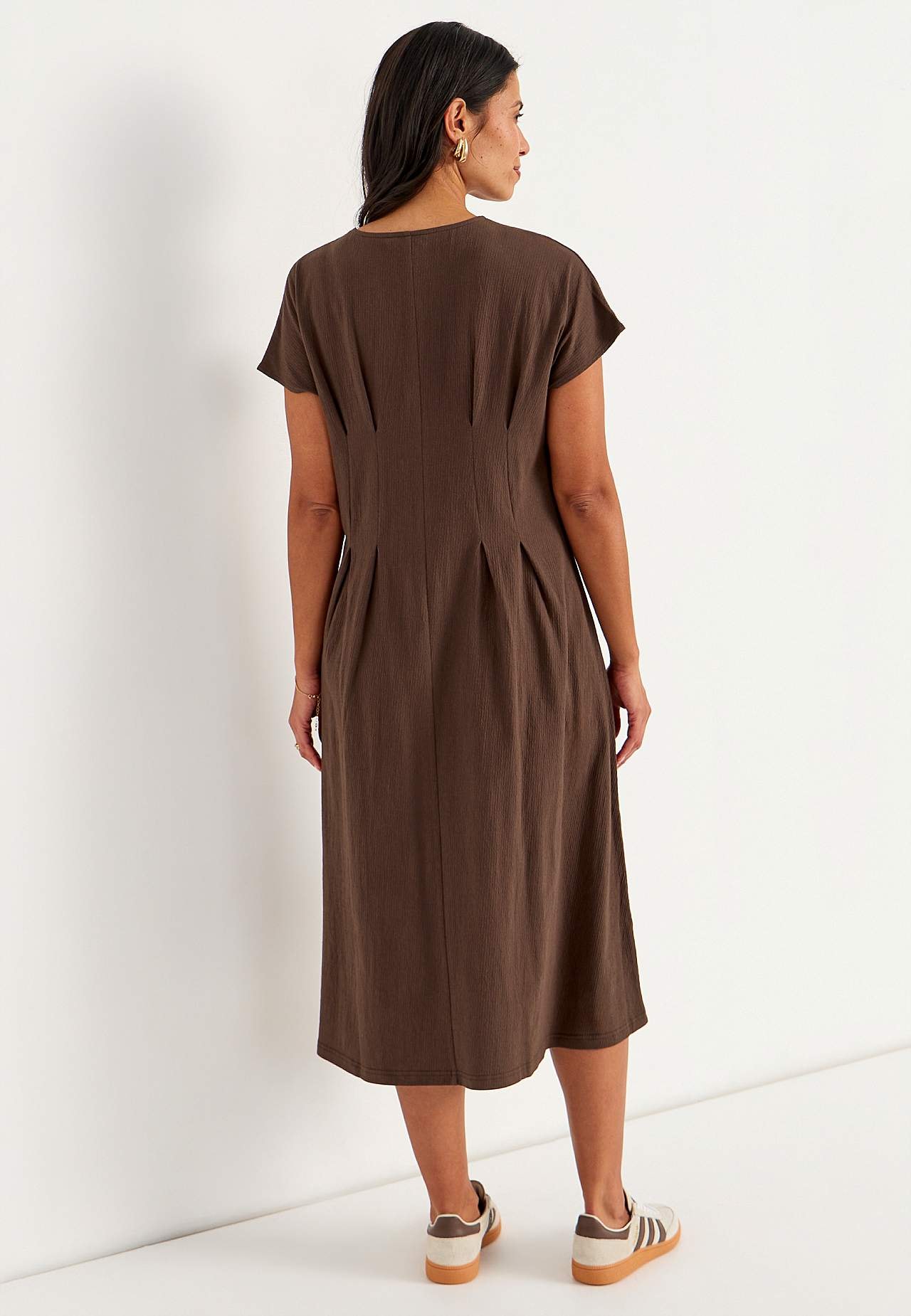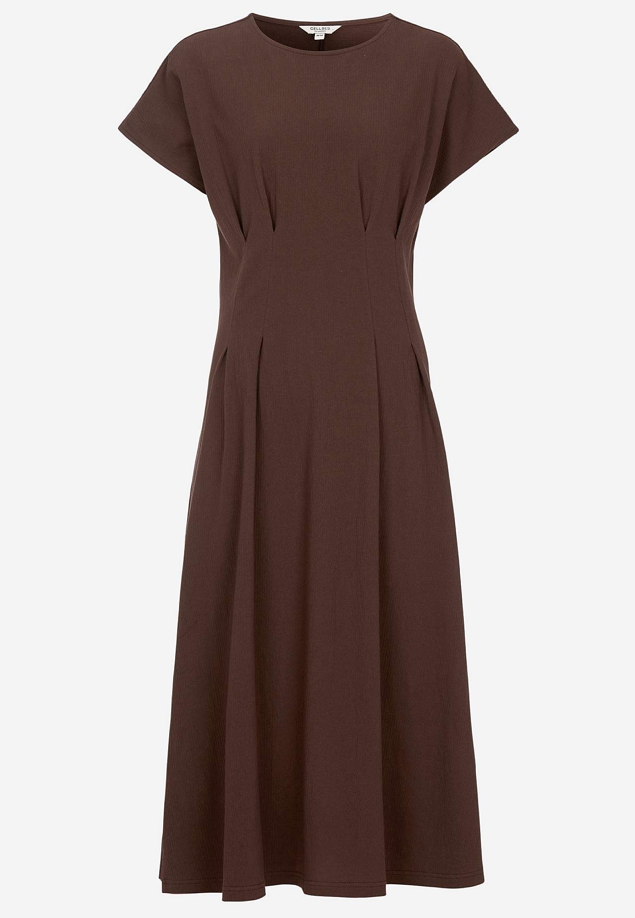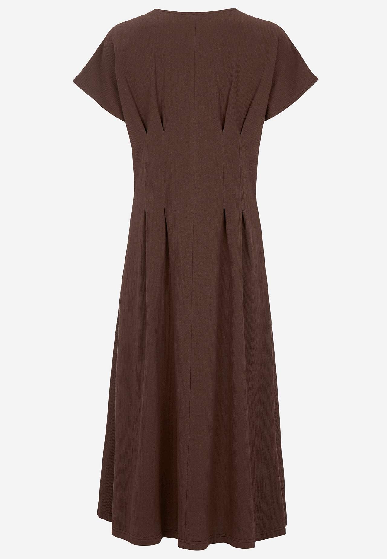 Feminin Jersey-kjole med bølget struktur. Mykt, stretchy materiale. Normal passform med utsvingt skjørtedel. Definert midje med figursmigrende innsnitt både foran og bak. Avrundet hals. Korte korte ermer. Lett avrundet fald. Rygglengden følger størrelsen, ca. 122 cm.