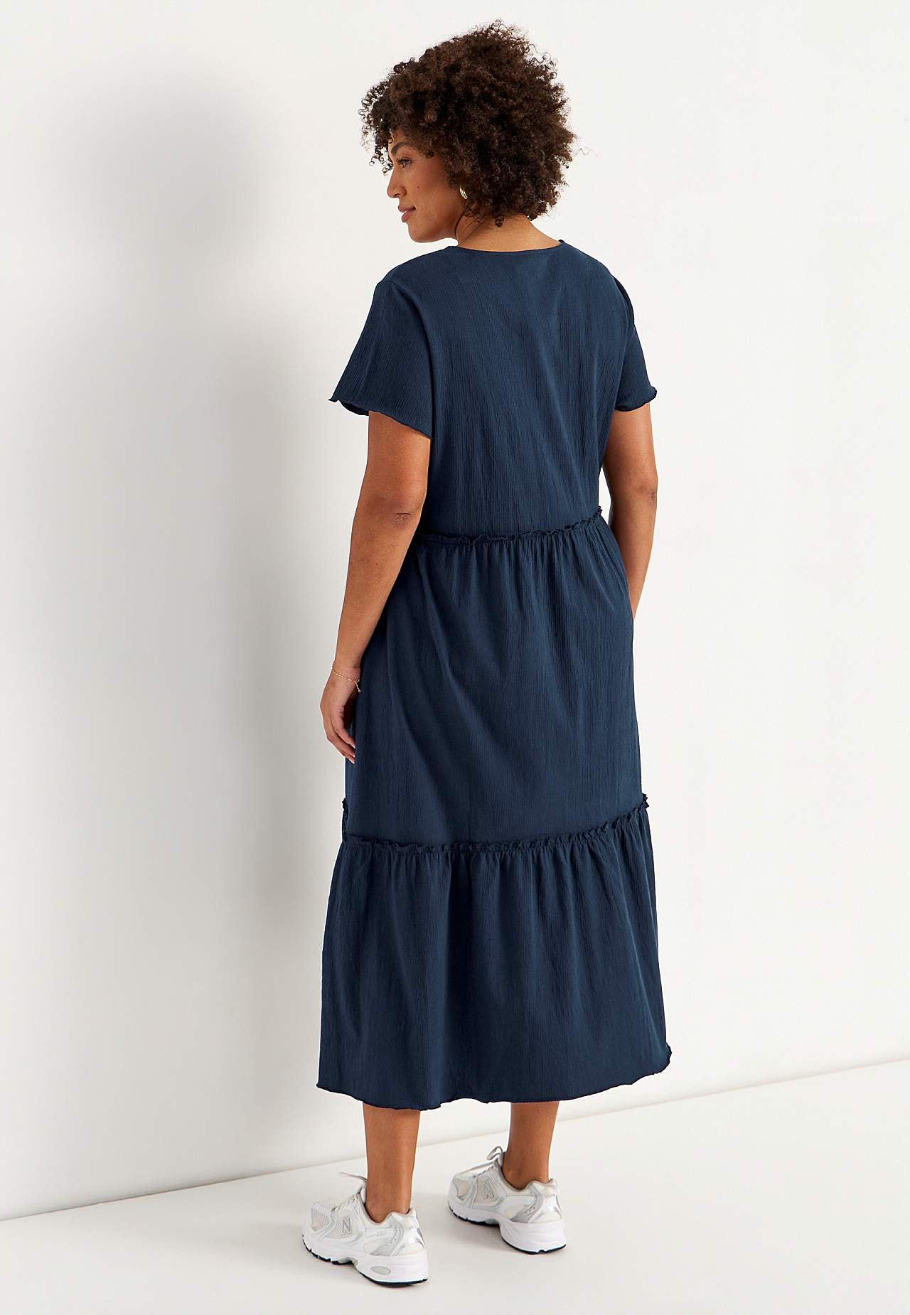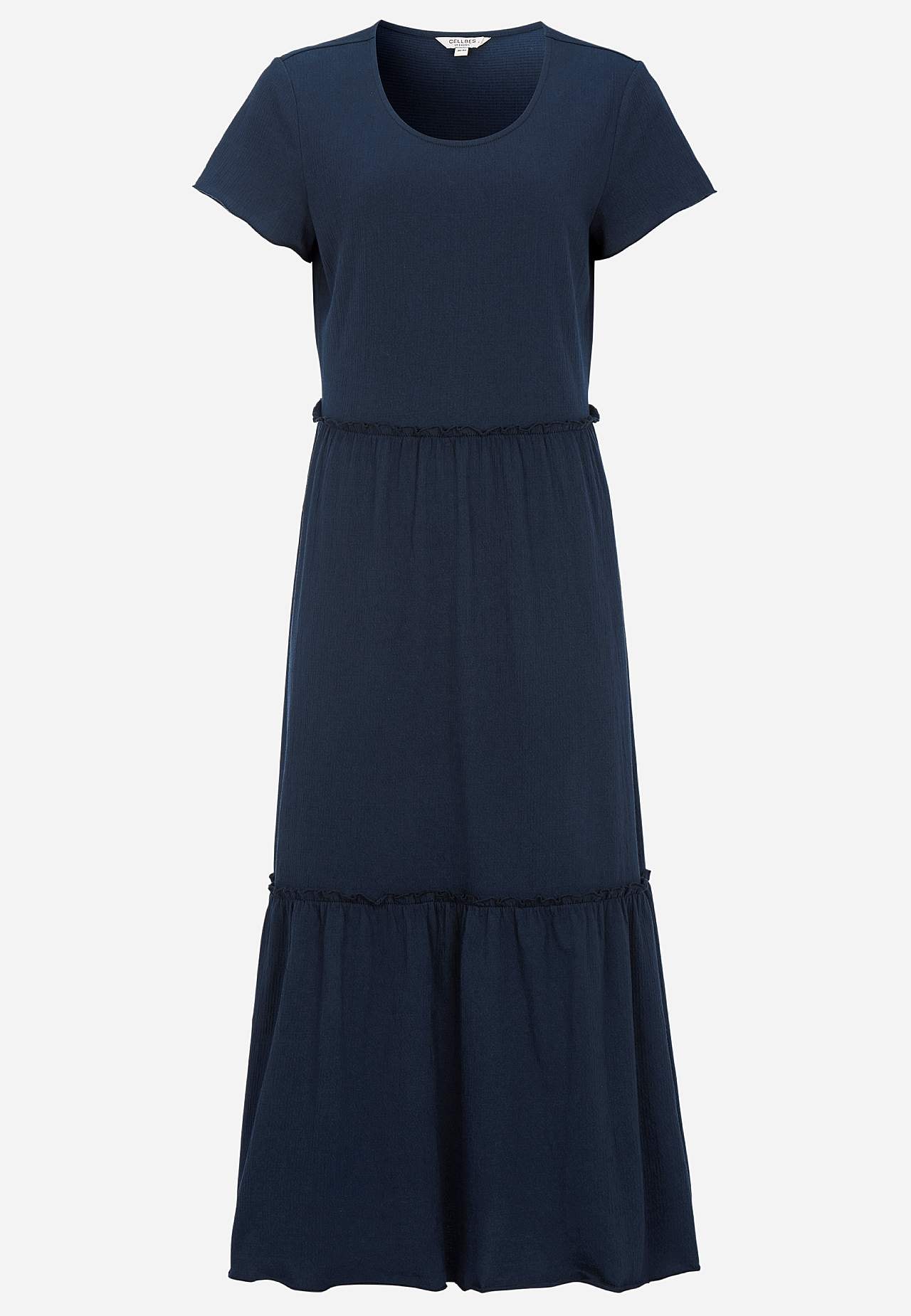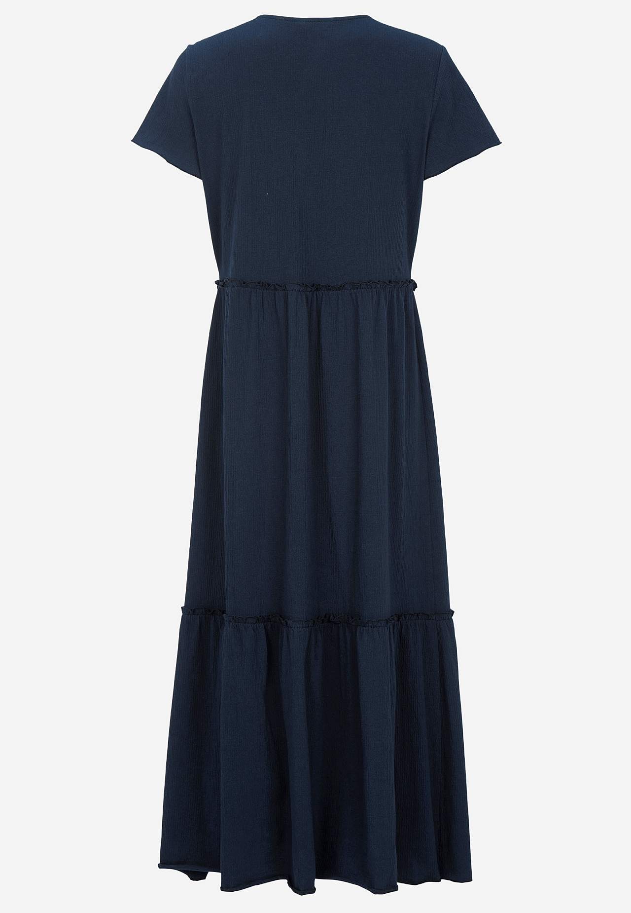 Stretchy, myk volangkjole med bølget struktur. Casual, a-linjeformet passform. Skjørtedel med nydelig vidde. Overlocked, bølget, tynn søm nederst, på volangkanten og i ermeslutten. Avrundet hals. Korte korte ermer. Lett avrundet fald. Rygglengde er ca. 128 cm i alle størrelser.