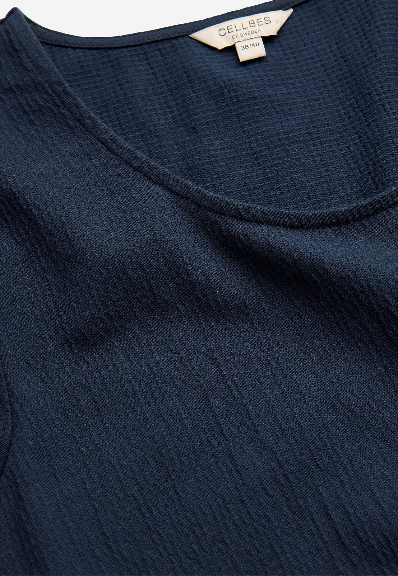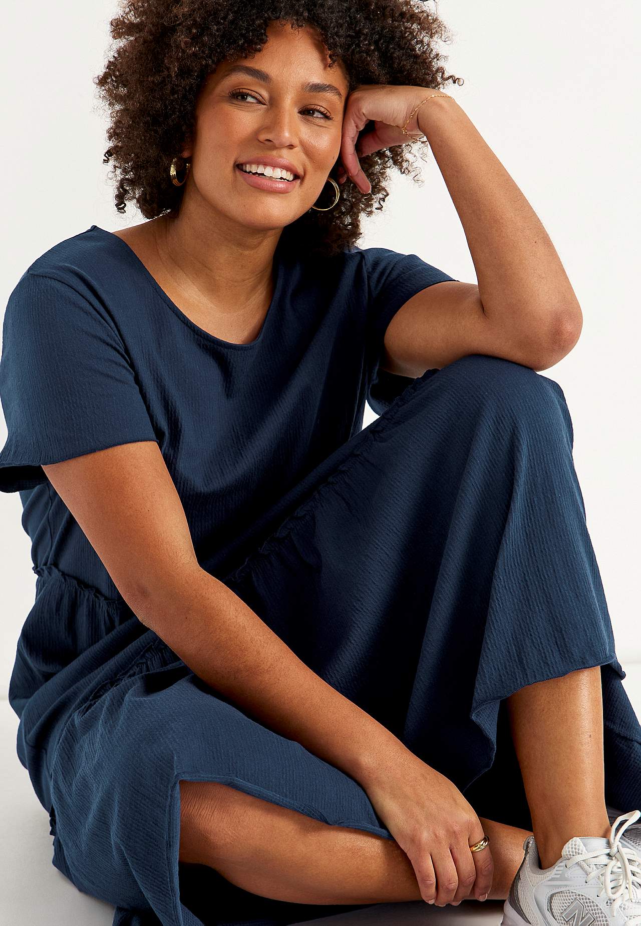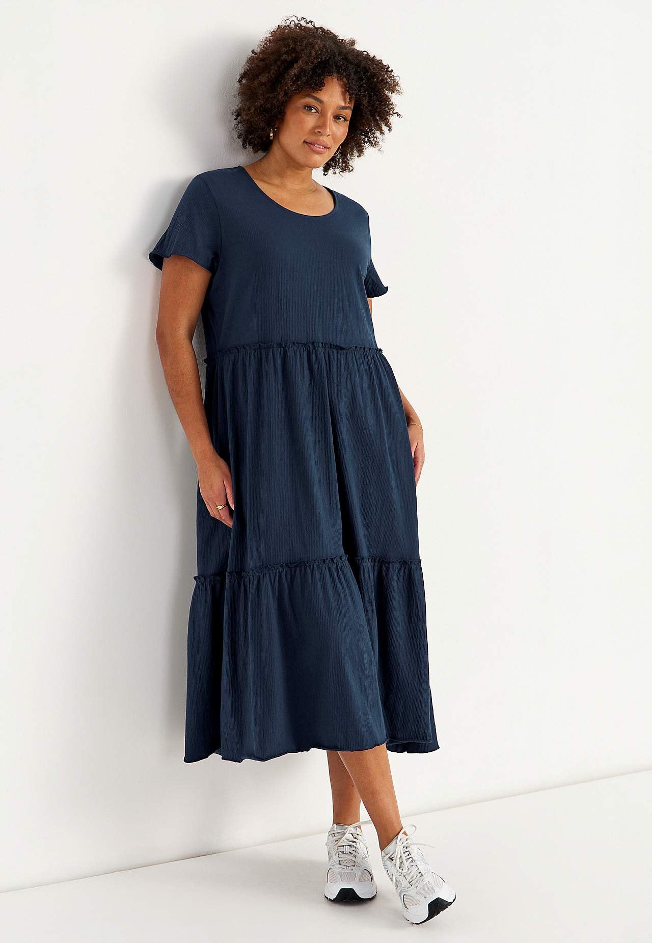 Stretchy, myk volangkjole med bølget struktur. Casual, a-linjeformet passform. Skjørtedel med nydelig vidde. Overlocked, bølget, tynn søm nederst, på volangkanten og i ermeslutten. Avrundet hals. Korte korte ermer. Lett avrundet fald. Rygglengde er ca. 128 cm i alle størrelser.