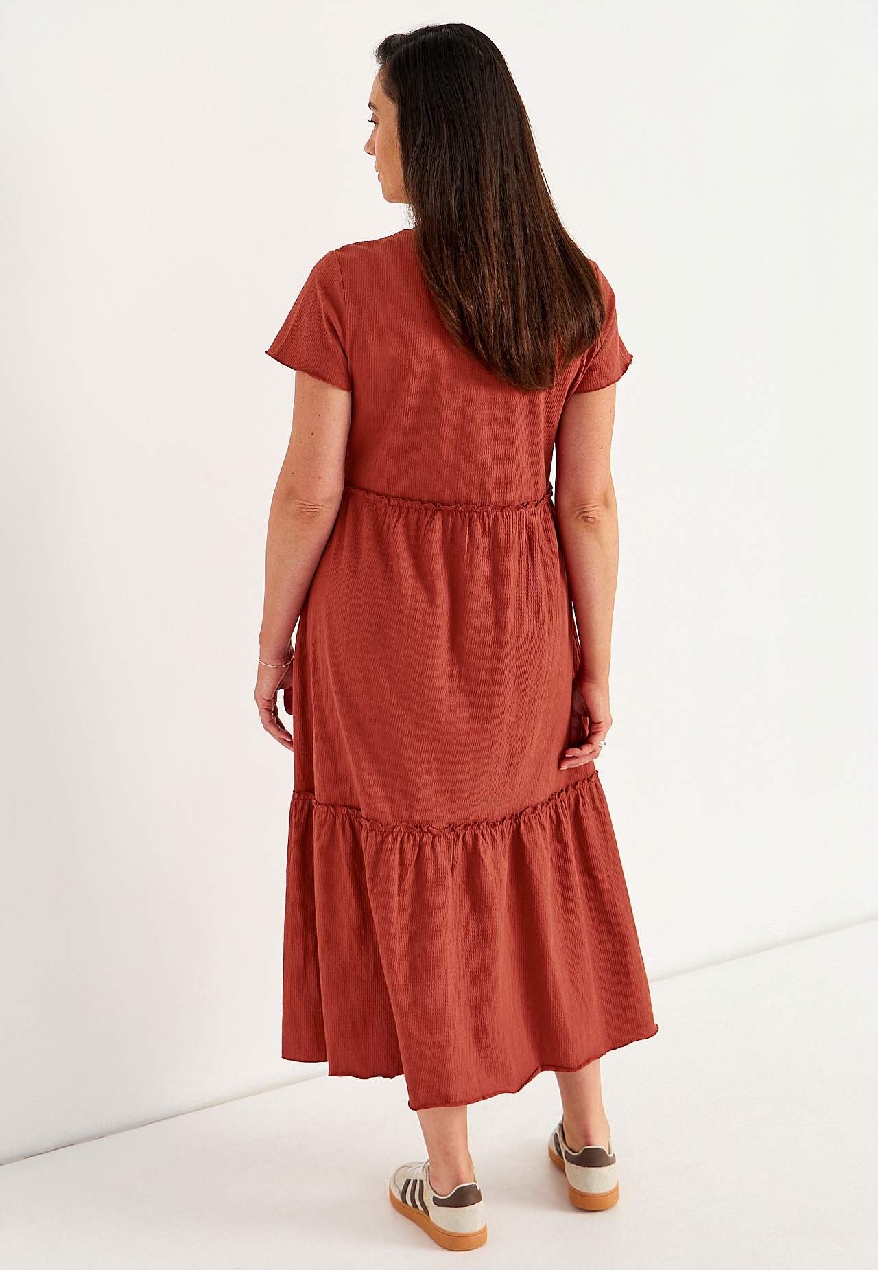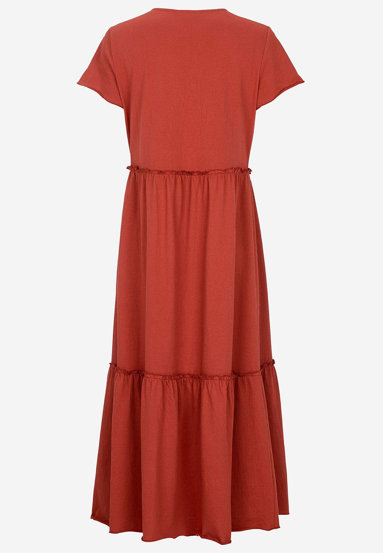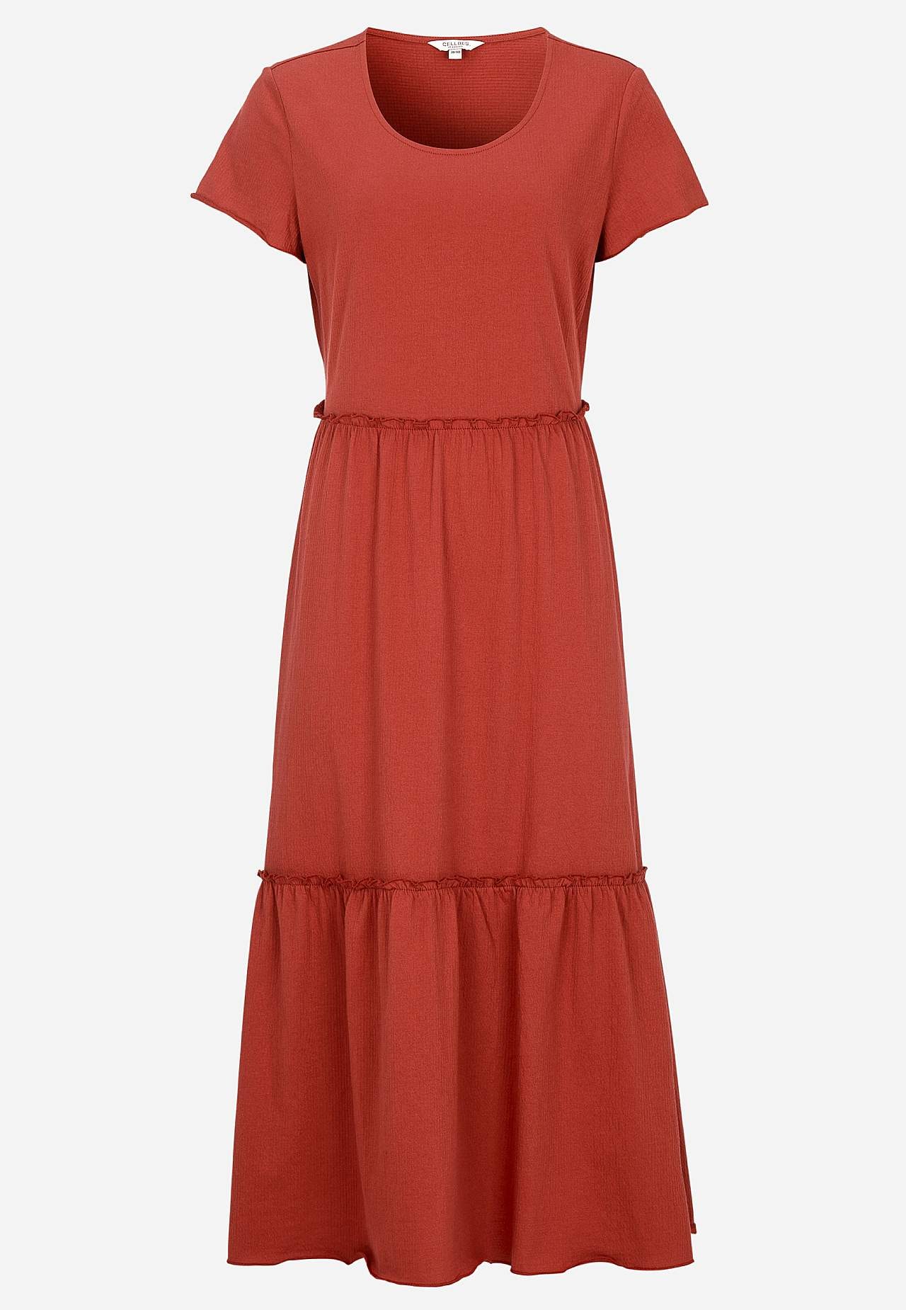 Stretchy, myk volangkjole med bølget struktur. Casual, a-linjeformet passform. Skjørtedel med nydelig vidde. Overlocked, bølget, tynn søm nederst, på volangkanten og i ermeslutten. Avrundet hals. Korte korte ermer. Lett avrundet fald. Rygglengde er ca. 128 cm i alle størrelser.