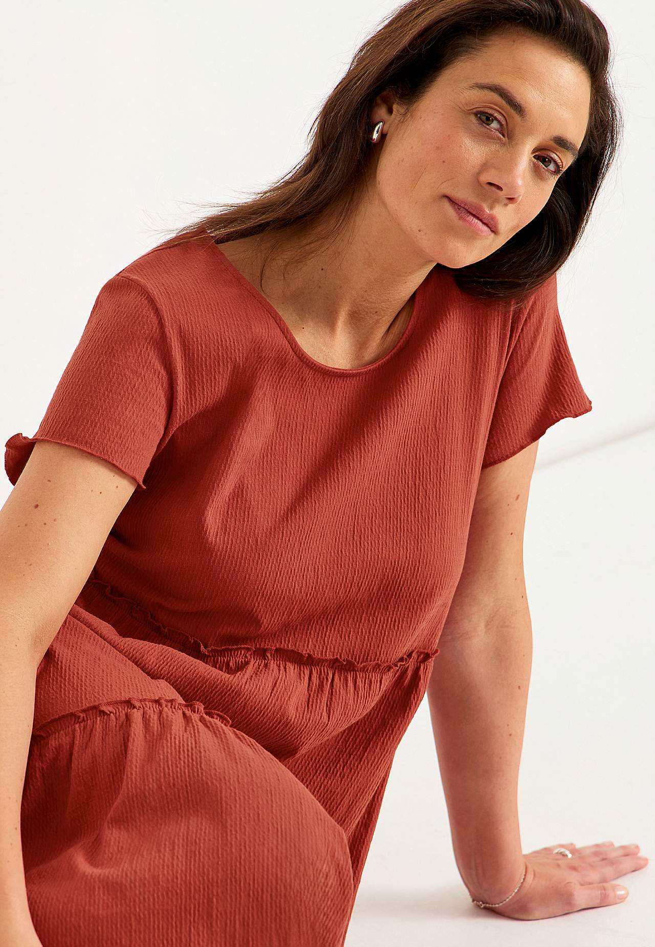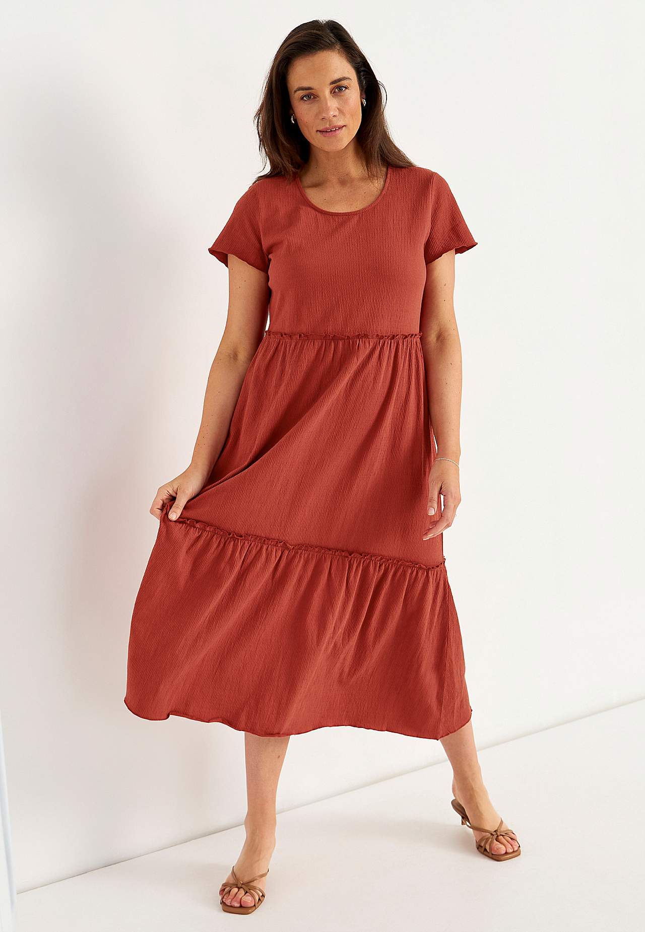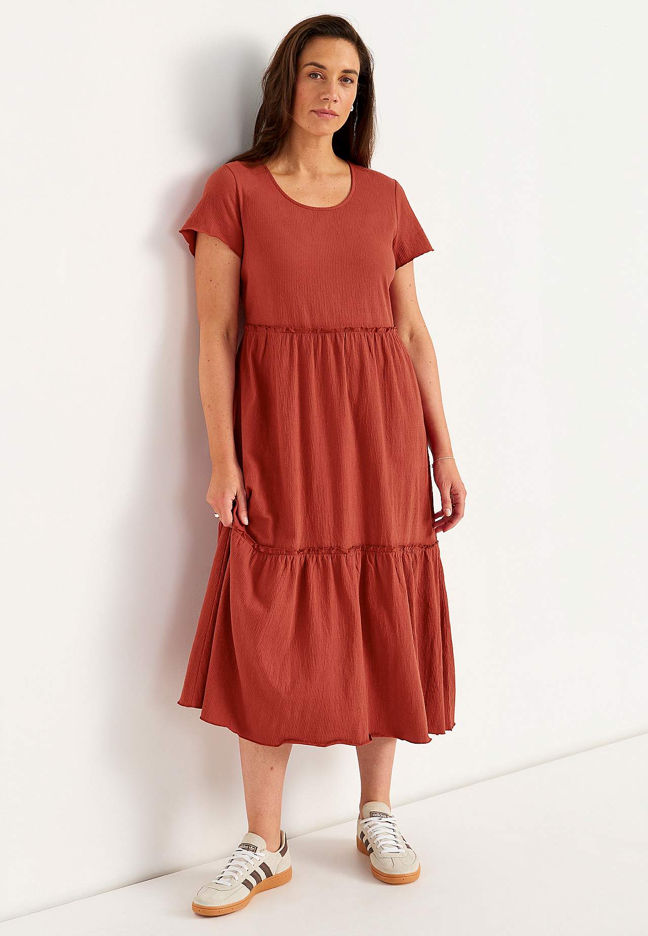 Stretchy, myk volangkjole med bølget struktur. Casual, a-linjeformet passform. Skjørtedel med nydelig vidde. Overlocked, bølget, tynn søm nederst, på volangkanten og i ermeslutten. Avrundet hals. Korte korte ermer. Lett avrundet fald. Rygglengde er ca. 128 cm i alle størrelser.