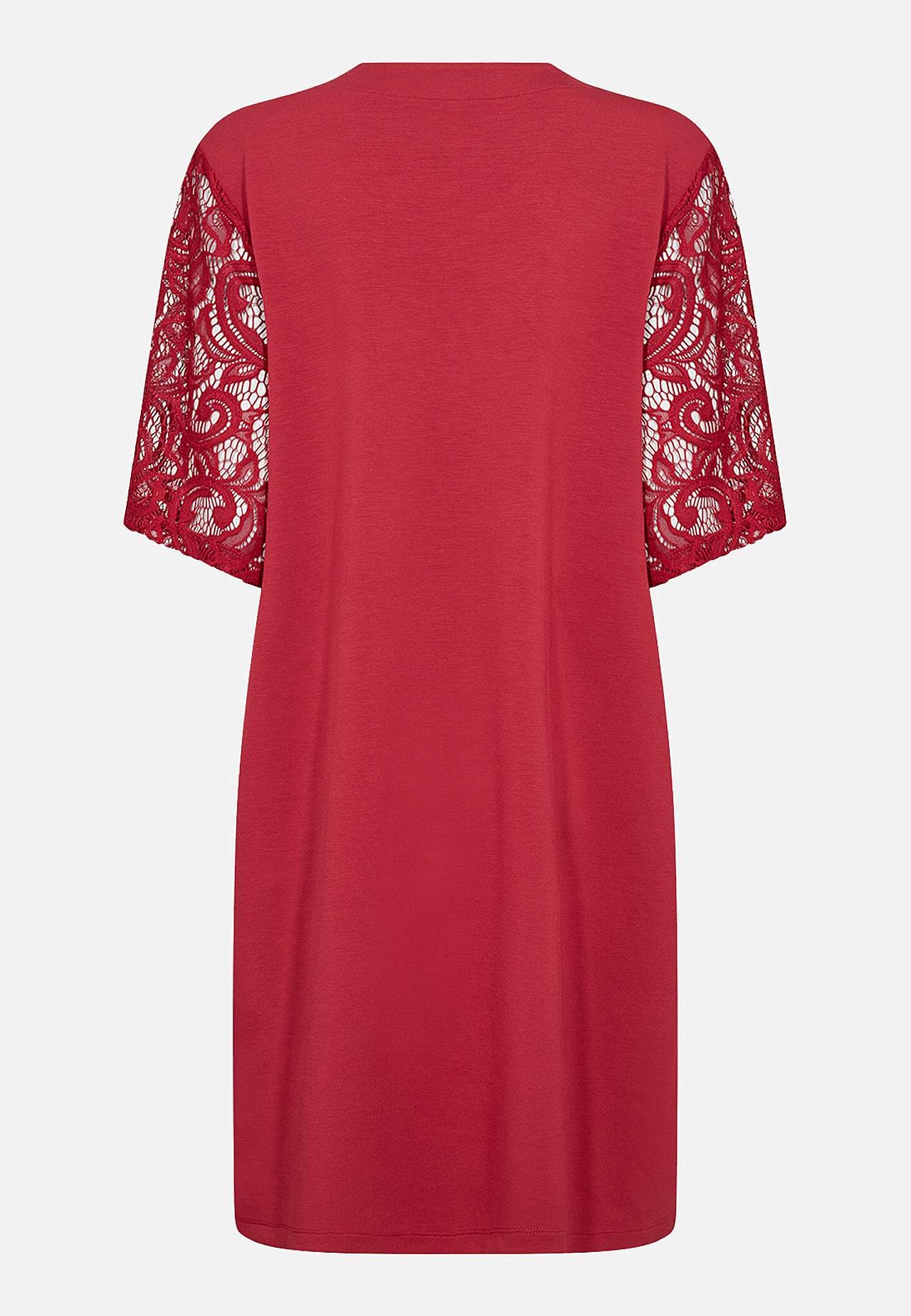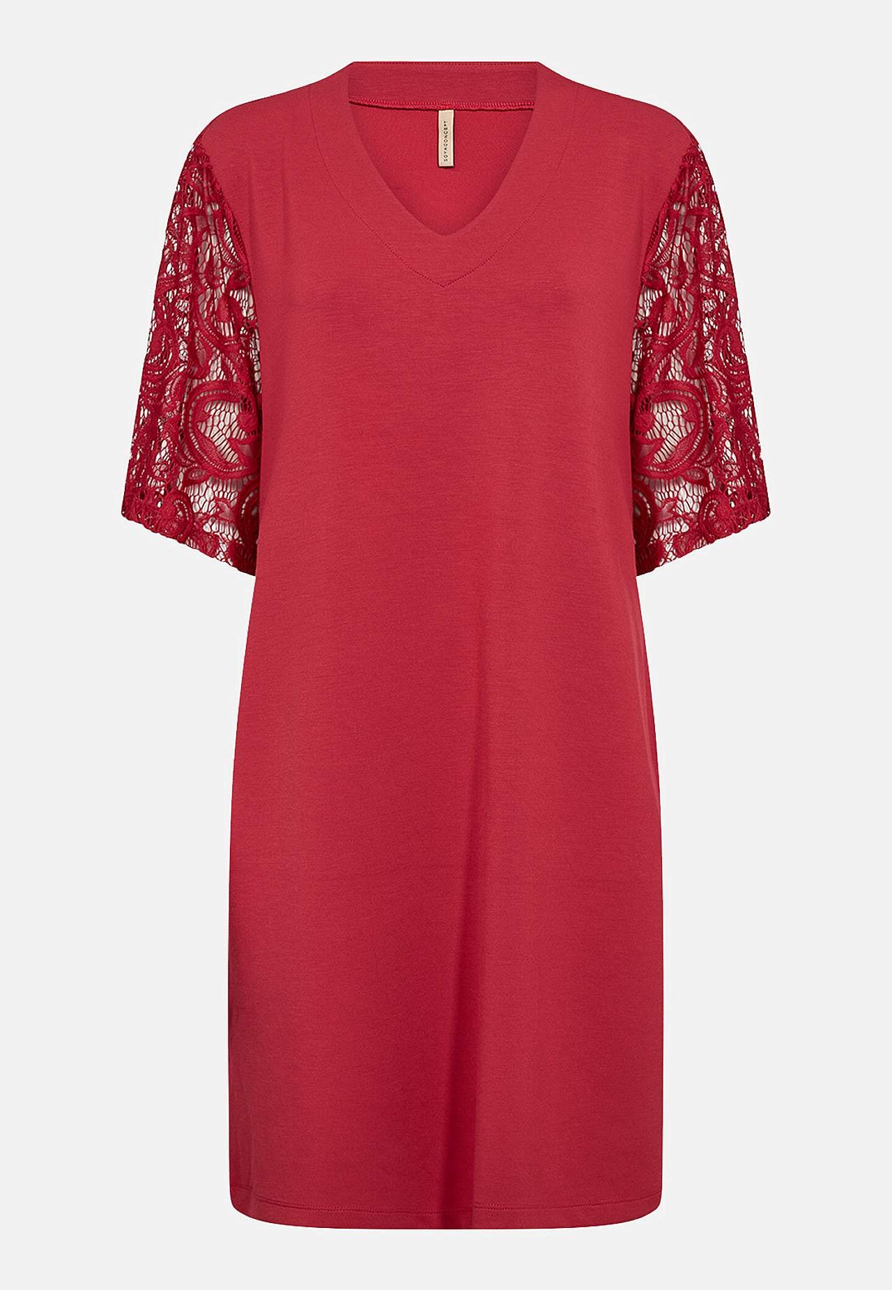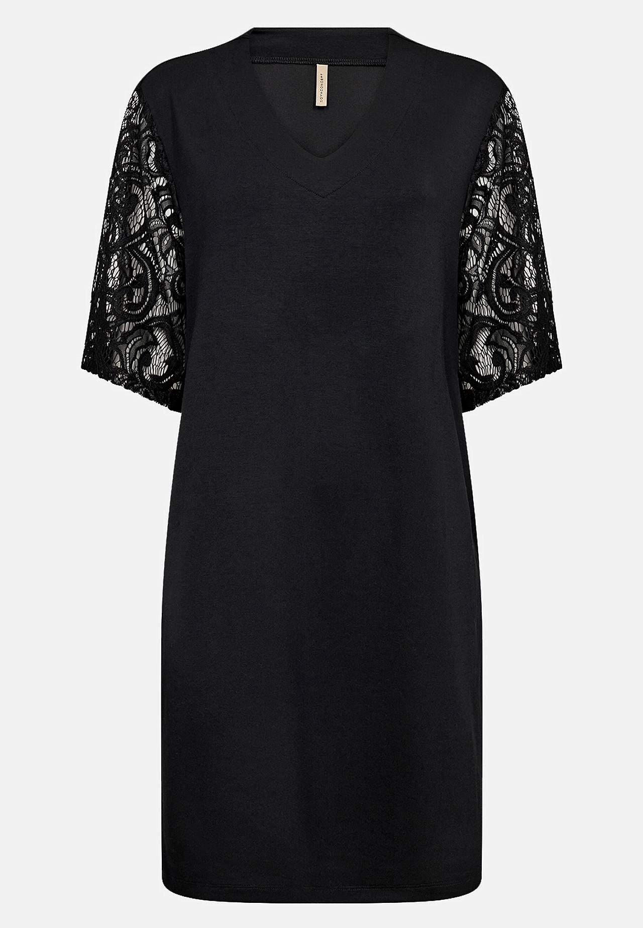 Kjole i vidunderlig myk modalmiks og noe kraftigere jersey. Rett passform. Kort modell. V-hals snitt. Sidelommer. Elegante blondeermer. Trekvartlange ermer. Rett fald. Lengde fra skulder ca. 98 cm i størrelse S (38).