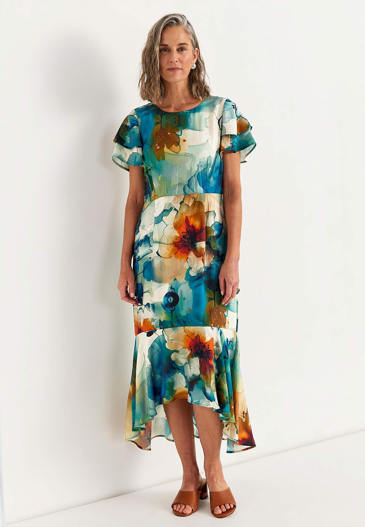 Festkjole i kjølende viskosemiks med fint fall. Materiale med lett struktur. Normal passform med a-linjeformet nederdel. Rundhalset med skjult glidelås på baksiden. Søm i midjen med dekorative folder. Asymmetrisk, litt lengre bak, avrundet fald. Rygglengden følger størrelsen, ca. 130 cm cm.