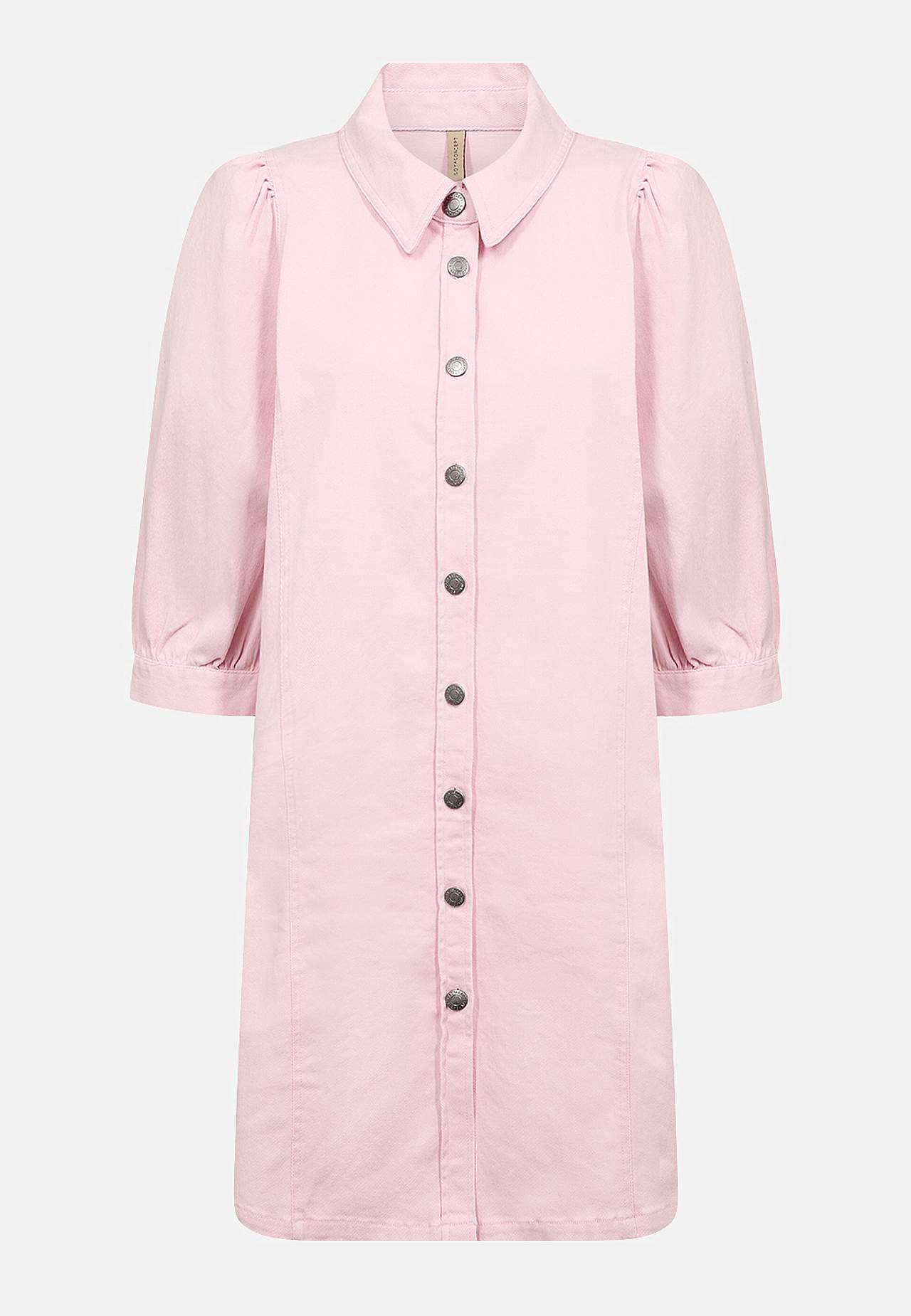 Feminin kjole i økologisk, noe kraftigere bomull. Komfortabel stretch. Rett passform. Gjennomkneppet modell med klassisk krage. Halvlange puffermer med mansjett og knapp i ermeslutten. Dekorsømmer foran og bak. Rett fald. Lengde fra skulder ca. 97 cm i størrelse S (38).