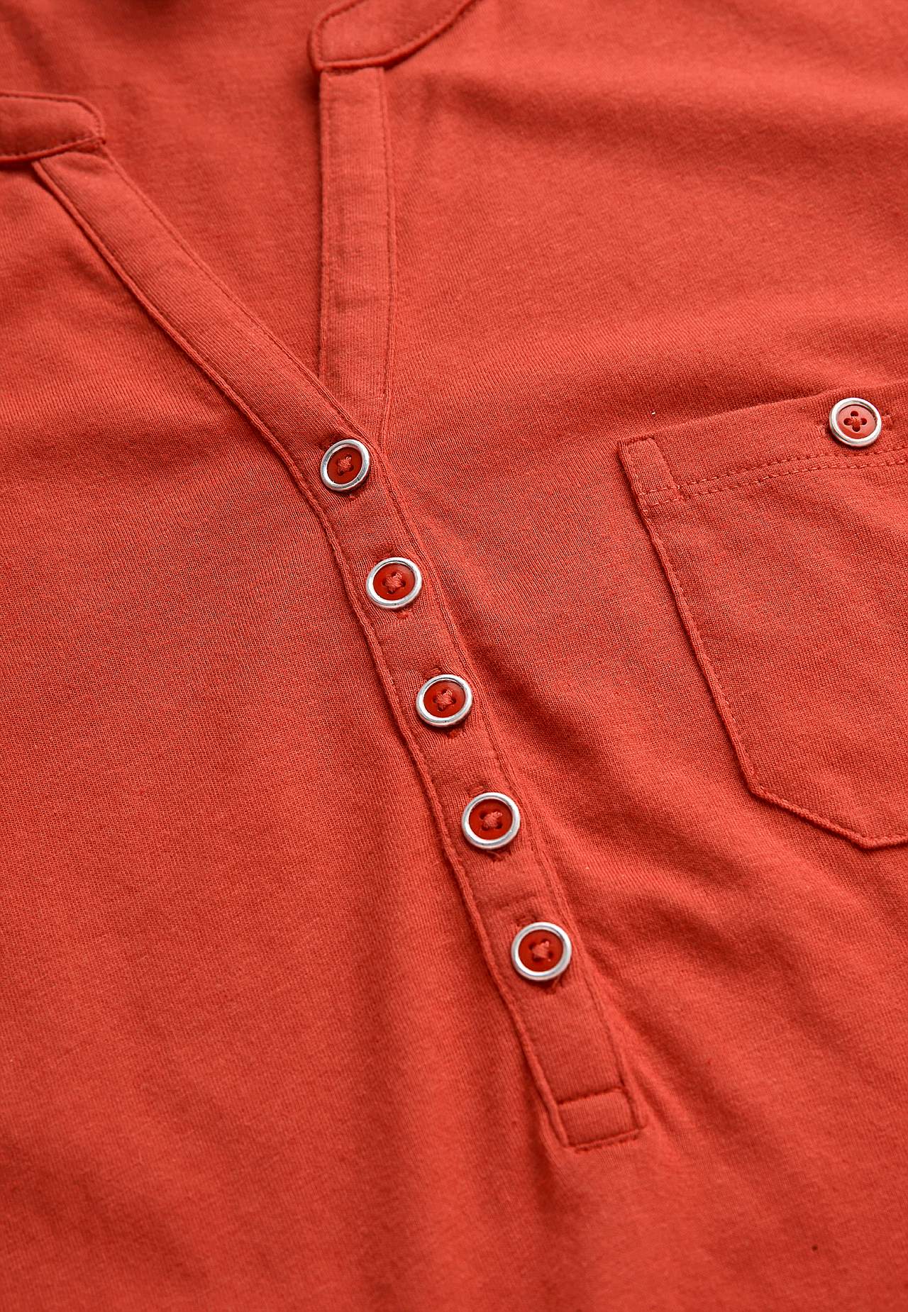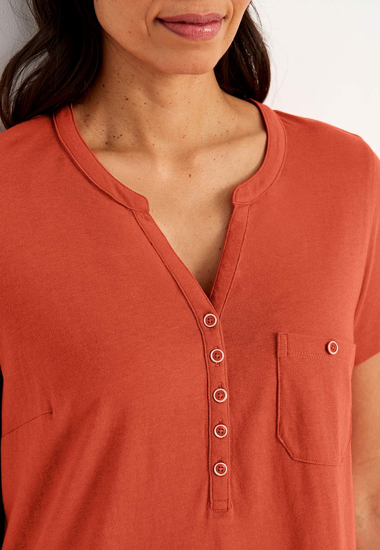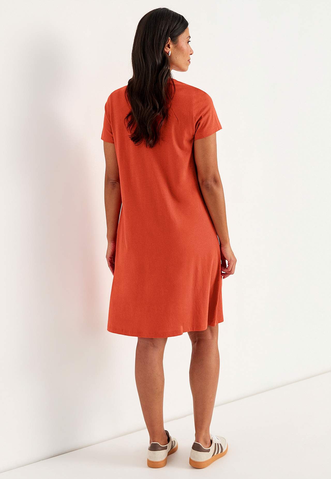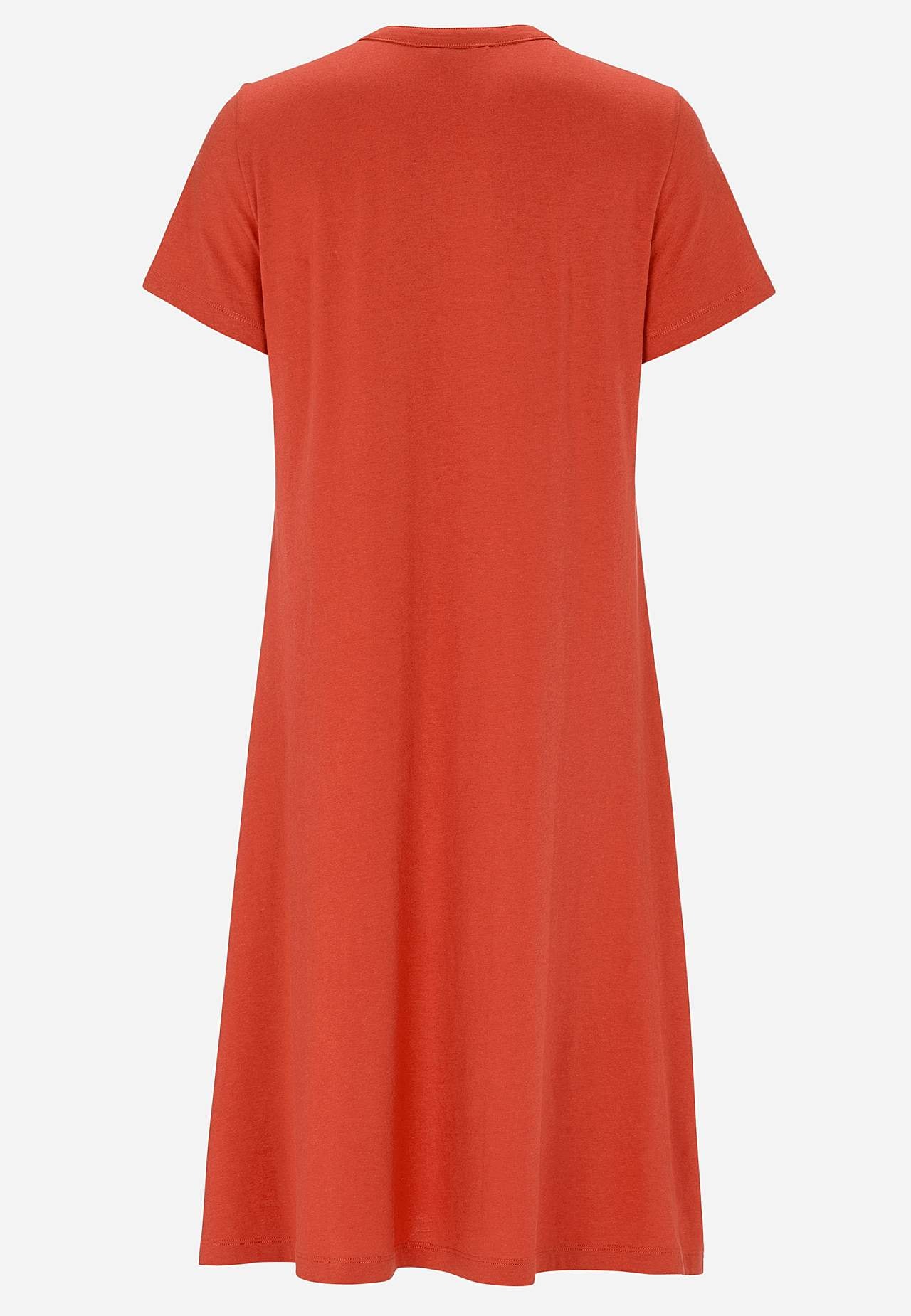 A-linjeformet kjole med korte ermer. Jersey i vidunderlig myk organisk bomull og modal. Rund hals med v-snitt og knappslag. Liten brystlomme med knapp. Innsnitt ved bysten. Lett avrundet fald. Lengden følger størrelsen, ca. 97-114 cm fra skulderen.