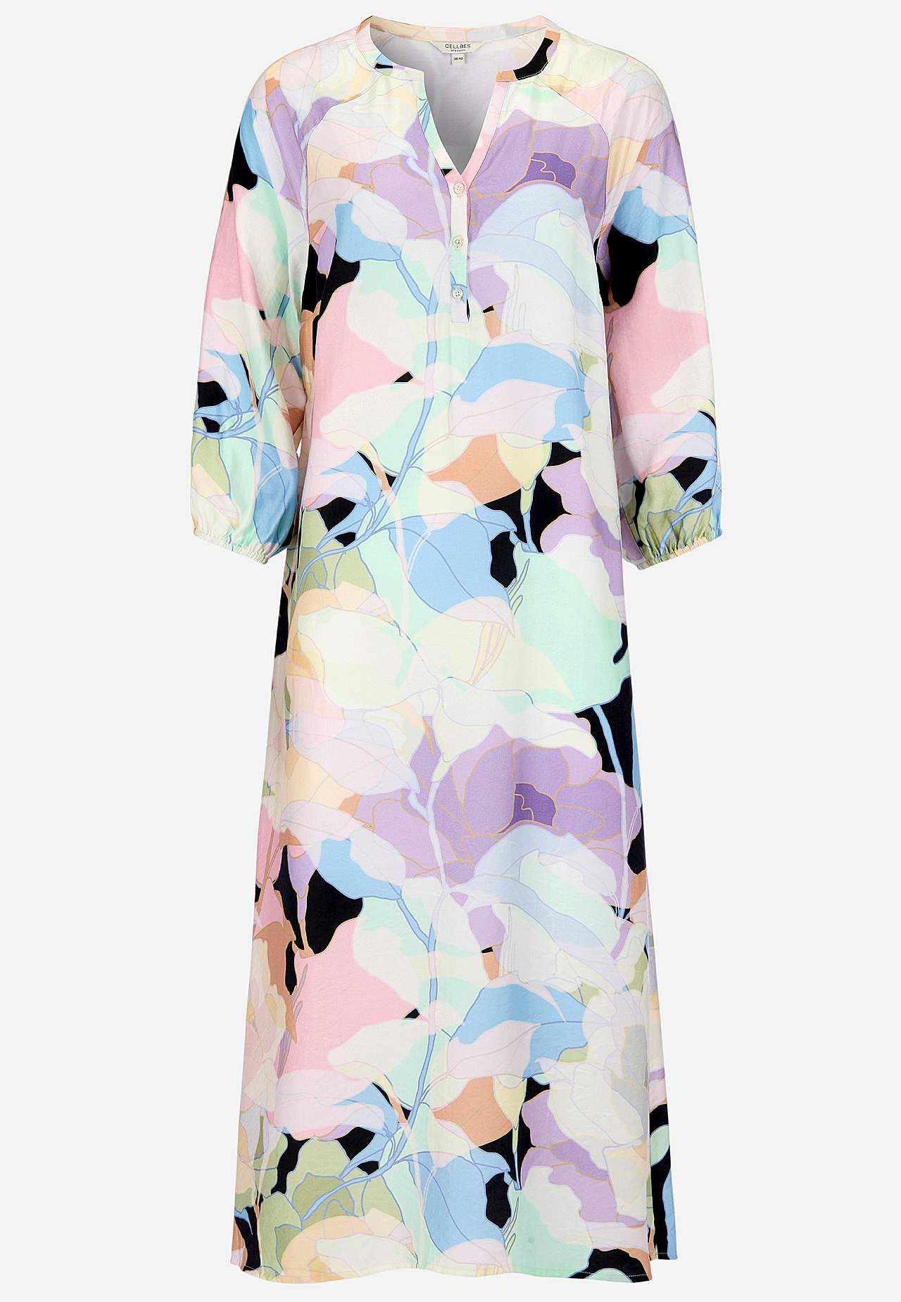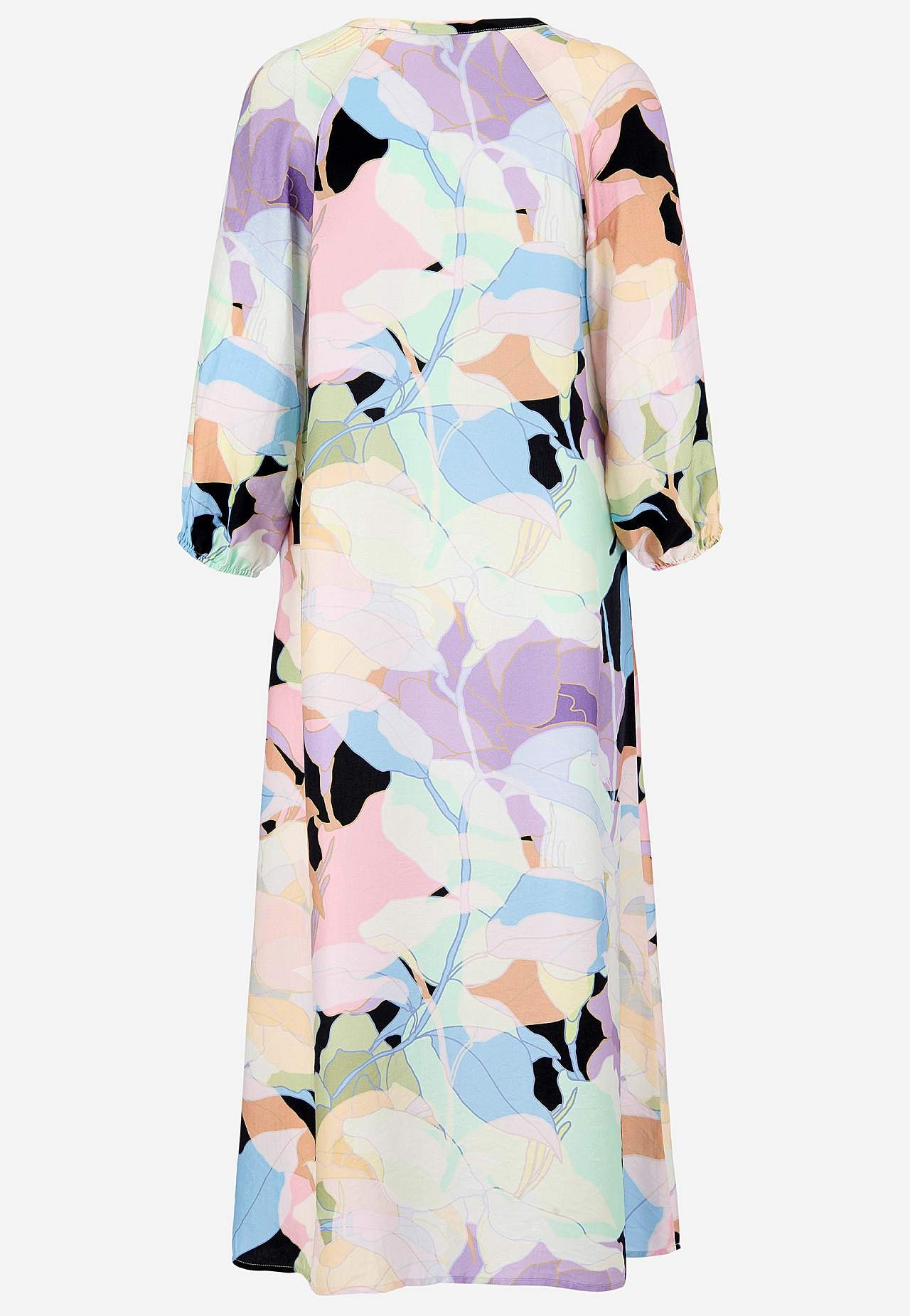Kjole i viskose med litt blankt teksturert vevstoff. Fint fall og kjølende følelse. A-linjeformet, løstsittende og ledig passform. Rundhalset med v-hals og knappslag med knapper. Brystinnsnitt. Lett avrundet fald. Rygglengden følger størrelsen, ca. 124 cm.