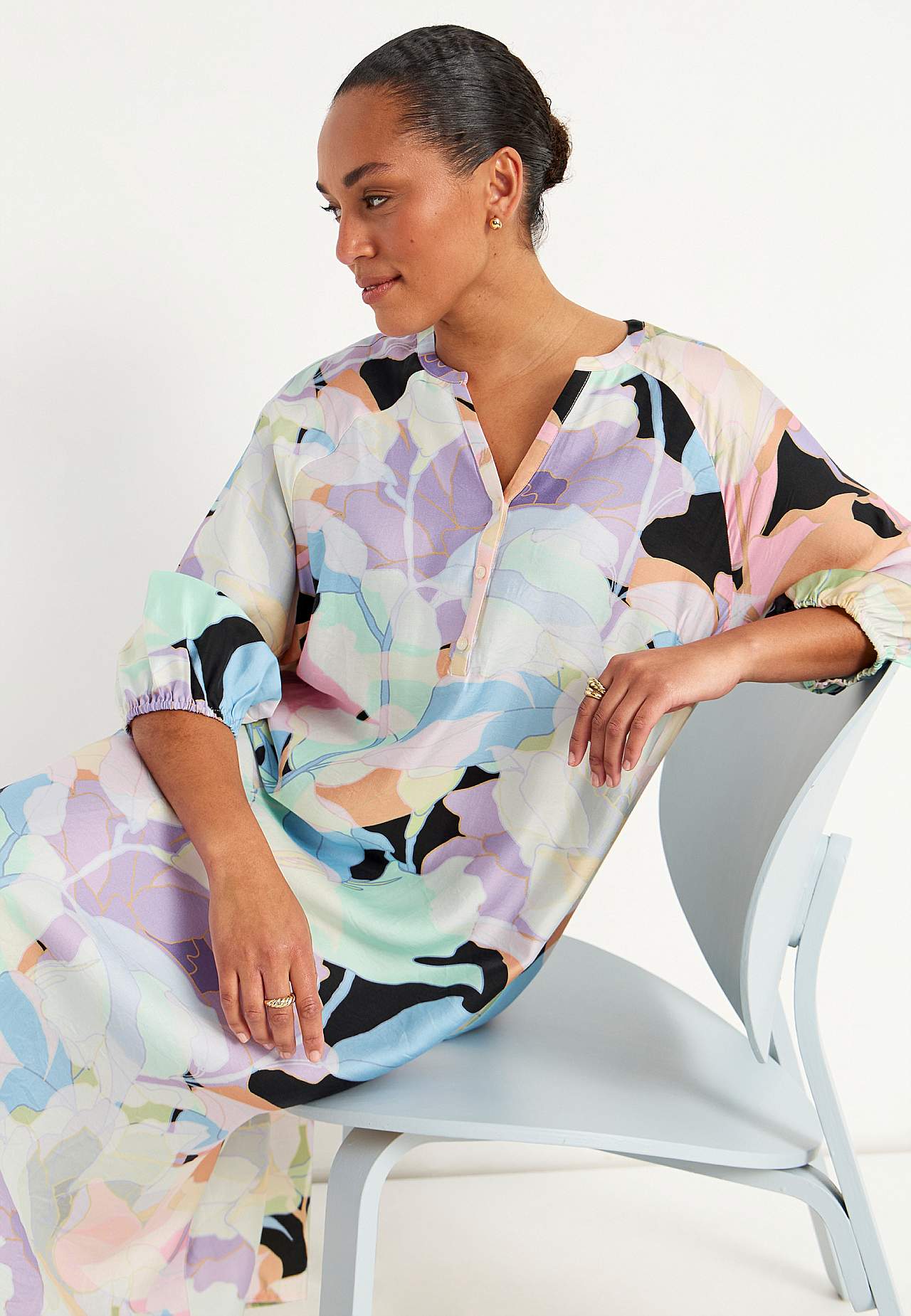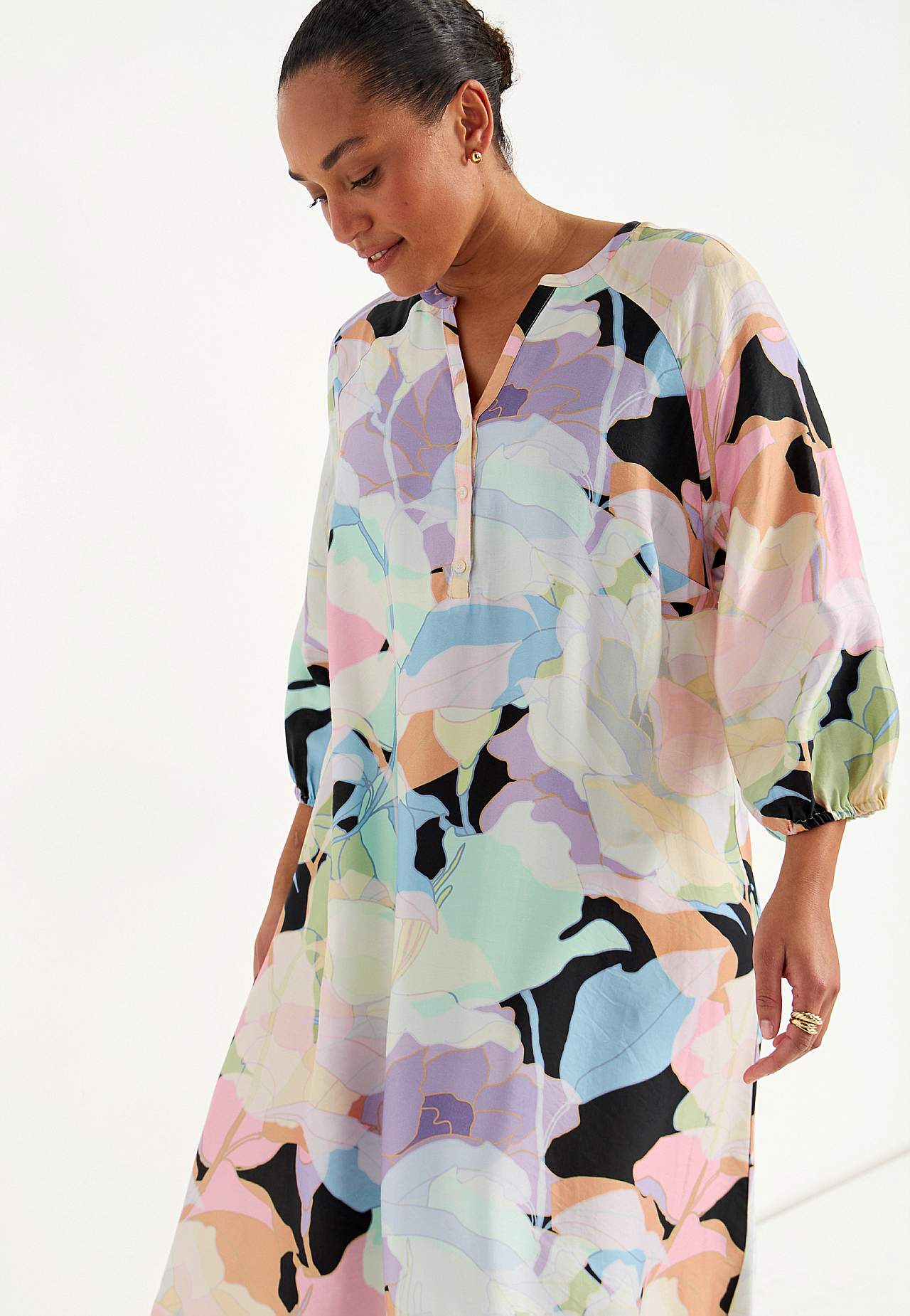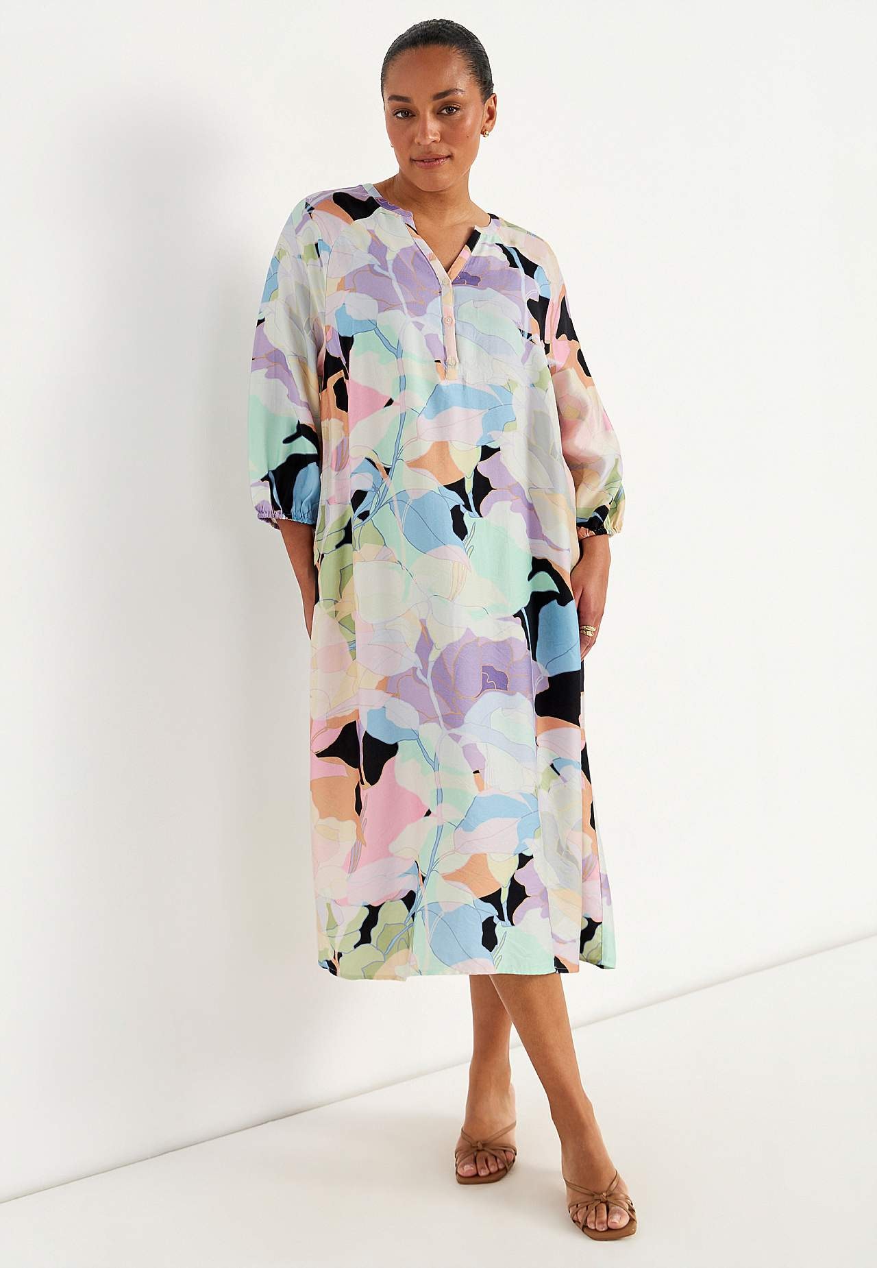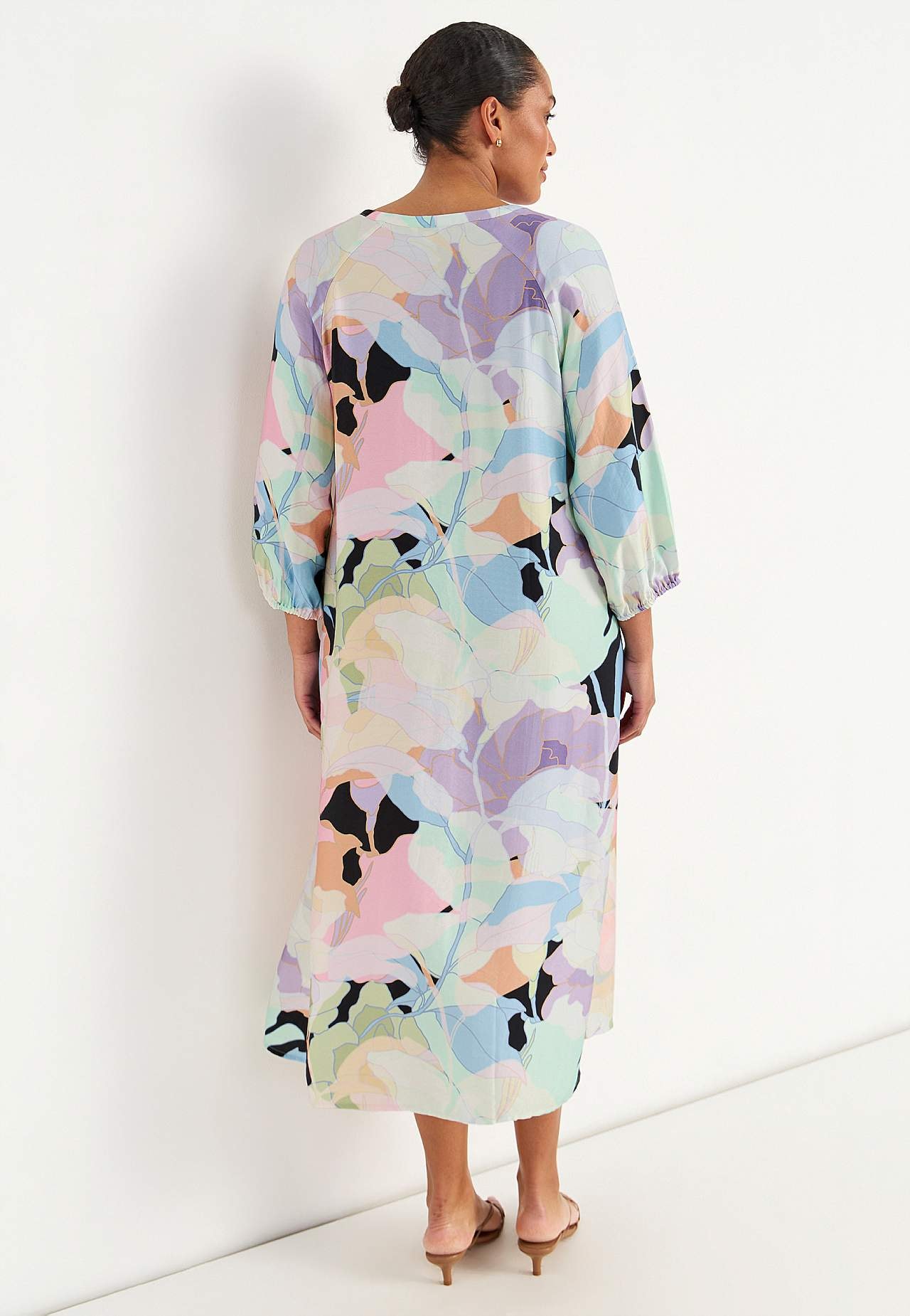 Kjole i viskose med litt blankt teksturert vevstoff. Fint fall og kjølende følelse. A-linjeformet, løstsittende og ledig passform. Rundhalset med v-hals og knappslag med knapper. Brystinnsnitt. Lett avrundet fald. Rygglengden følger størrelsen, ca. 124 cm.