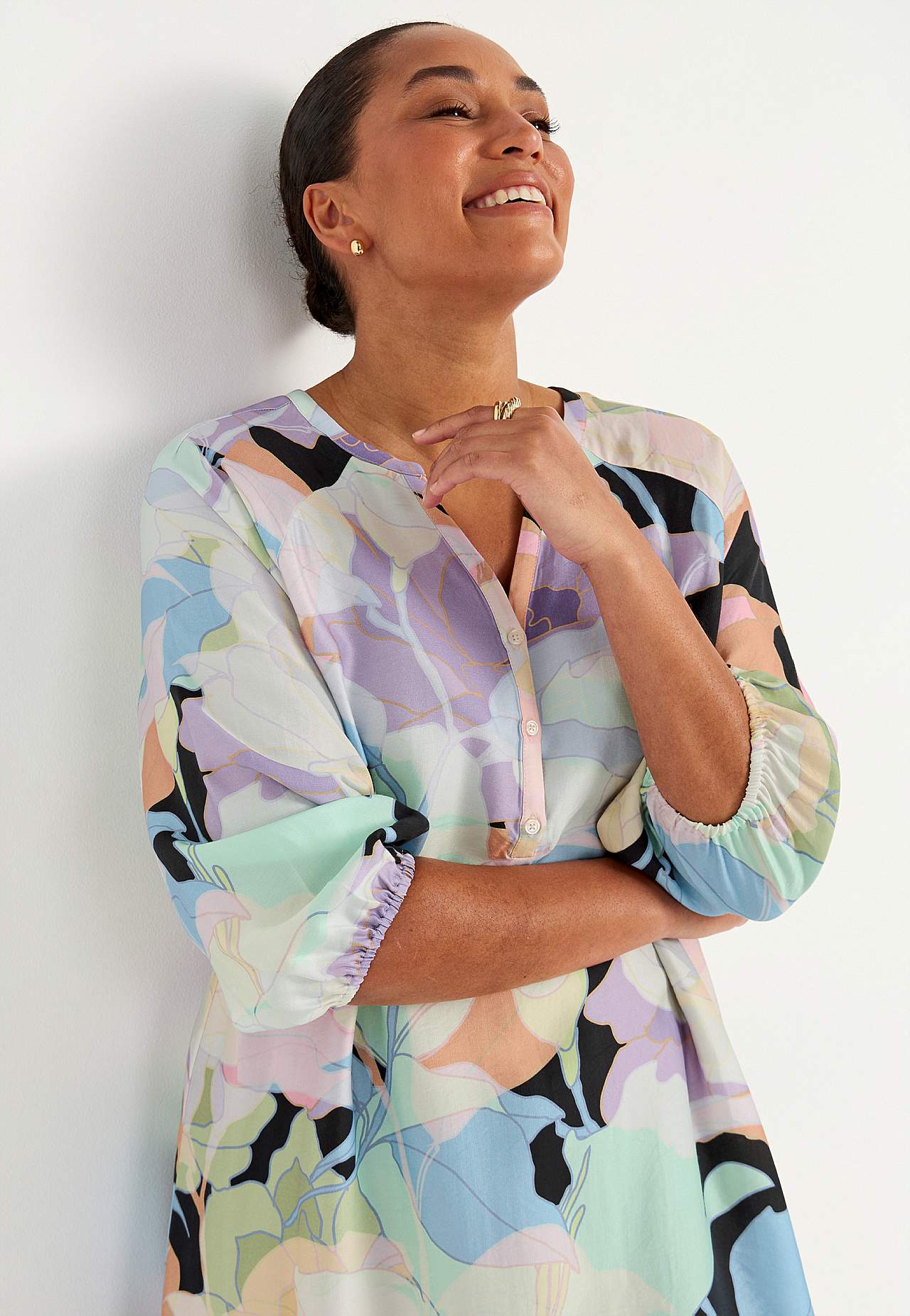 Kjole i viskose med litt blankt teksturert vevstoff. Fint fall og kjølende følelse. A-linjeformet, løstsittende og ledig passform. Rundhalset med v-hals og knappslag med knapper. Brystinnsnitt. Lett avrundet fald. Rygglengden følger størrelsen, ca. 124 cm.