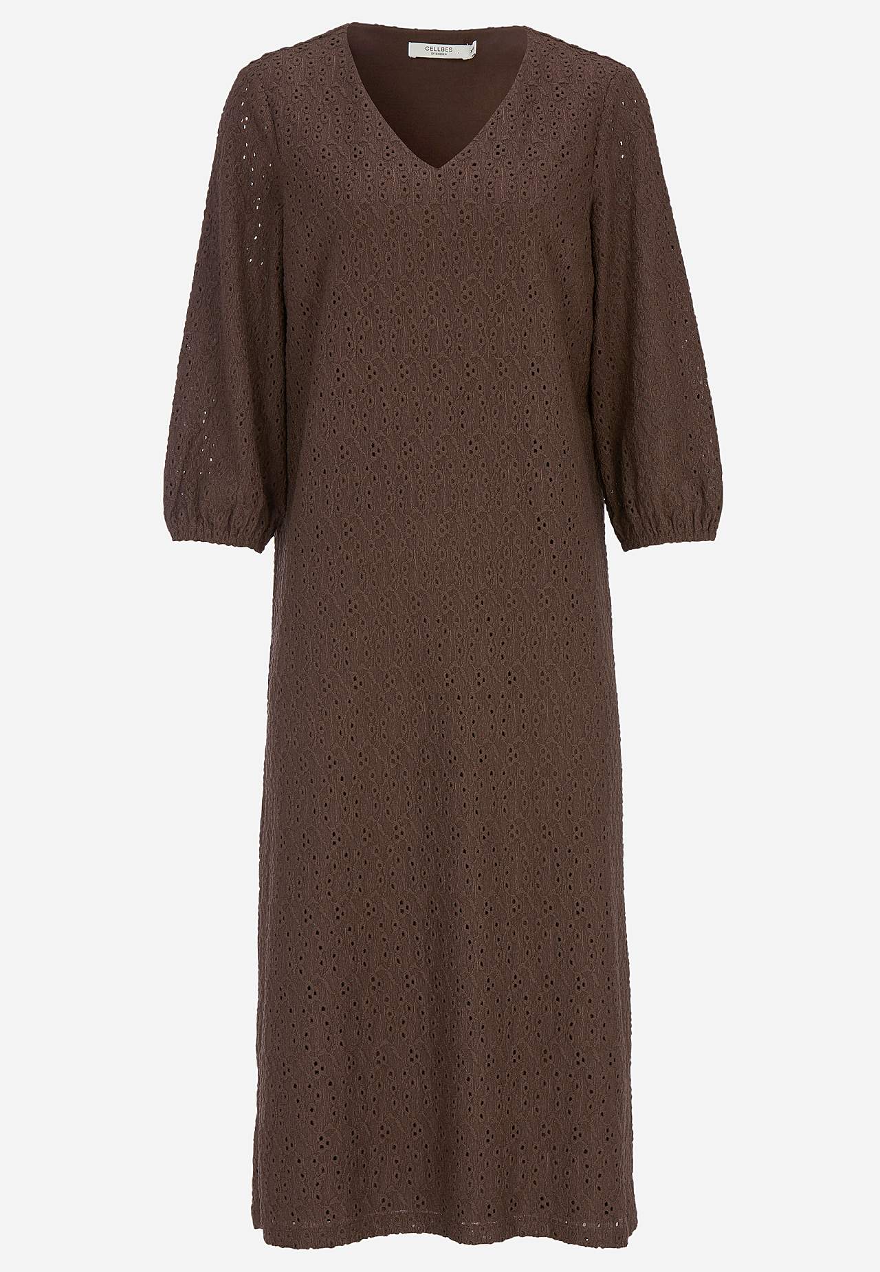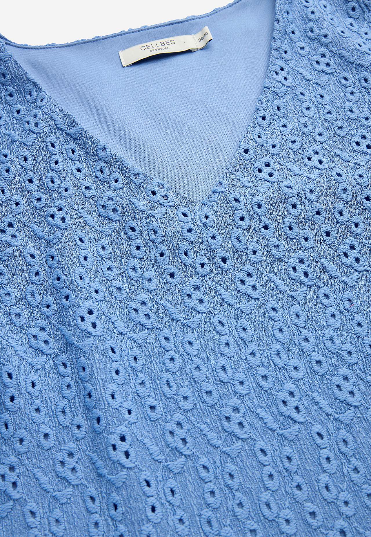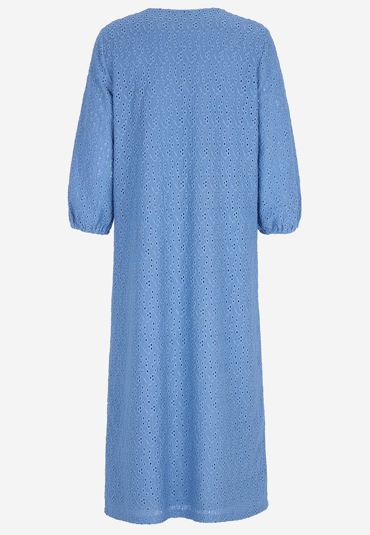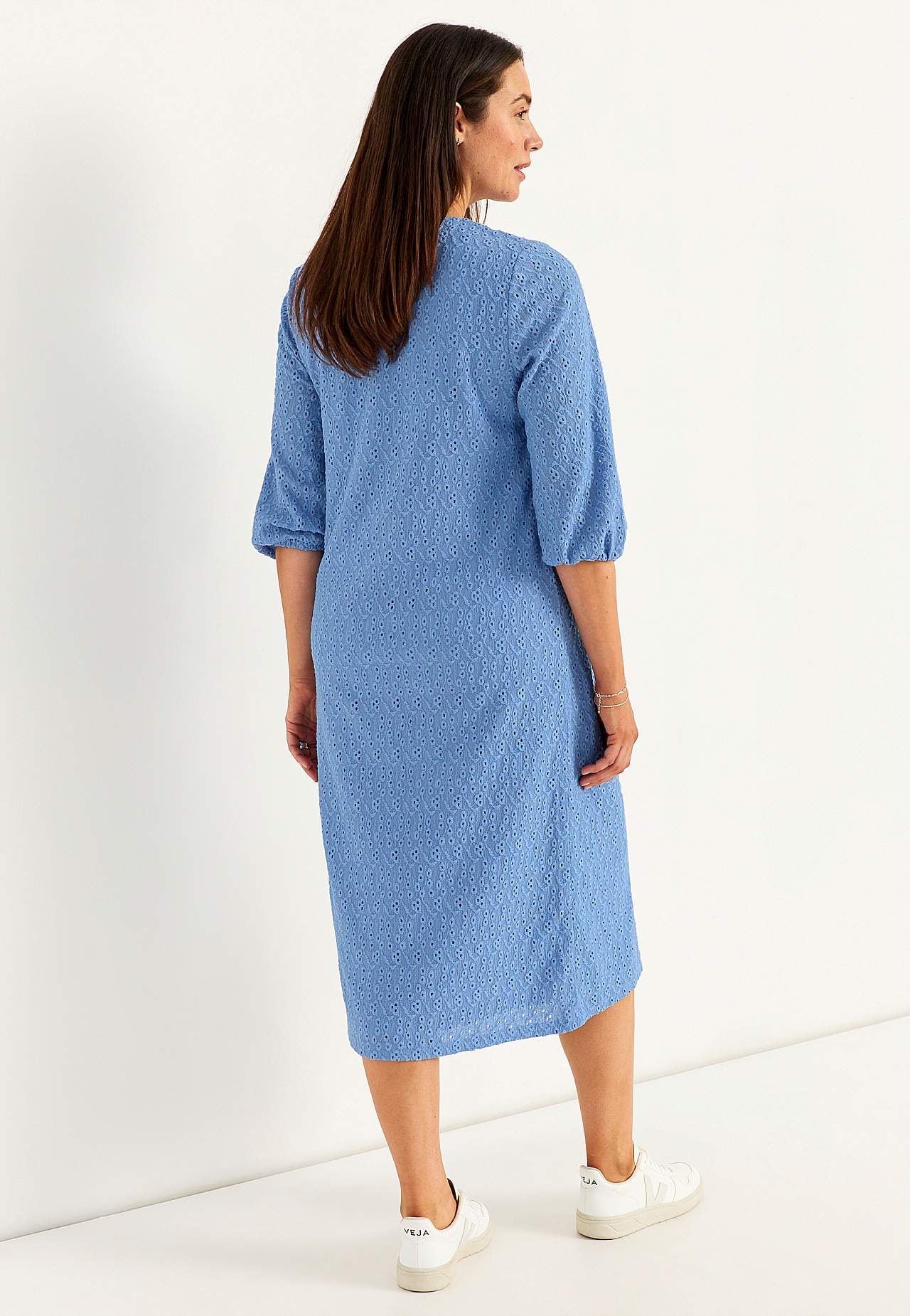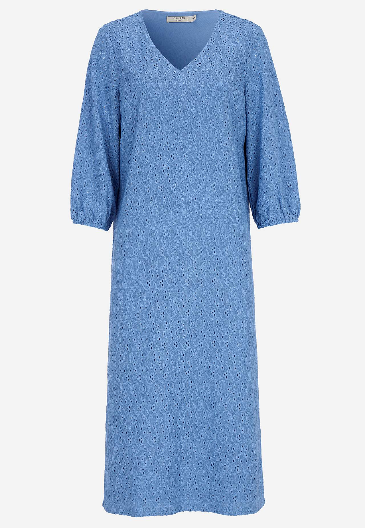 Broderie anglaise, strukturmønstret, fôret kjole. Komfortabelt, stretchy materiale. Lett a-linjeformet passform. V-halset hals. Brystinnsnitt. Trekvartlange, ufôrete ermer med strikk i ermeslutten. Rett fald. Rygglengden følger størrelsen, ca. 120 cm.