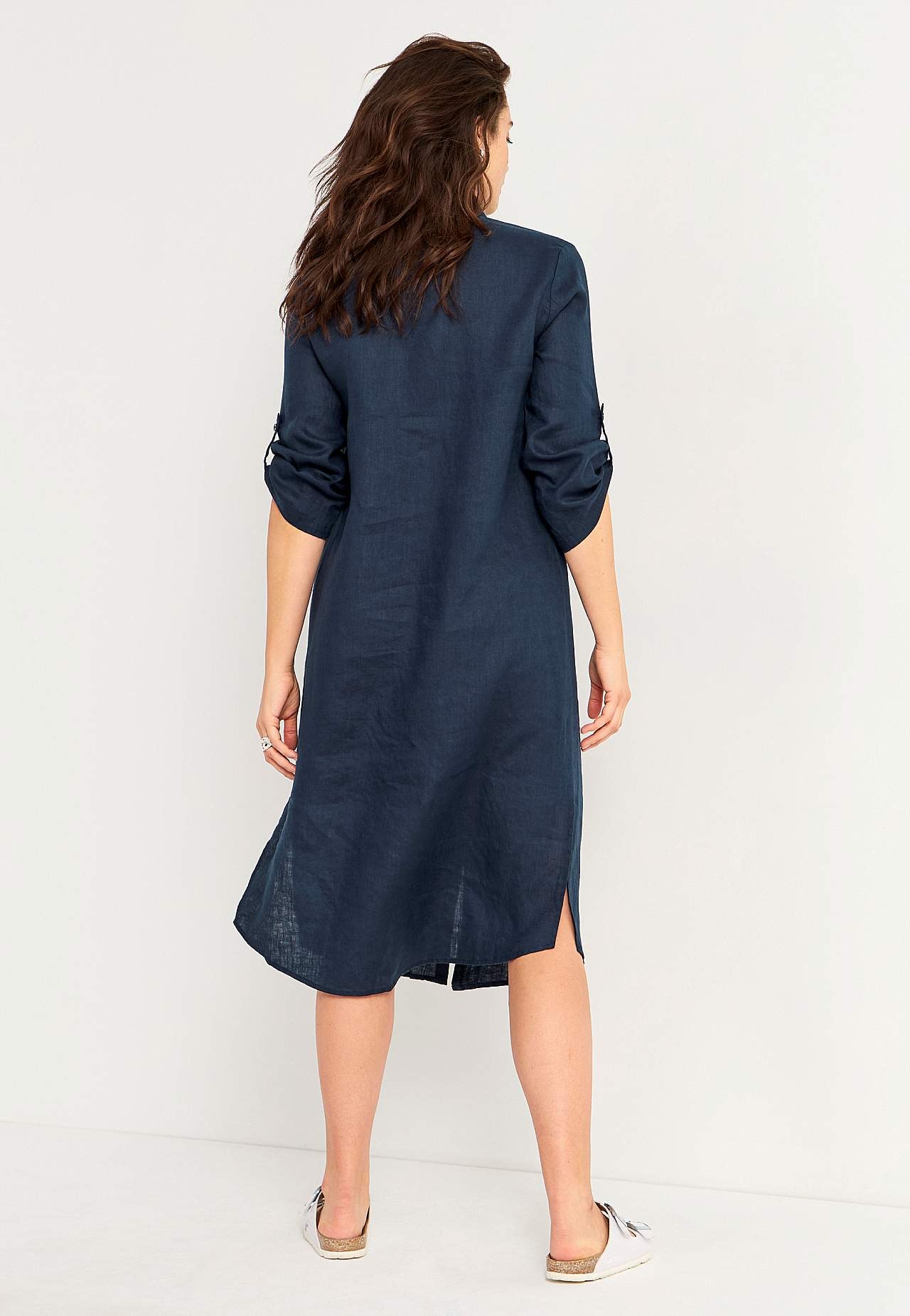 Skjortekjole i 100 % lin. Luftig materiale. Romslig passform med et rettvinklet snitt. Knappslag fra topp til bunn. Brettbar langt erme med knappedetalj. Innsnitt ved bysten for beste passform. En ekte hverdagsfavoritt! Lengden følger størrelsen, ca. 116-124 cm fra skulderen.