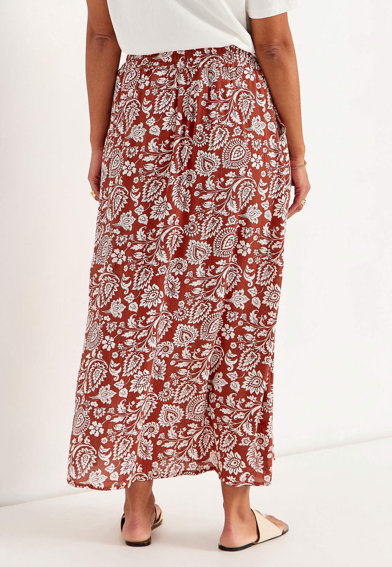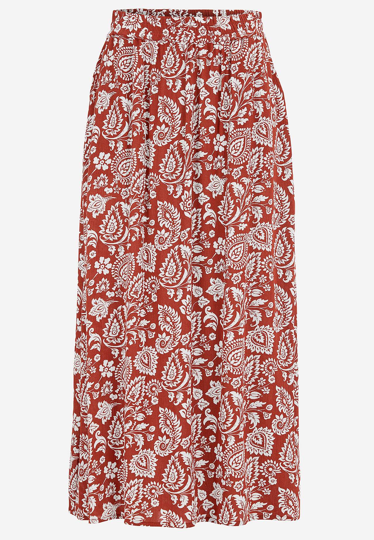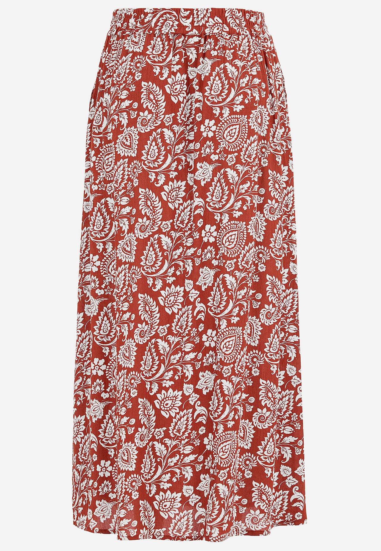 Langt, vevet viskoseskjørt med lommer. Materiale i crêpe med matt finish og fin struktur. Mykt og draperende med en kjølig følelse. Bredt, mykt elastisk midjebånd. Skråe lommer foran. Rett fald. Matche gjerne med 702443. Lengde: 95 cm.