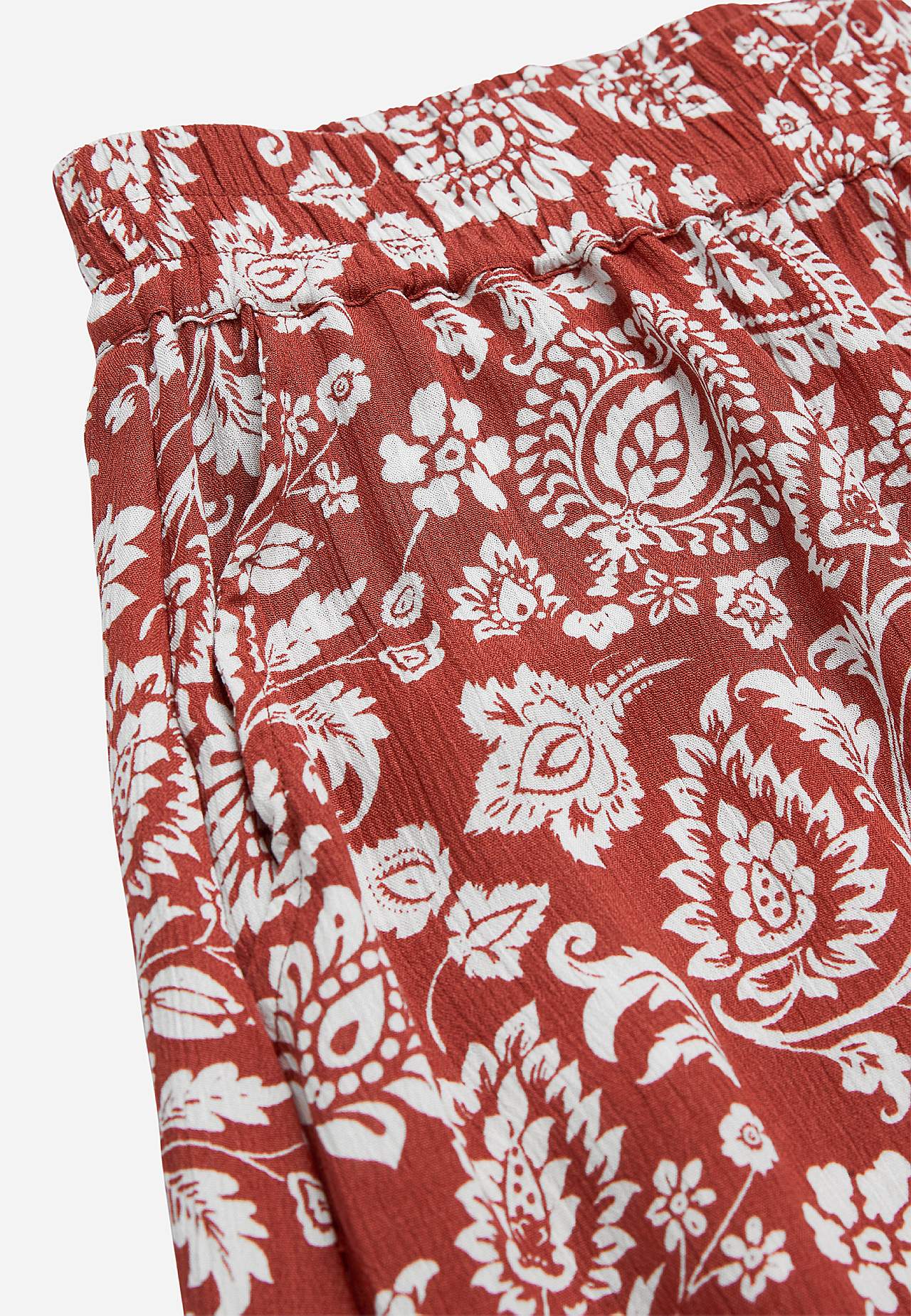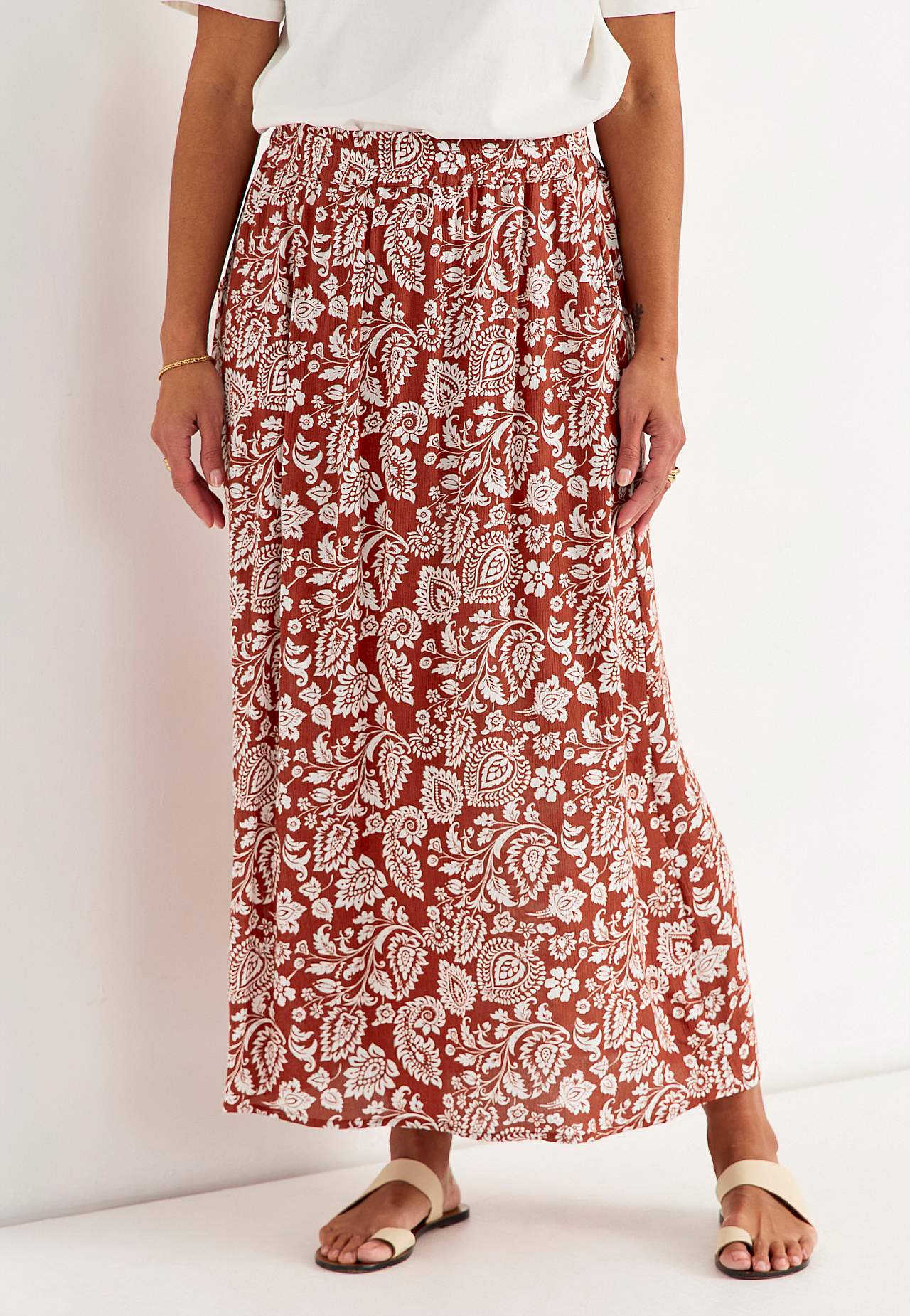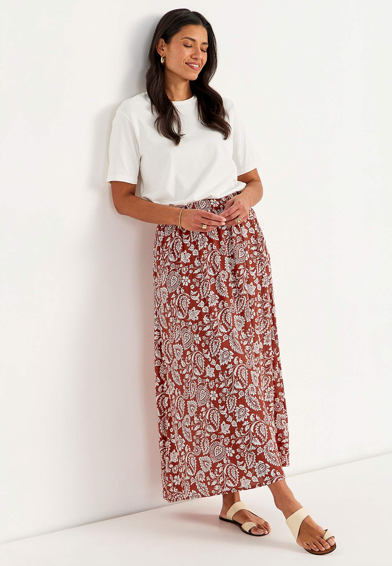 Langt, vevet viskoseskjørt med lommer. Materiale i crêpe med matt finish og fin struktur. Mykt og draperende med en kjølig følelse. Bredt, mykt elastisk midjebånd. Skråe lommer foran. Rett fald. Matche gjerne med 702443. Lengde: 95 cm.