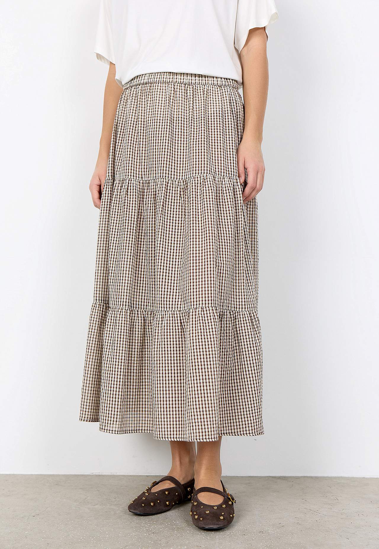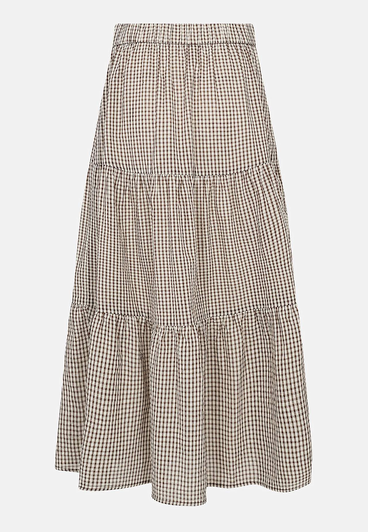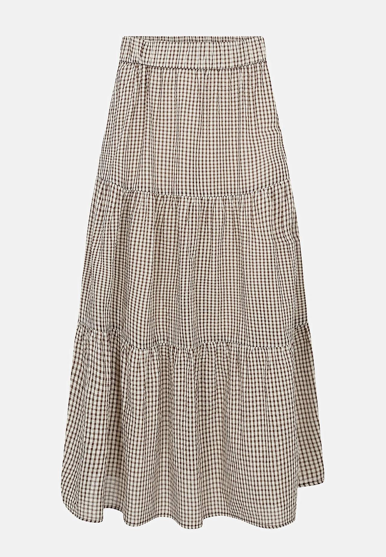 Fôret volangskjørt med garnfargede, små ruter. Luftig materiale i økologisk, myk bomull. A-linjeformet passform med fin vidde nederst. Komfortabel, bred elastisk midje. Fôring i myk viskose. Rett fald. Lengde ca. 90 cm i størrelse S (38).