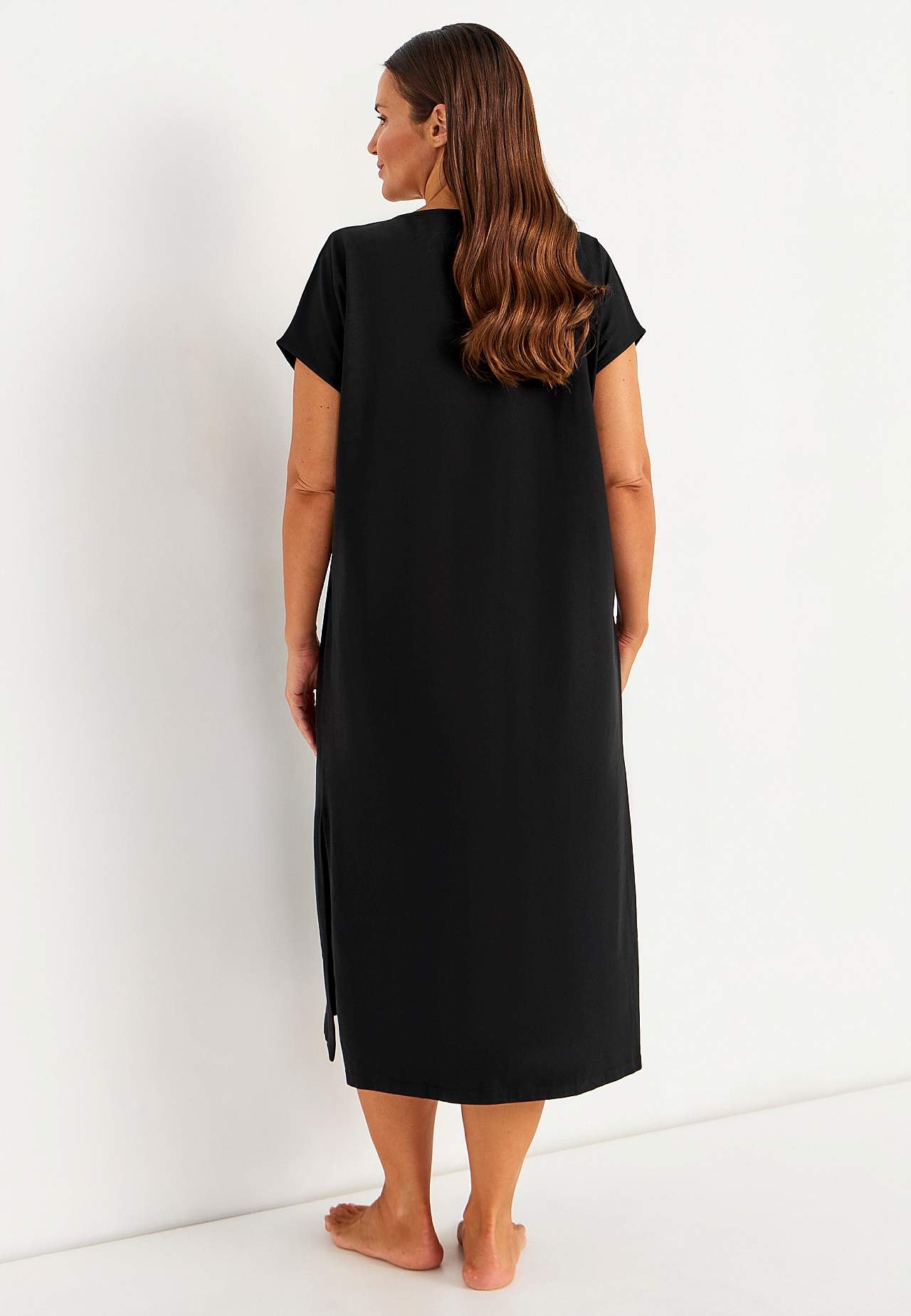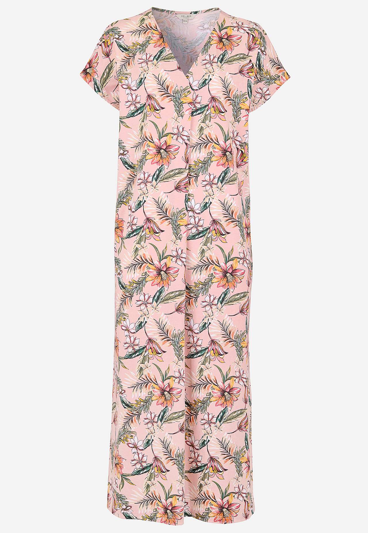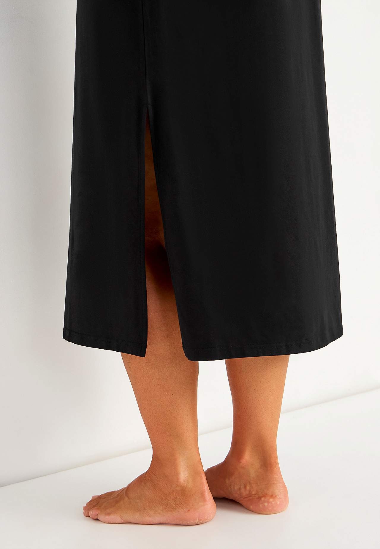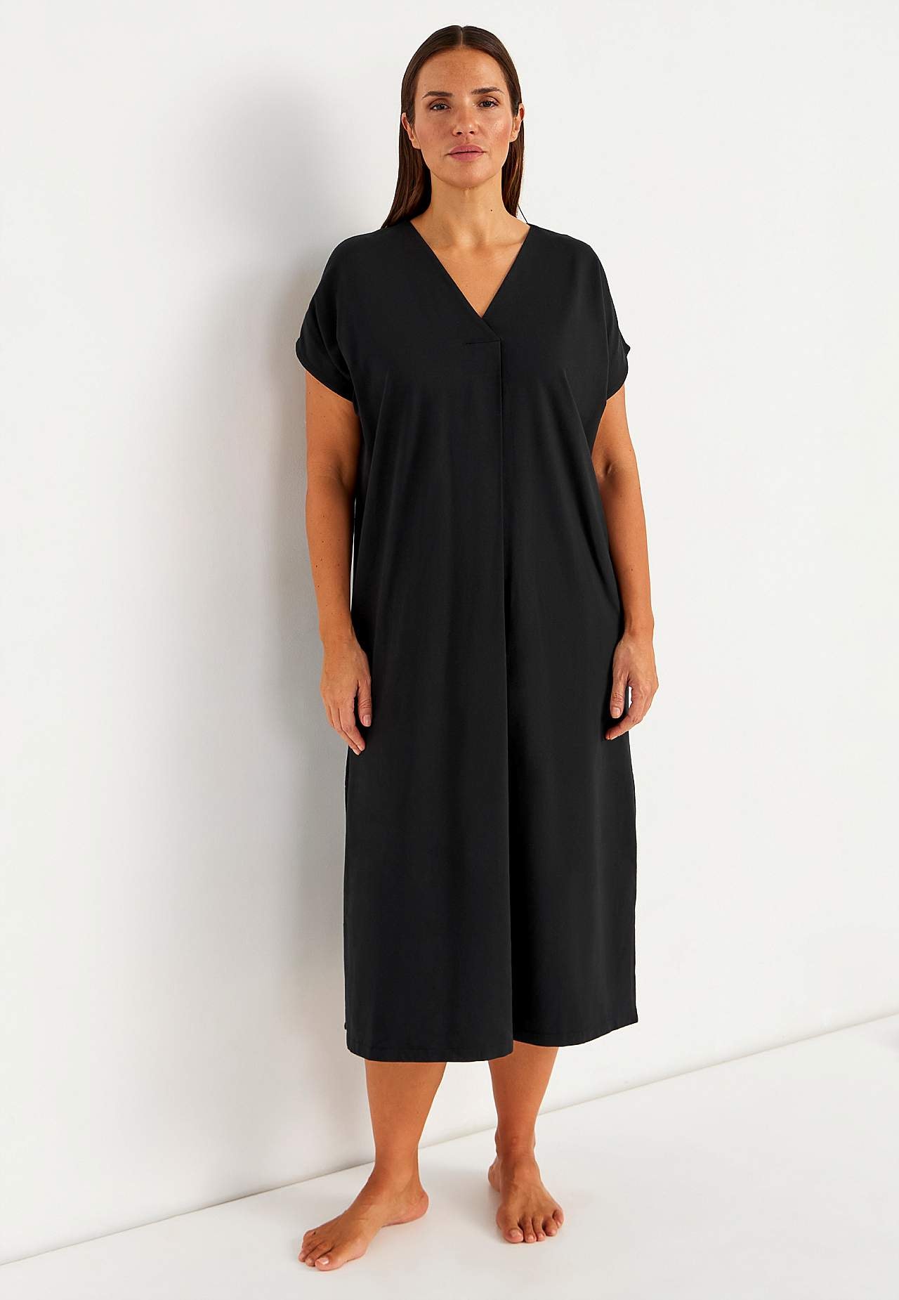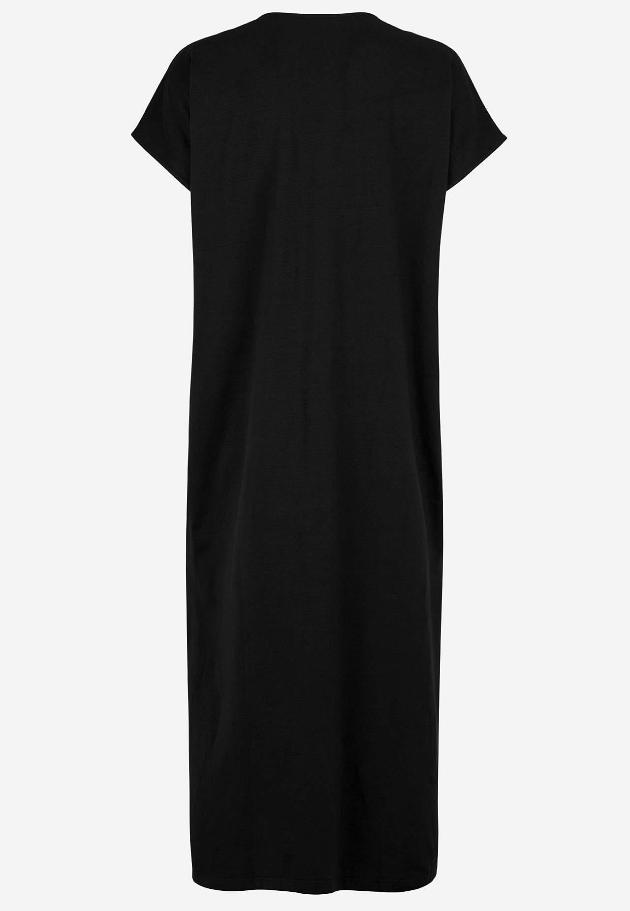 Myk, stretchy strandkjole i økologisk bomull. Klassisk kaftanmodell. Løs passform. Rett fald med høy splitt i sidene. Rygglengden følger størrelsen, ca. 128 cm.