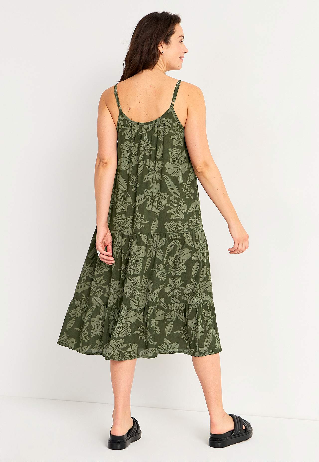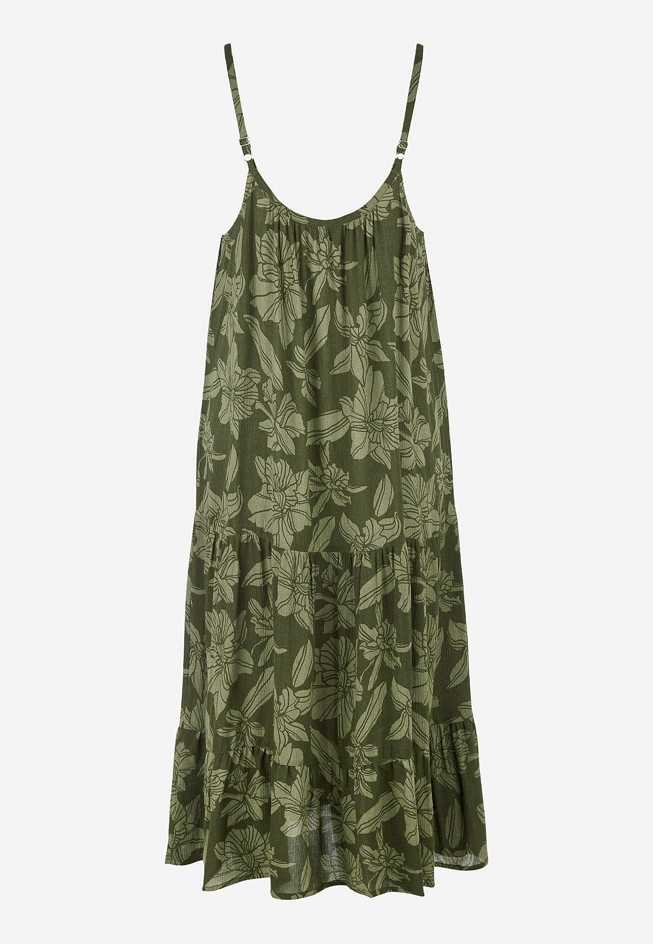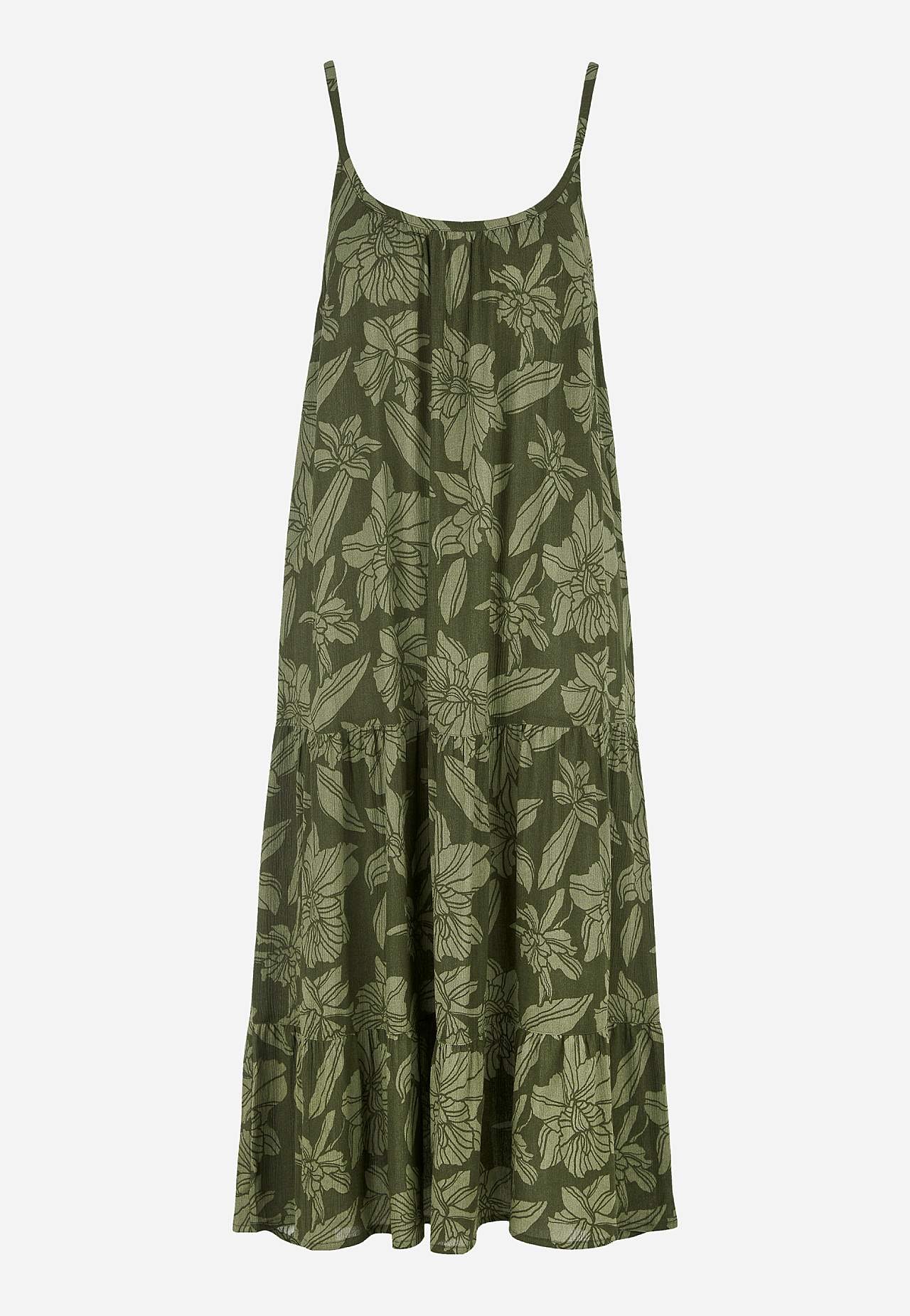 Luftig, vevet strandkjole med fin crêpe-kvalitet. A-linjeformet passform. Tynne justerbare skulderstropper. Brystinnsnitt. Lett avrundet fald med volang. Lengden følger størrelsen ca 101-108 cm midt foran.