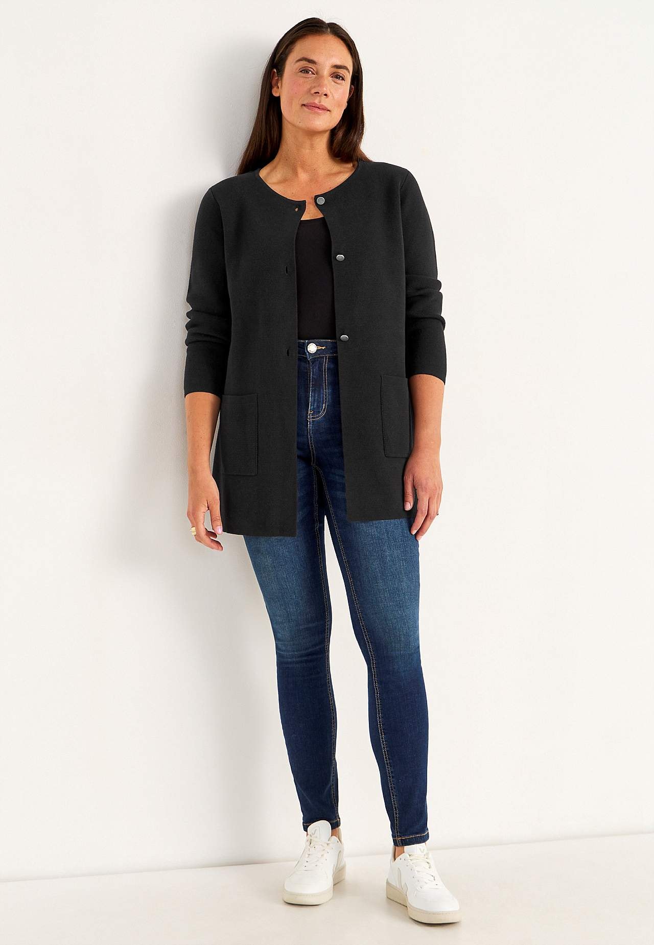 Finstrikket cardigan i formfast, myk bomullskvalitet med fin struktur. Rent, stilrent design perfekt for hele året. Litt lengre modell med lommer foran. Rett passform. Tre antikksølv knapper. Lengden følger størrelsen, ca. 77-86 cm fra skulderen.