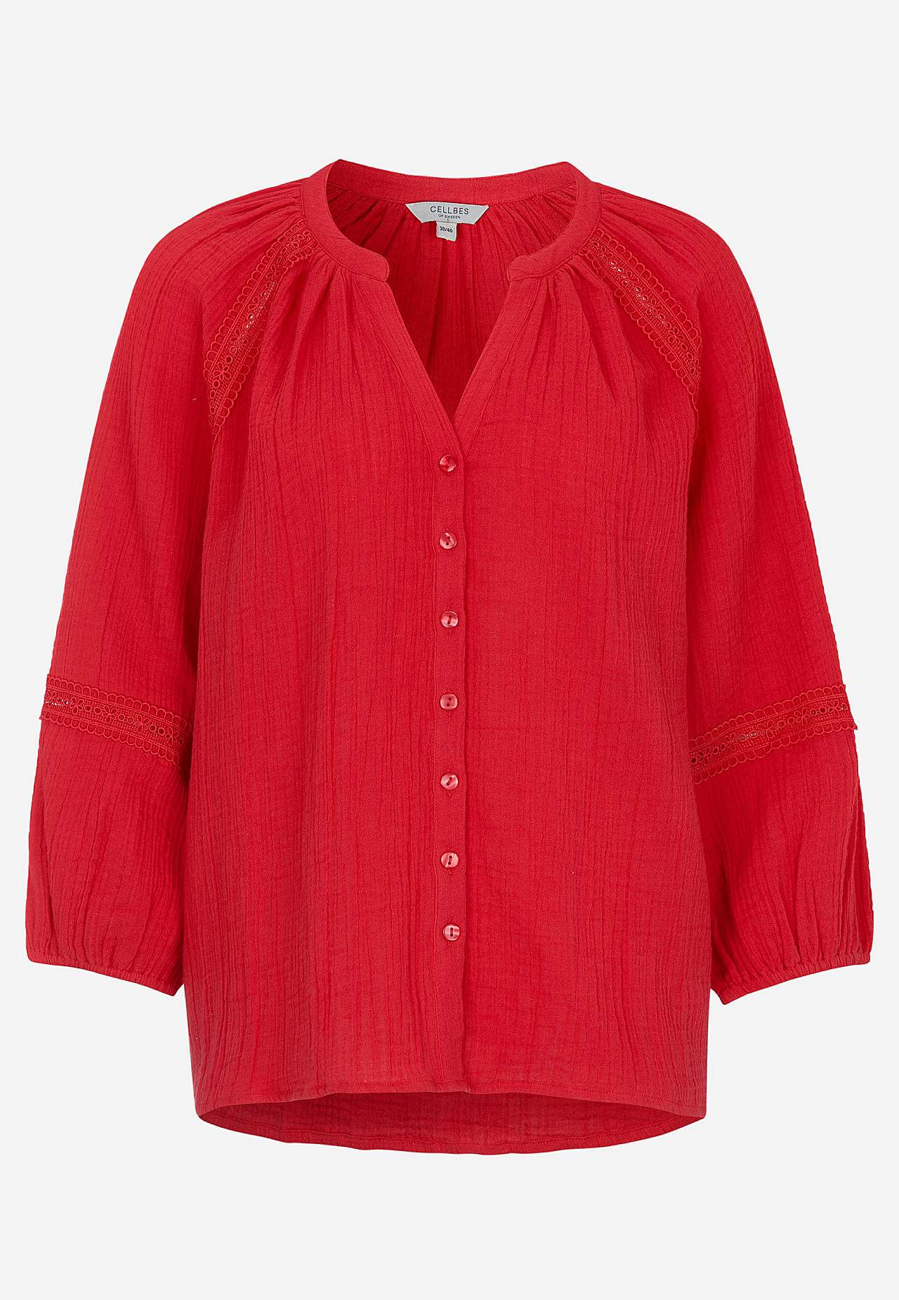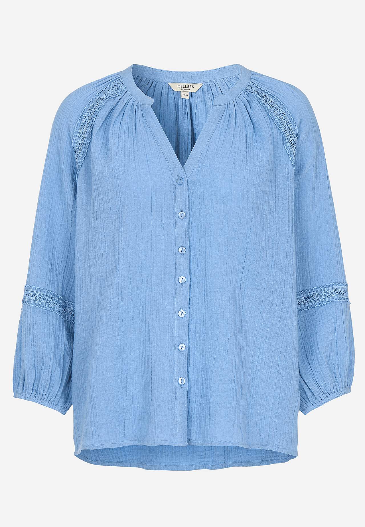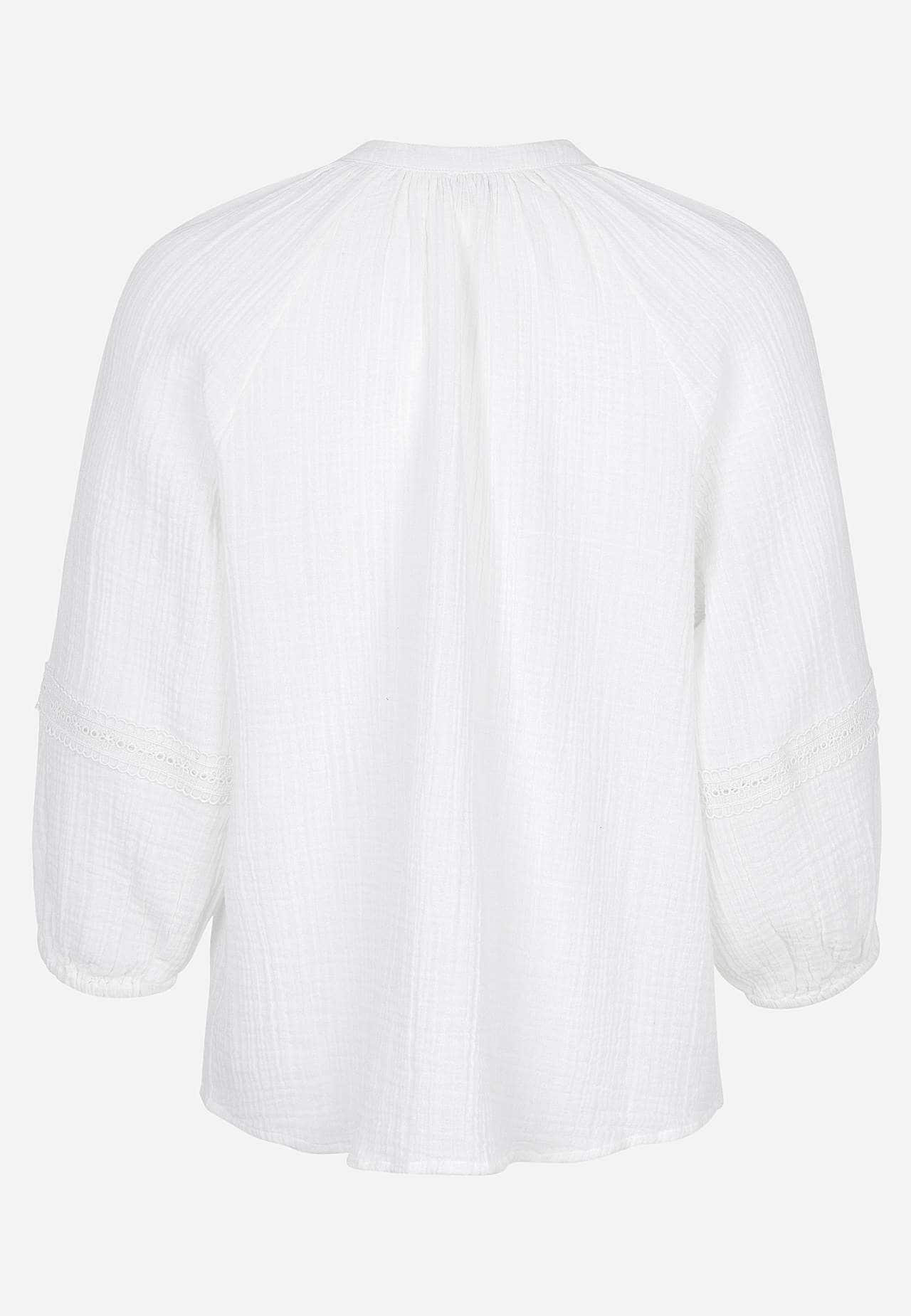 Luftig bluse med fine blondekanter på ermene. Vevet materiale i nydelig bomullsmusselin med struktur. Løs passform. Rund hals med lite v-hals snitt. Knapper foran. 3/4-lange, vide raglanermer med puff og strikk i ermeslutten. Detaljert sirlig blondebånd ved raglansøm og nedre del av erme. Avrundet fald. Rygglengden følger s... Les mer