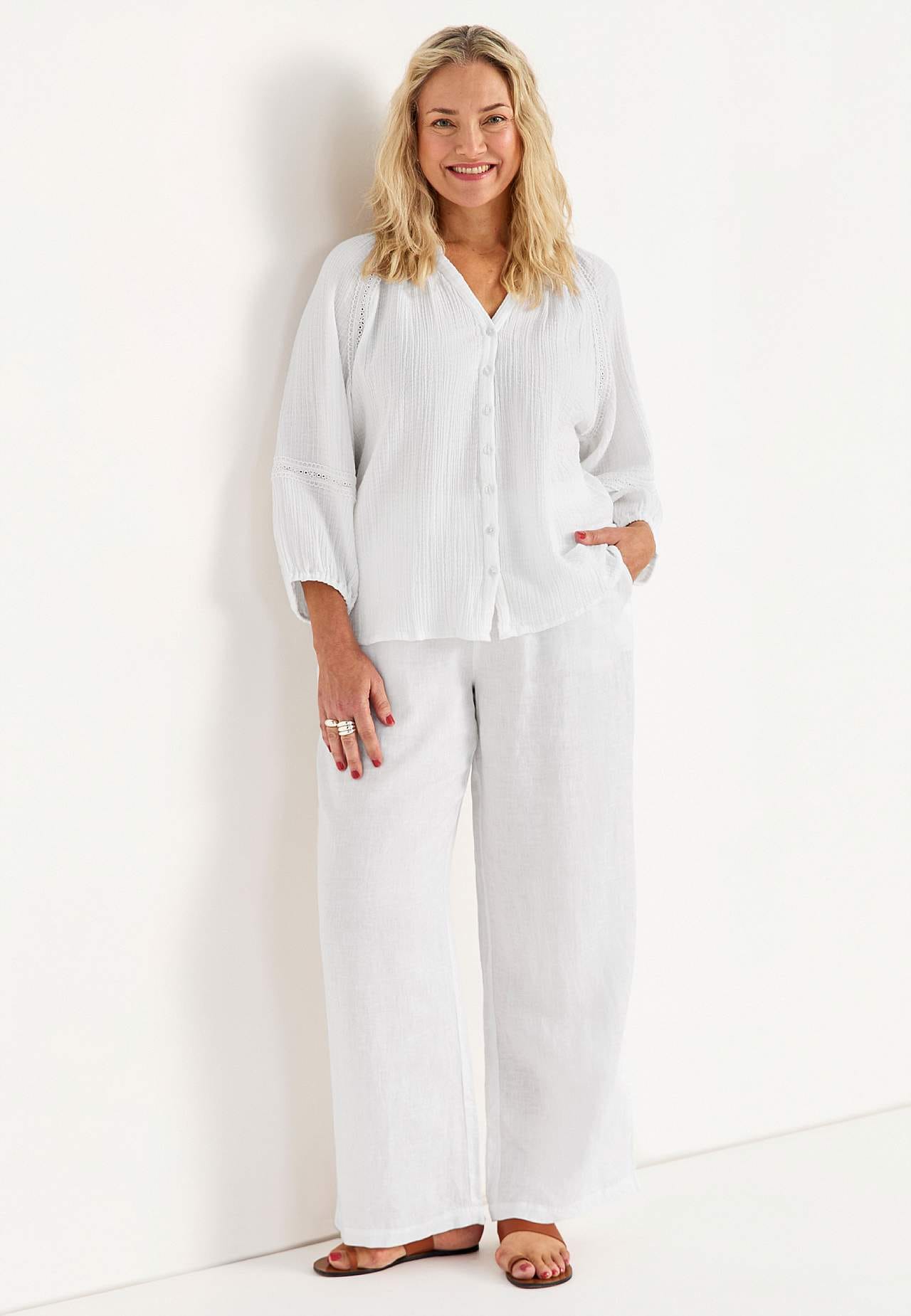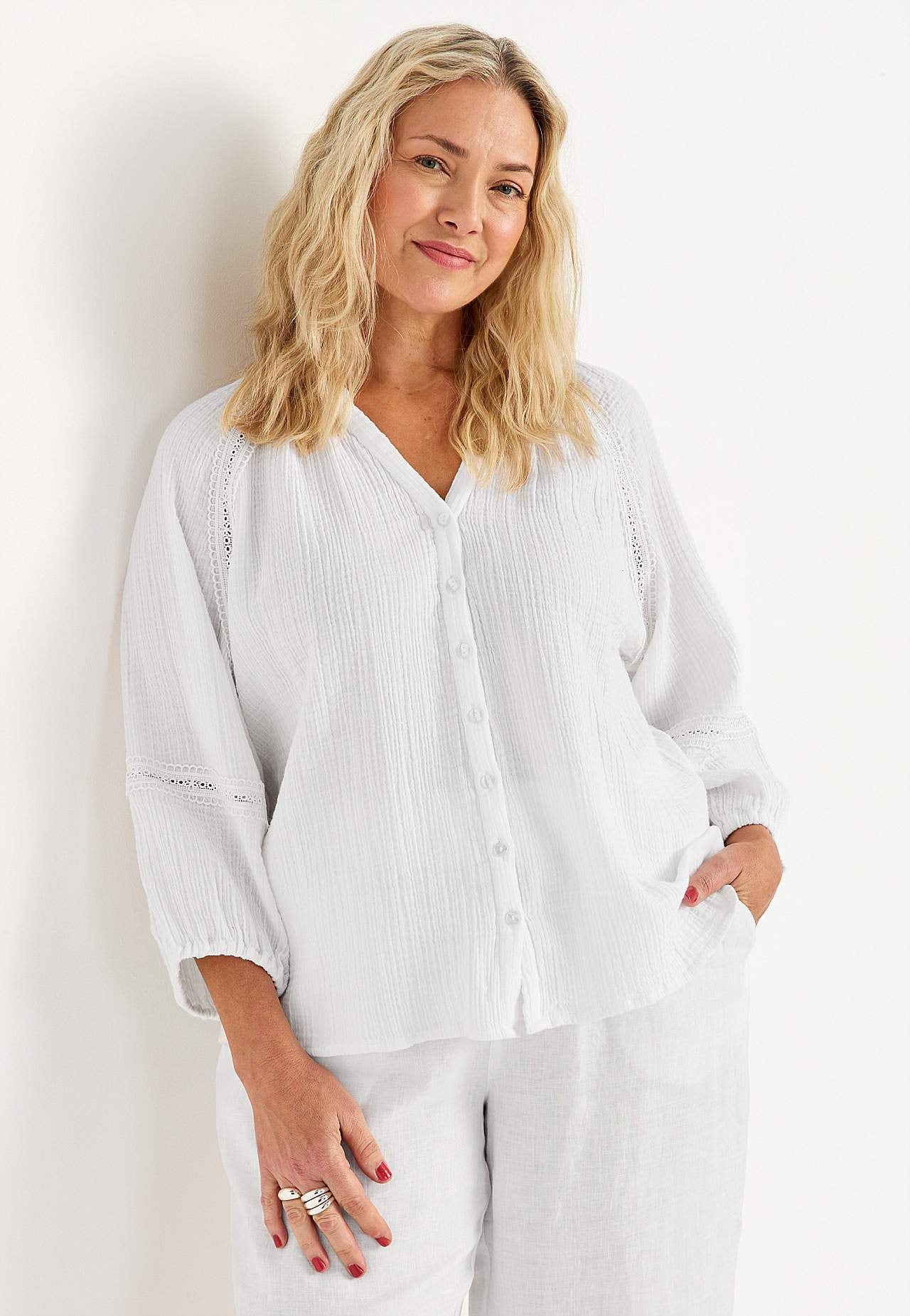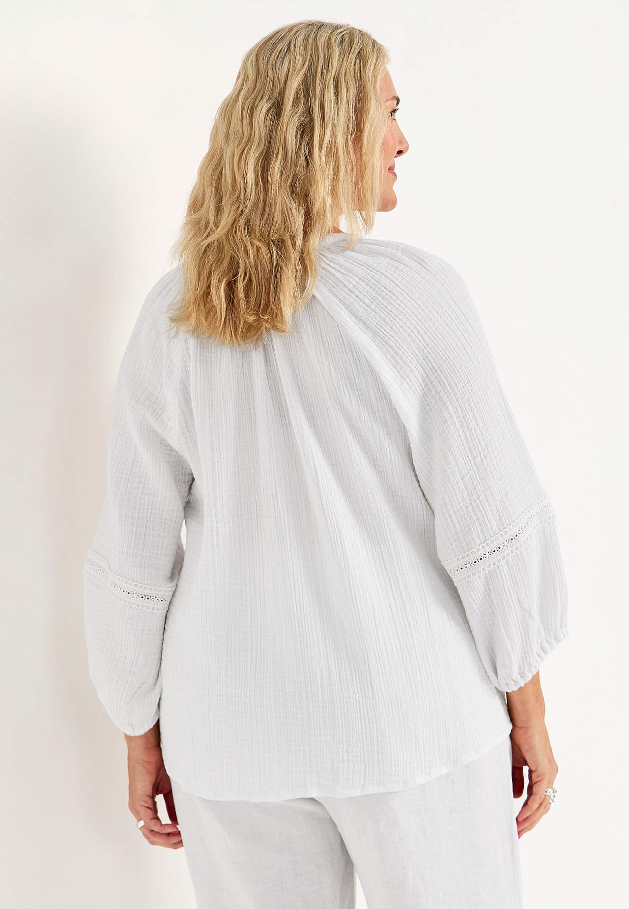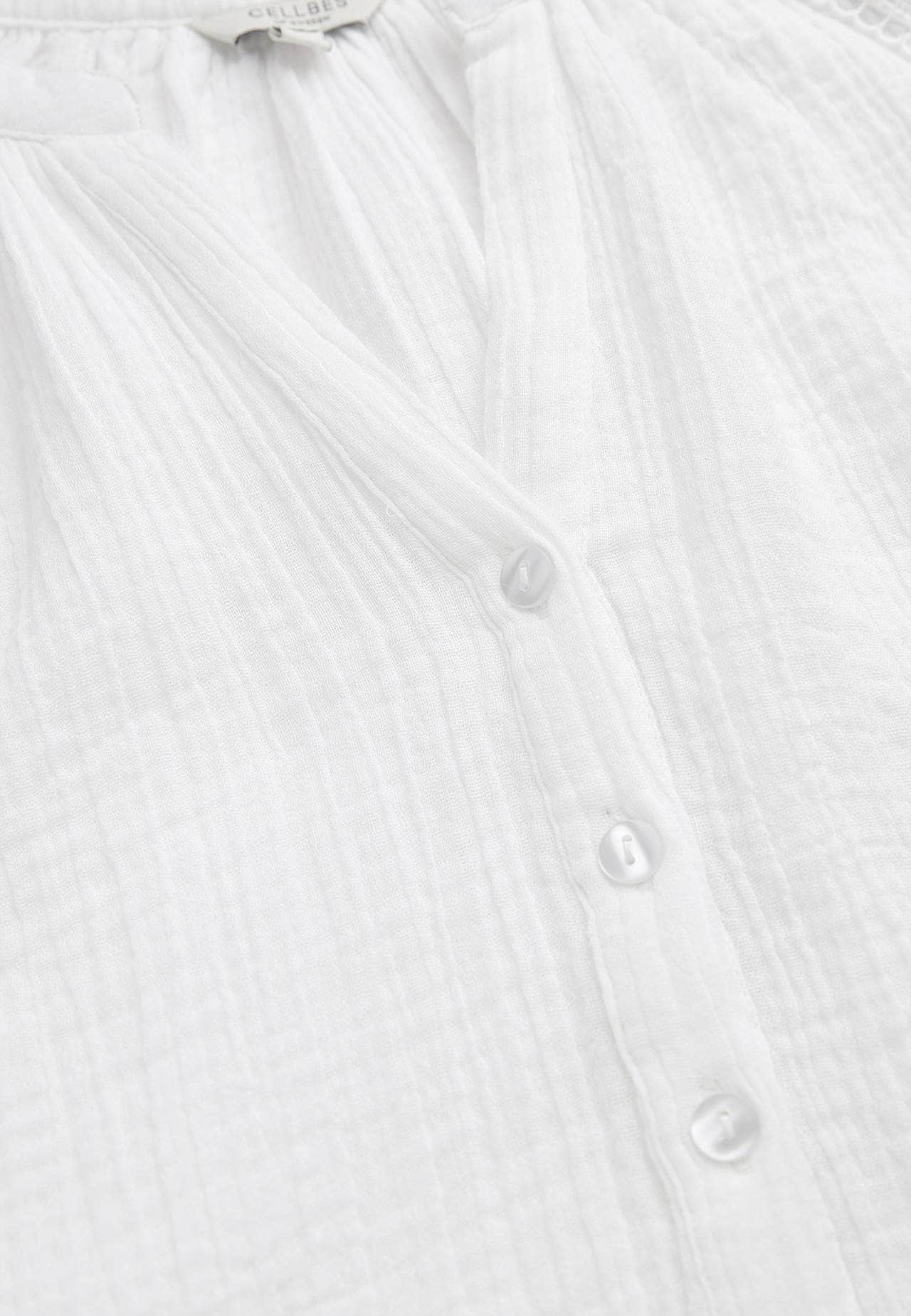 Luftig bluse med fine blondekanter på ermene. Vevet materiale i nydelig bomullsmusselin med struktur. Løs passform. Rund hals med lite v-hals snitt. Knapper foran. 3/4-lange, vide raglanermer med puff og strikk i ermeslutten. Detaljert sirlig blondebånd ved raglansøm og nedre del av erme. Avrundet fald. Rygglengden følger s... Les mer