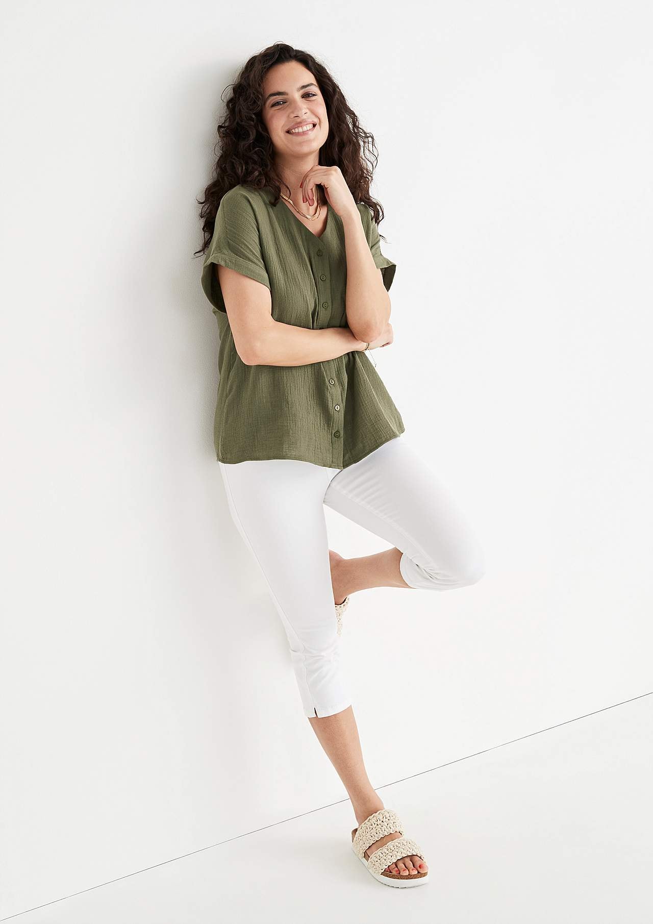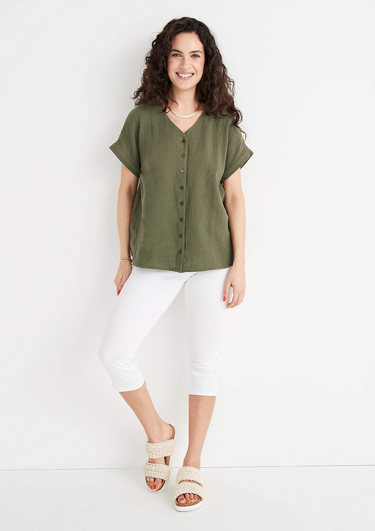 V-halset bluse med korte ermer. Herlig luftig bomullsmusselin med to lag med vaflet tekstur. Gjennomkneppet modell. Casual passform. Lengden følger størrelsen, ca. 66-81 cm fra skulderen.